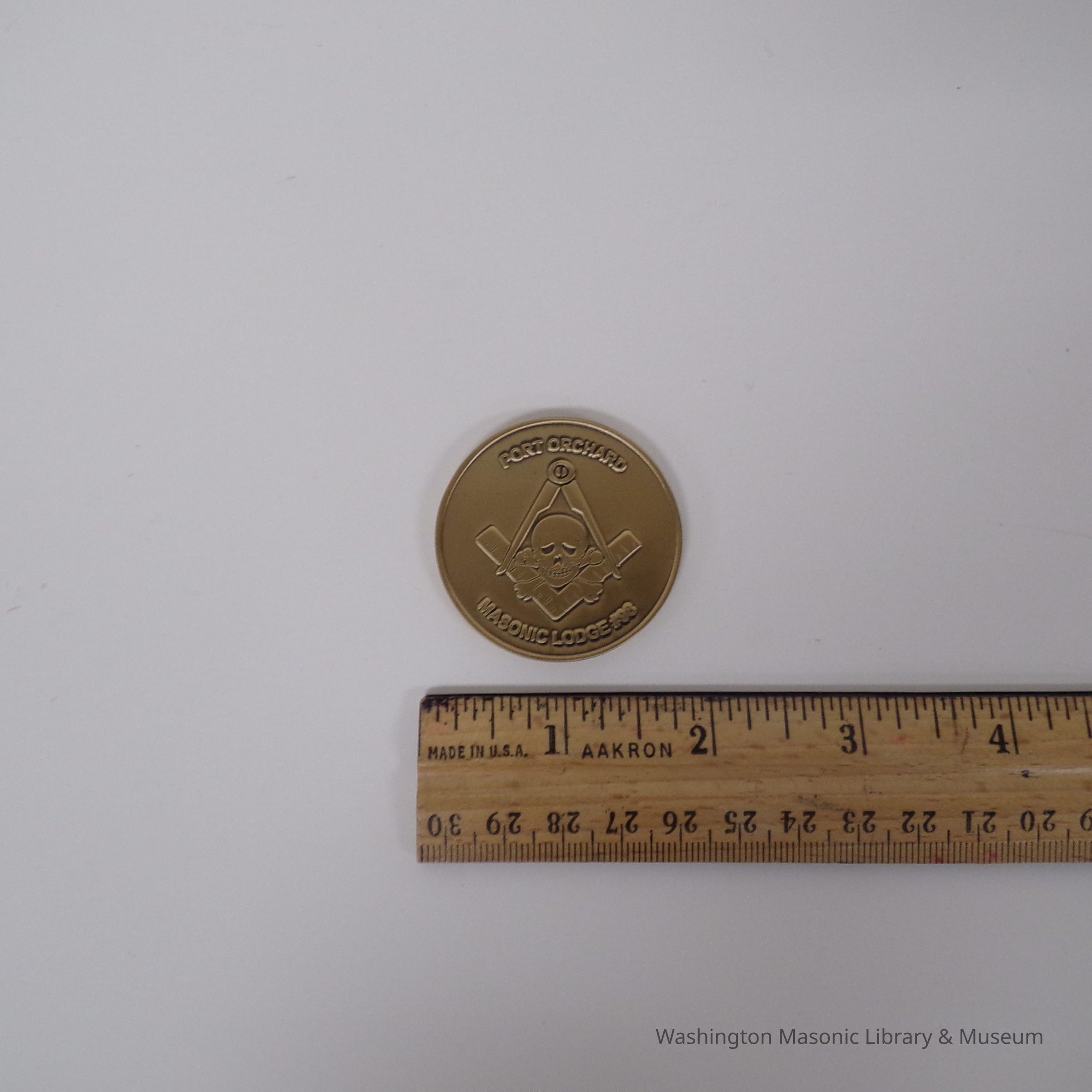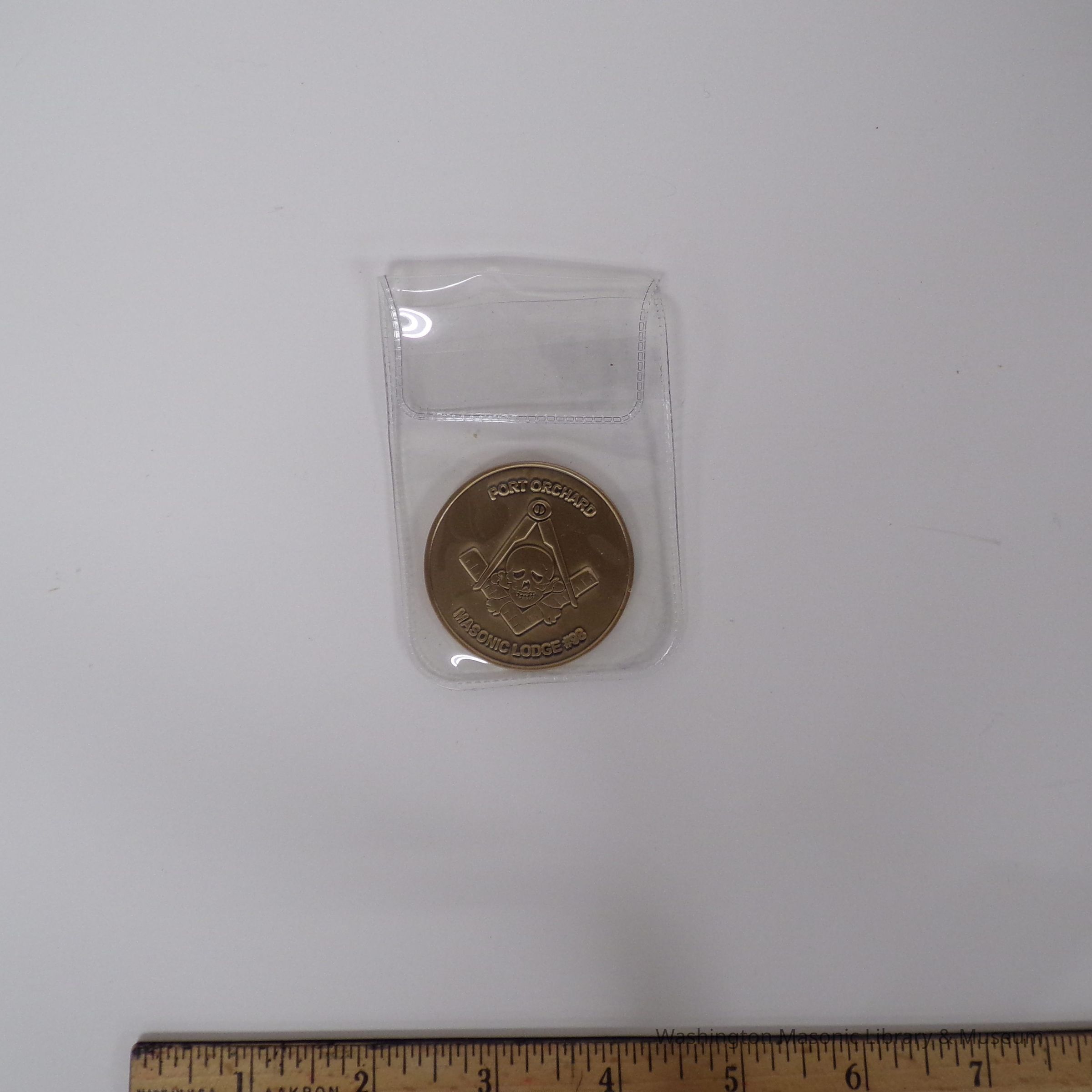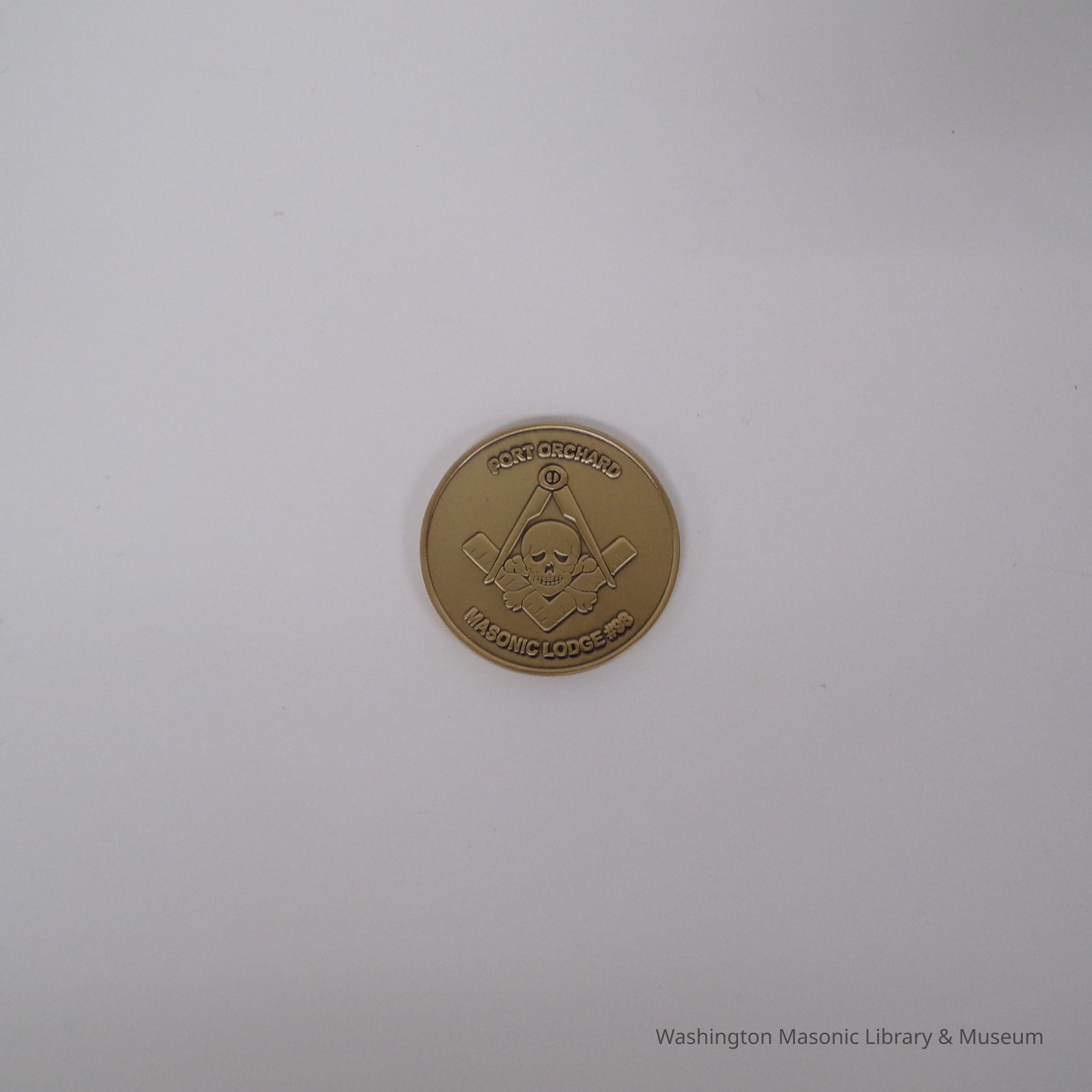 On one side: depicts Skull and cross bones inside a square and compass. "Port Orchard Masonic Lodge No. 98"