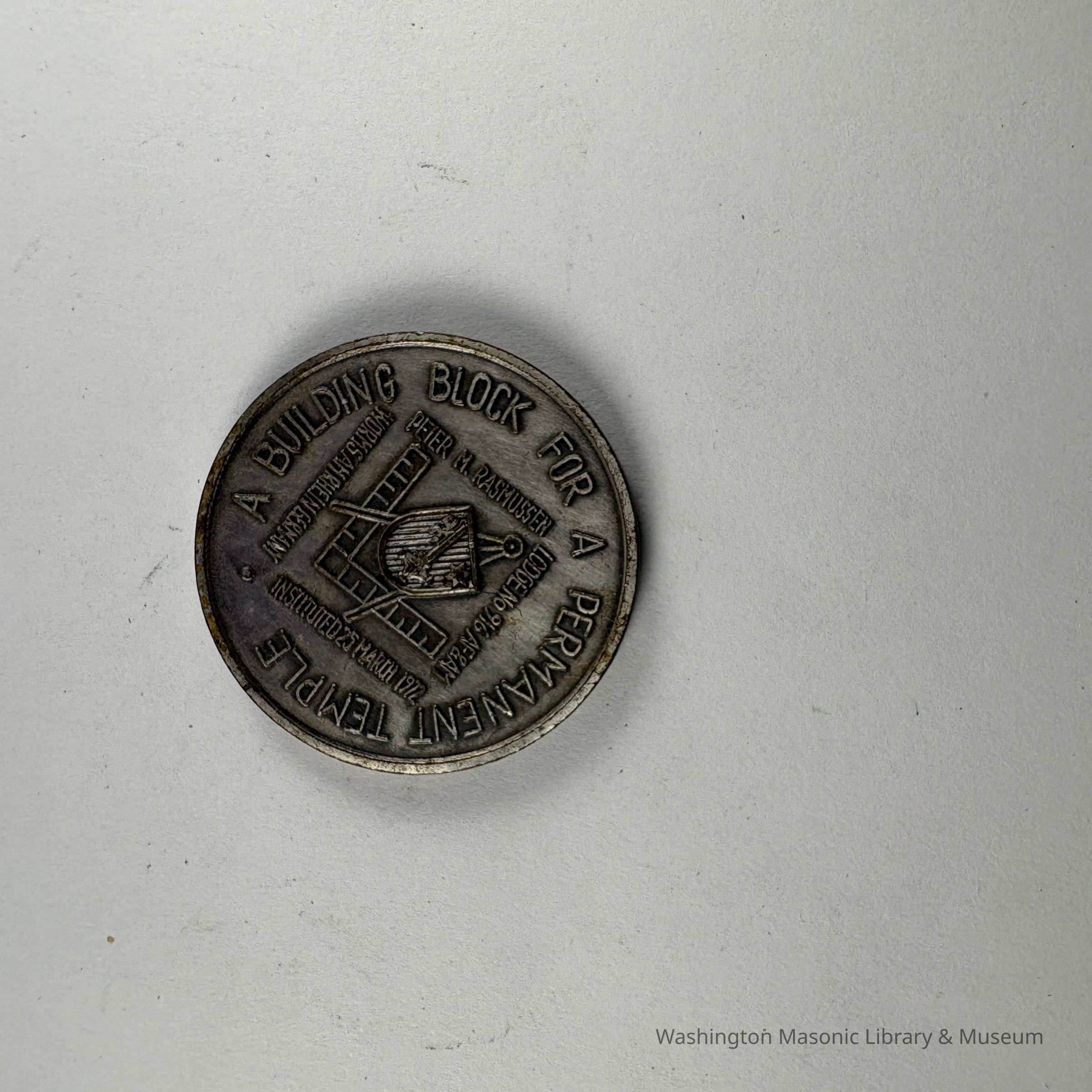 On Back Side: Square and Compass with seal in front. "A Building Block for a Permanent Temple/Peter M. Rasmussen/Lodge No. 916 AF&AM/Wormsamrhein Germany/Instituted 25 March 1972"Collection