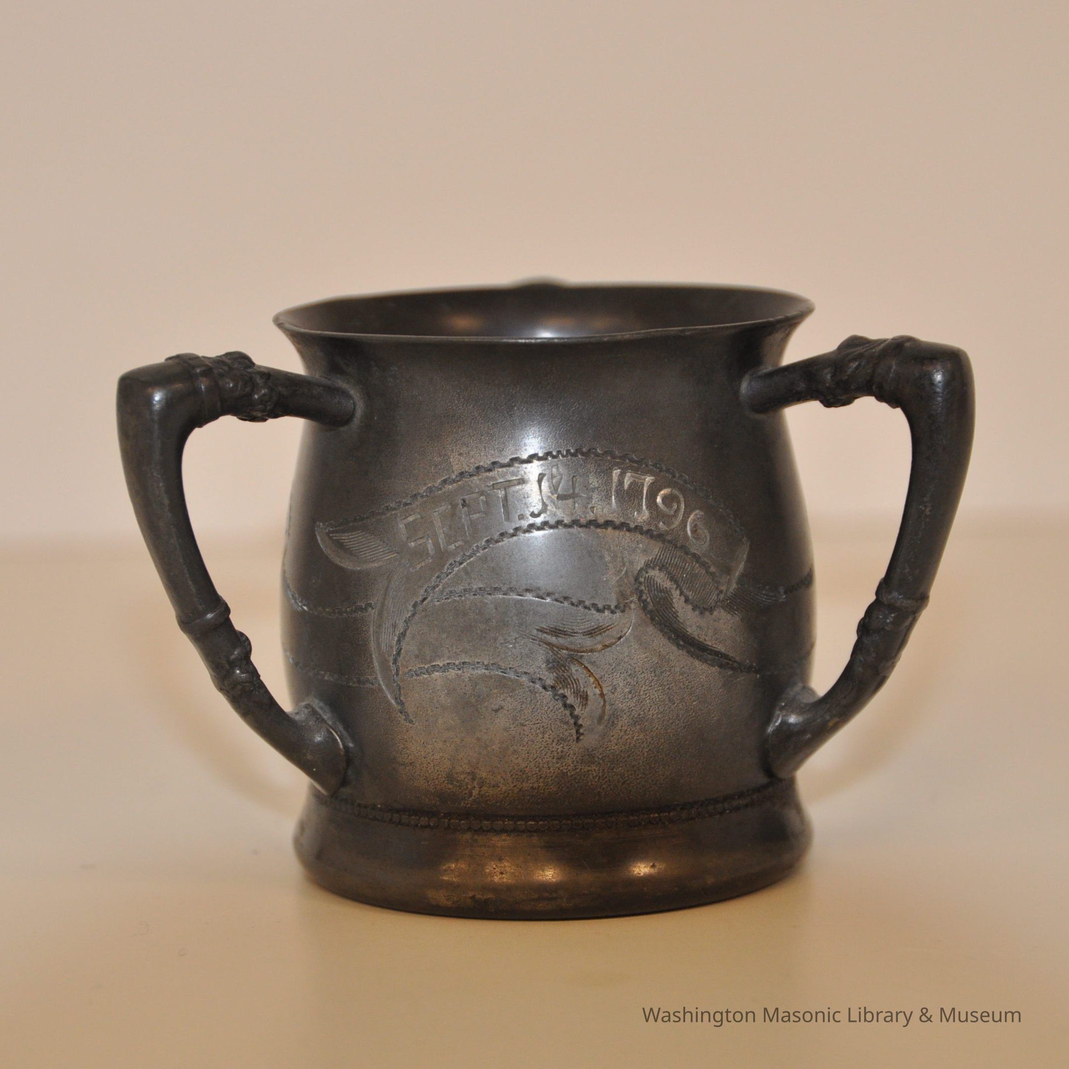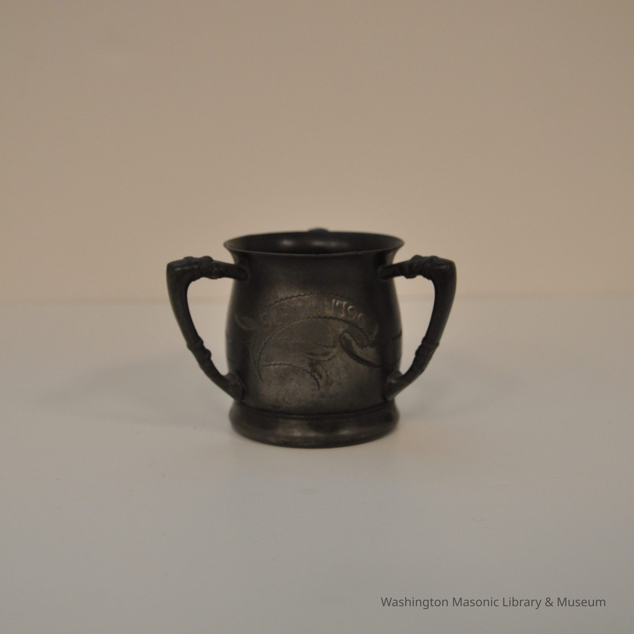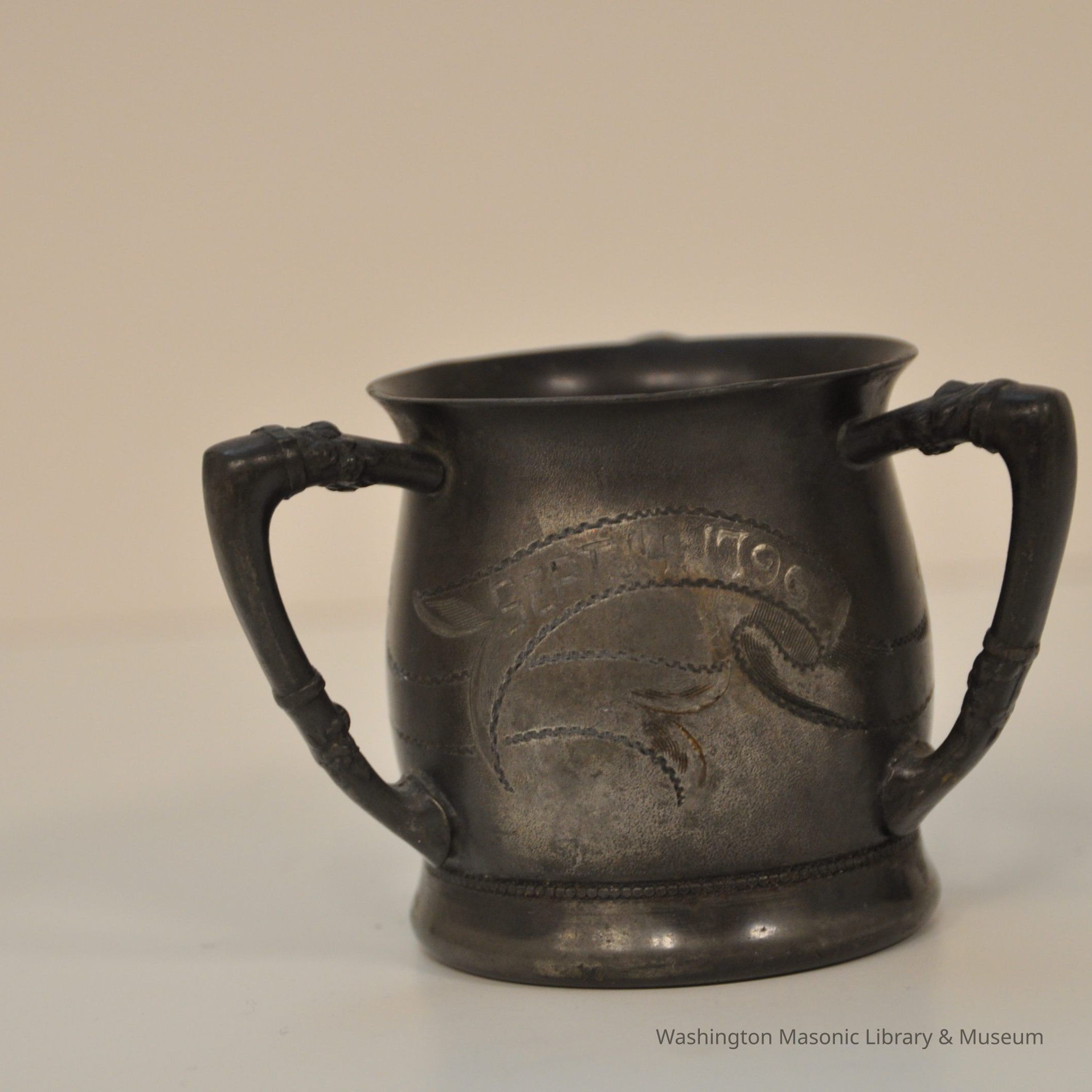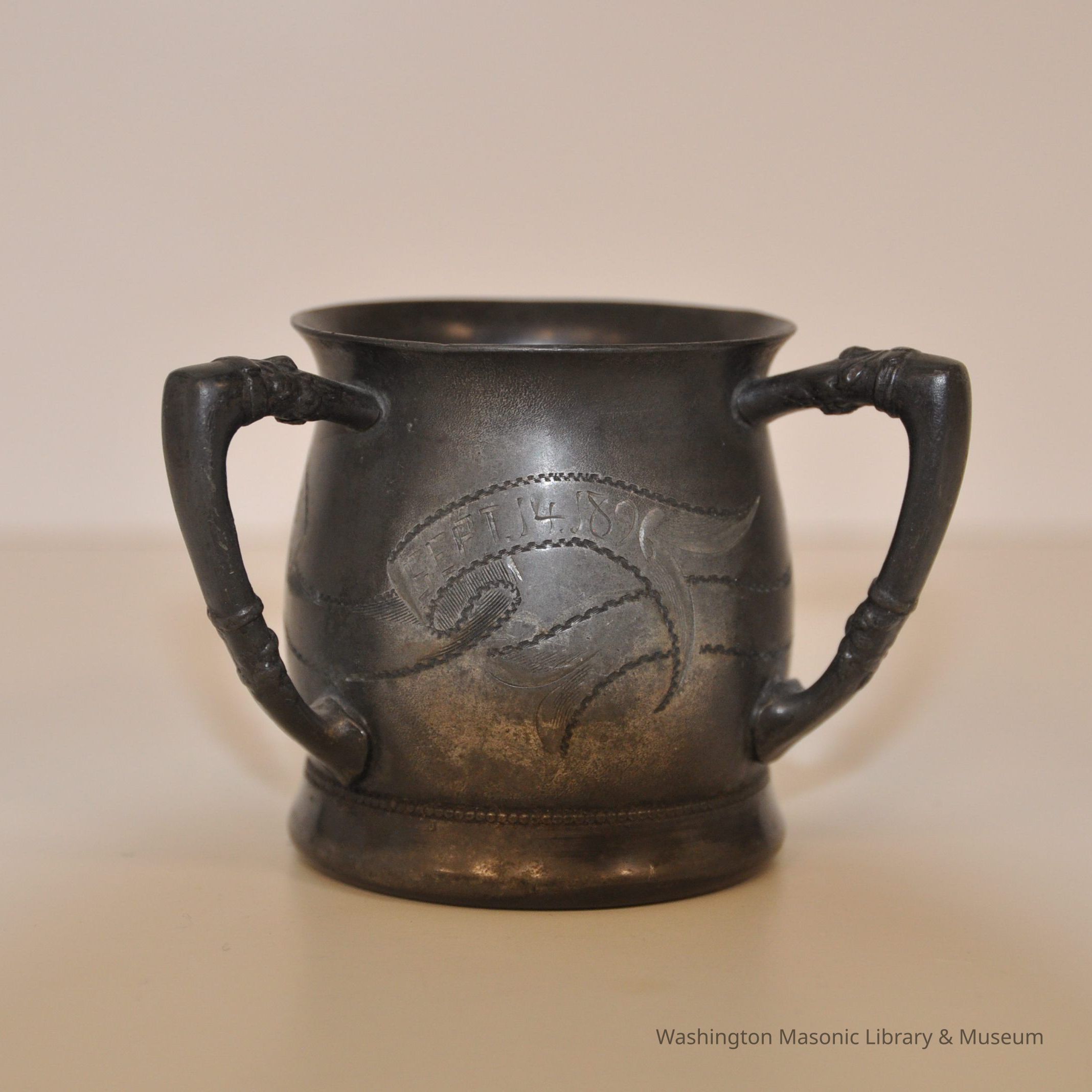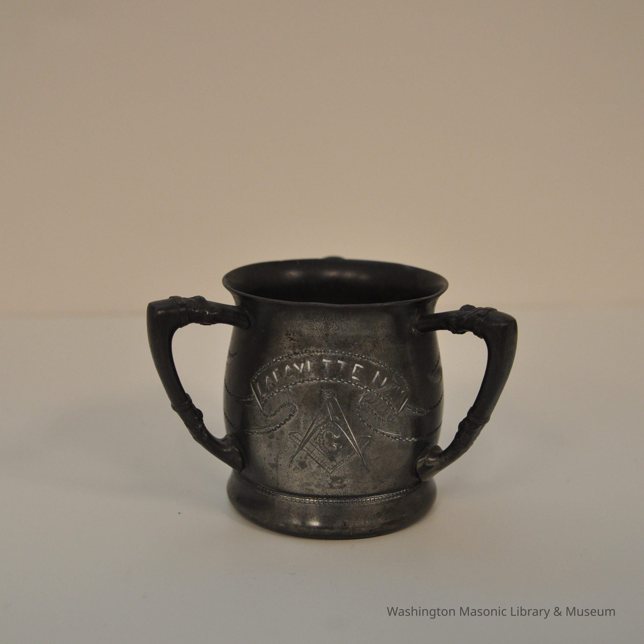 Cup: commemorative silver cup, three handles. Depicts Square and Compass Text on all sides reads: "Lafayette/ September 14 1796/September 14 1896"Collection