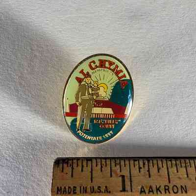 Pin: Shriner. Shriner holding child. building and sun rays in the background. "Al Chymia/ R.E. "Billy" Conn/ Potentate 1999" Donated by PGM James O. Wood (1999)Collection