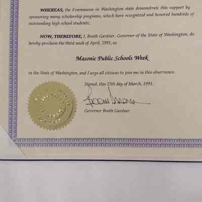 Proclamation: Governor Booth Gardner of the State of Washington proclaims the third week of April 1991 as Masonic Public School's Week.