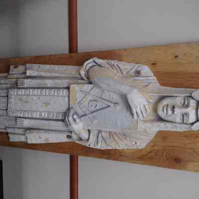 Large figurine: Mason painted white holding book with the compass symbol on it, nailed to plyboard.Collection