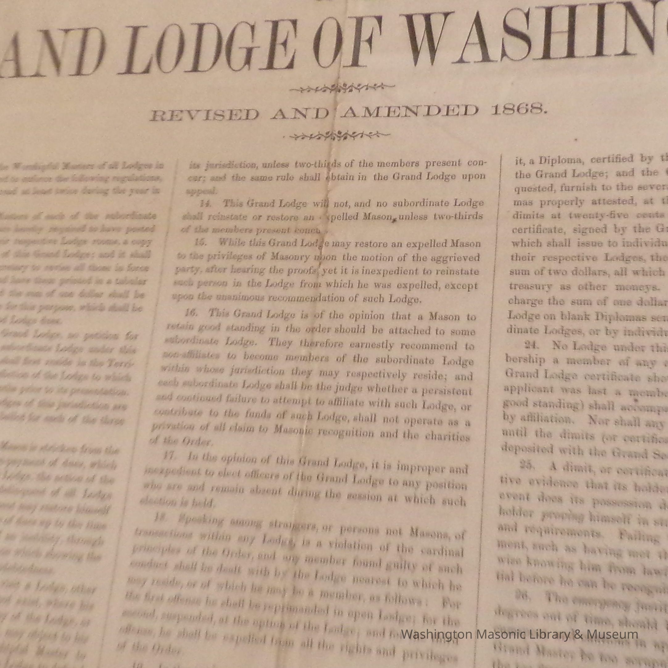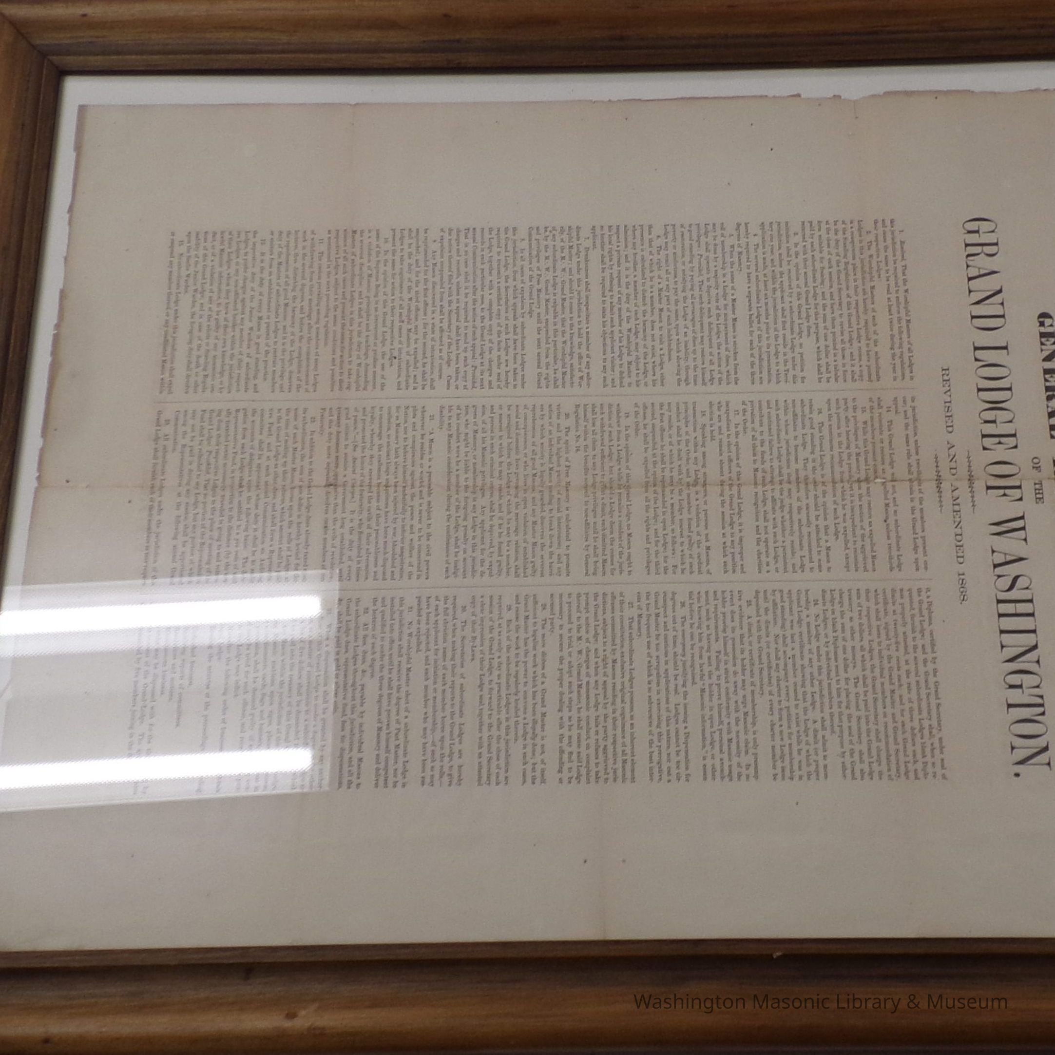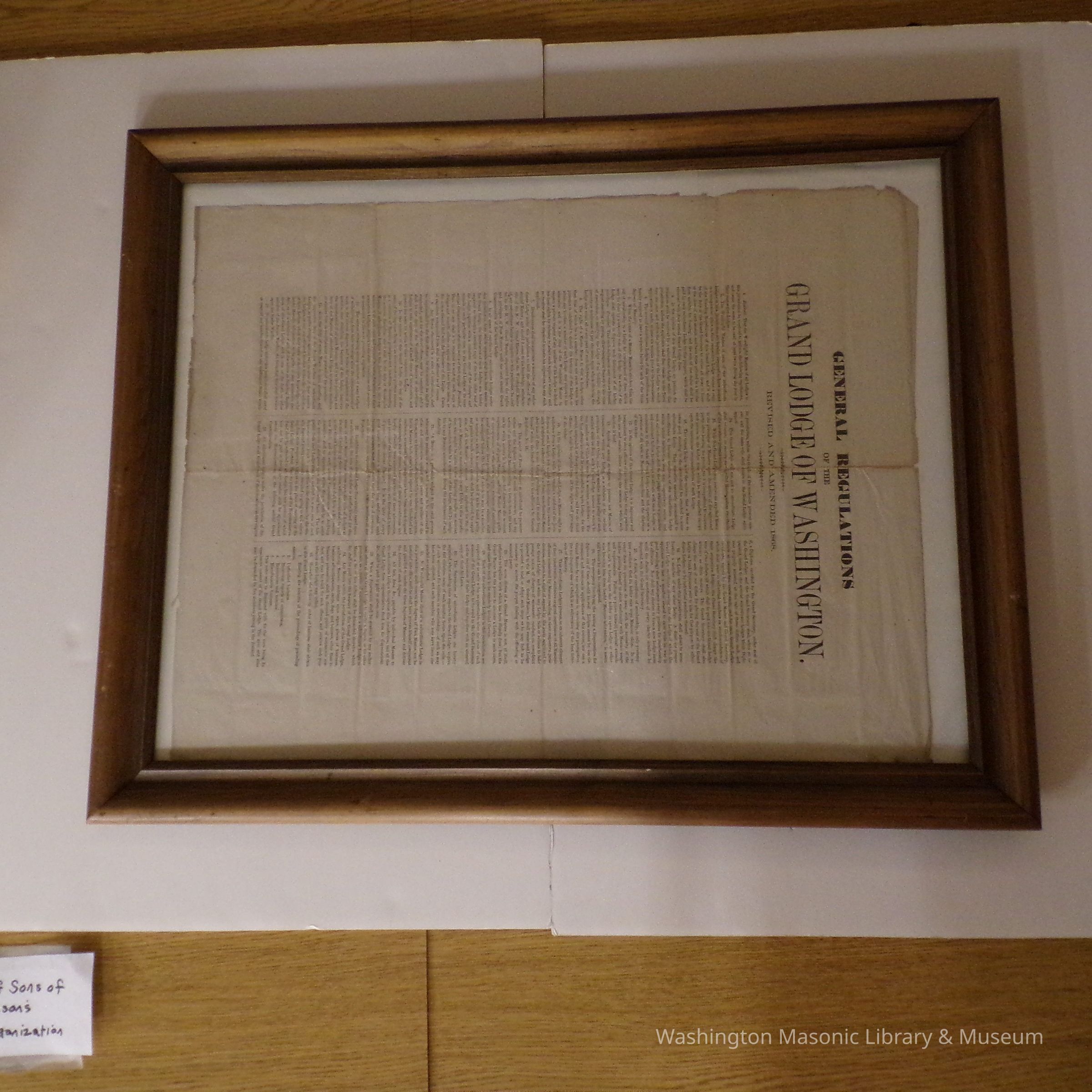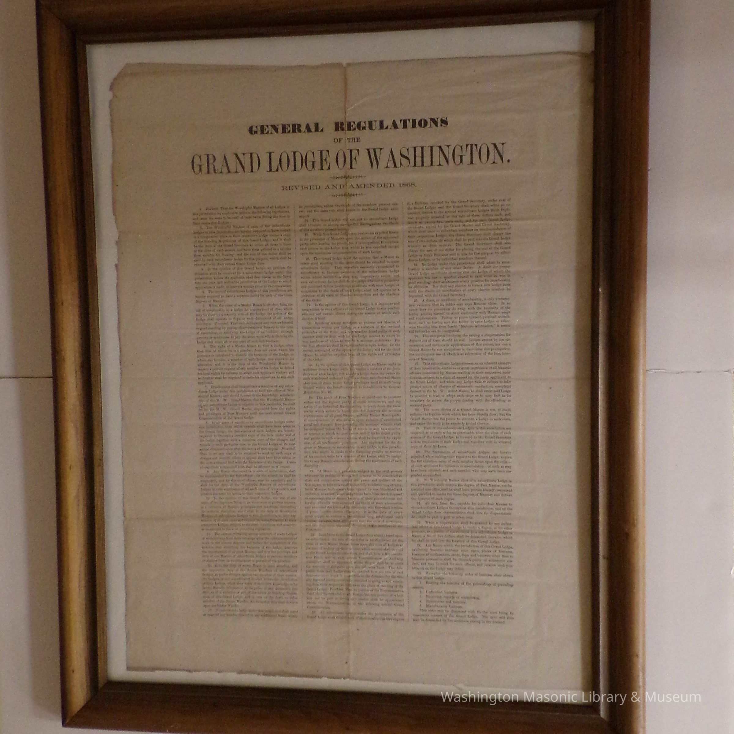 Document: Framed. "General Regulations of the Grand Lodge of Washington, Revised and Amended 1868"Entry/Object ID