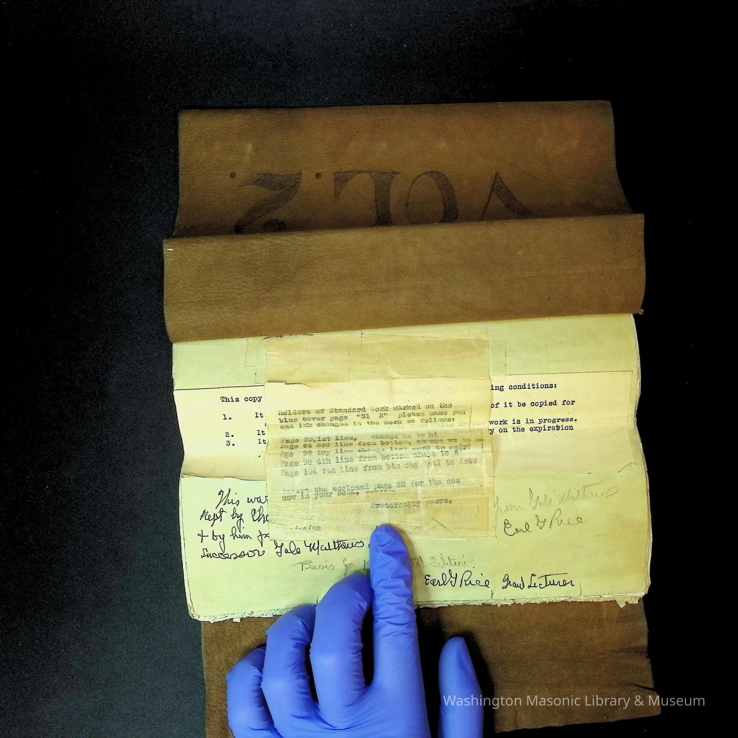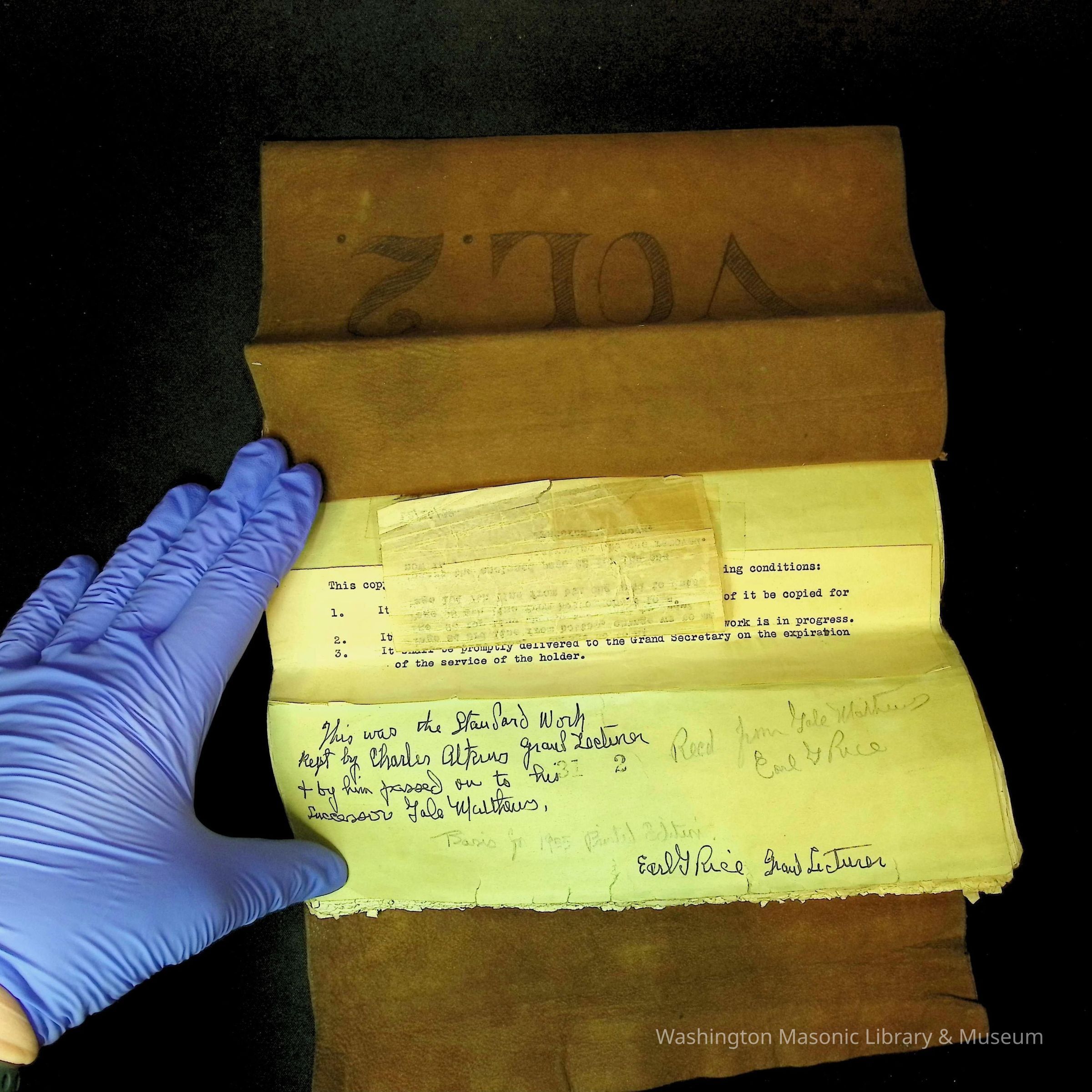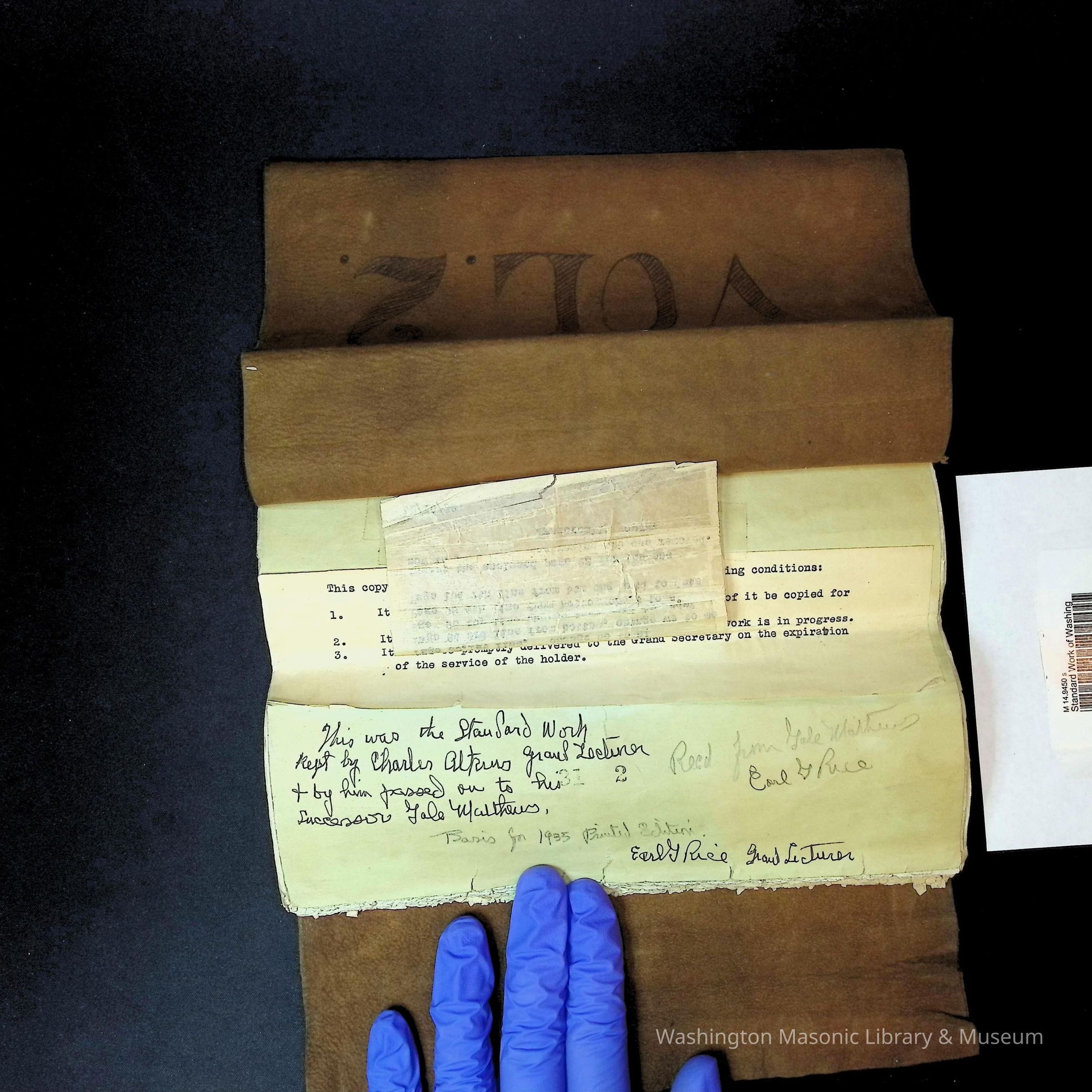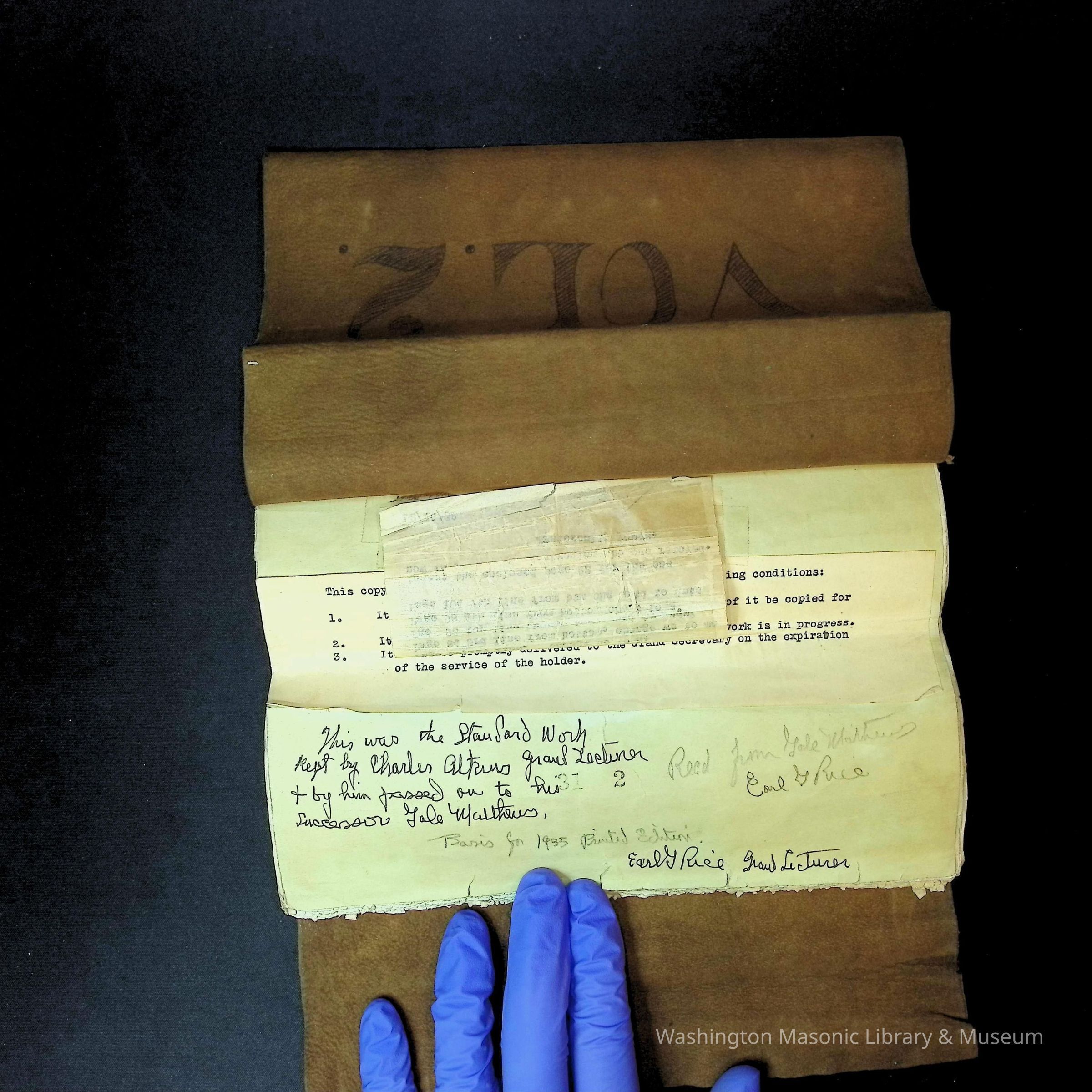 Handwritten note says: "This was the standard work kept by Charles Atkins Grand Lecturer and by him passed on to his successor Gale Mthers....Basis for 1935 Printed Edition. Earl G. Rice, Grand Lecturer."Dimensions