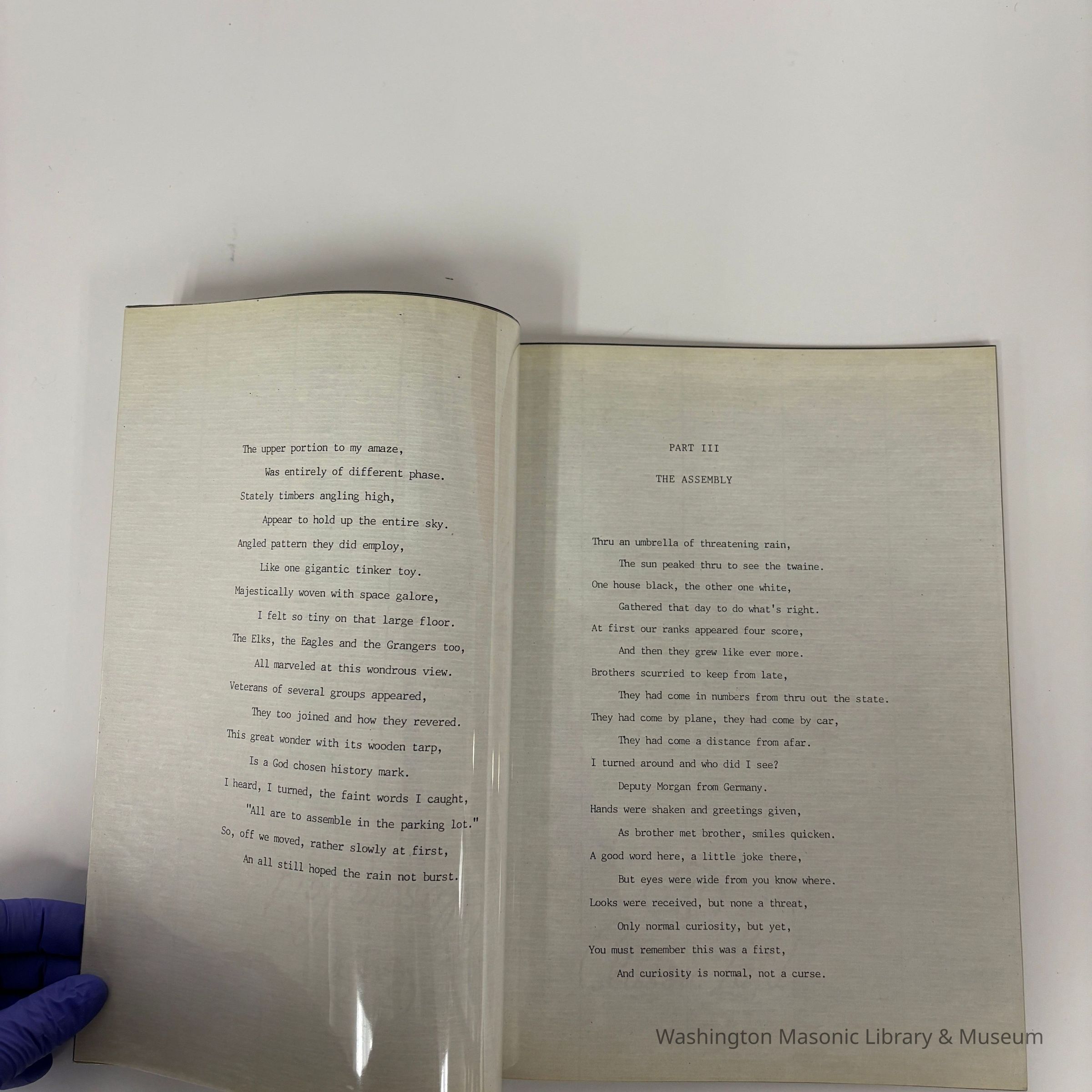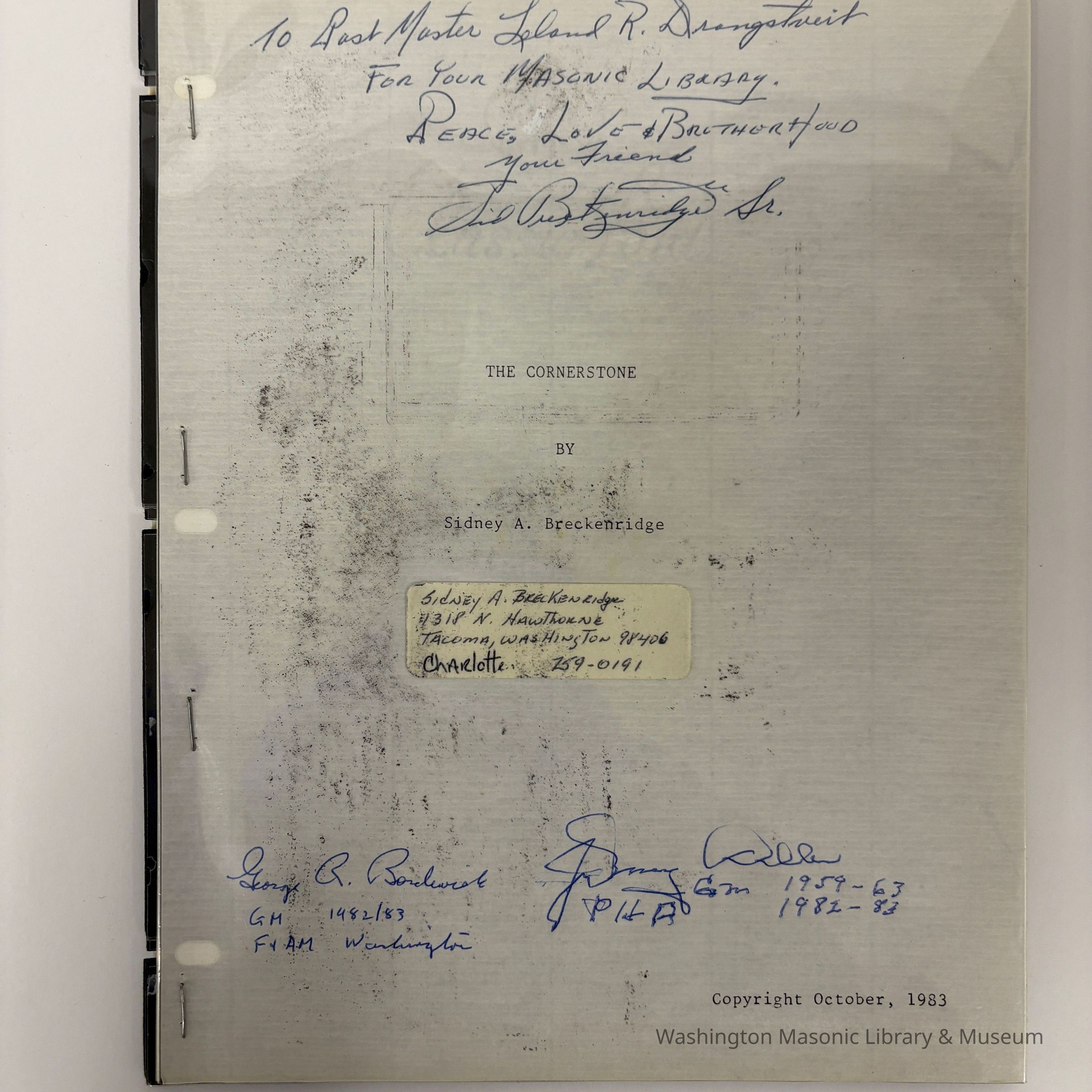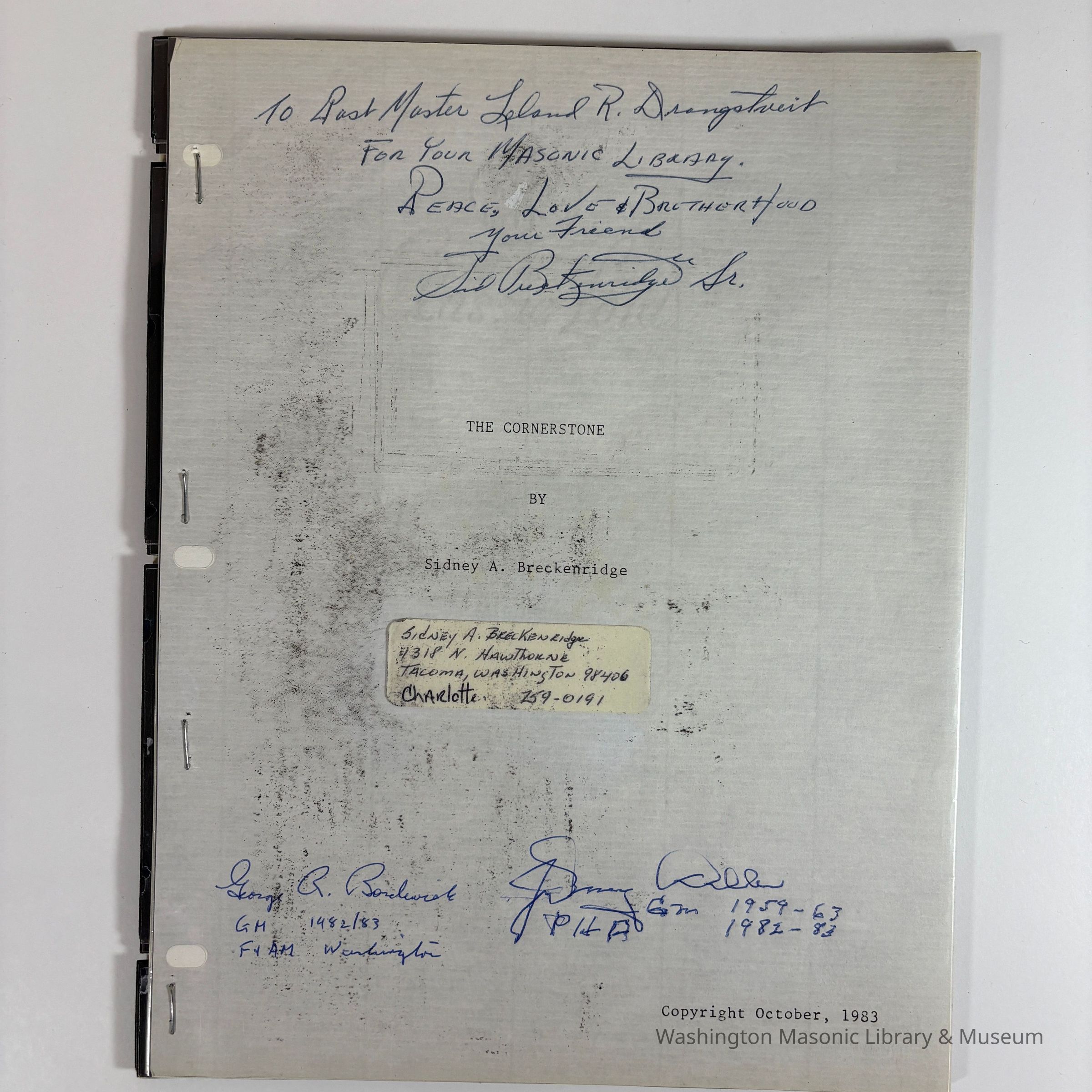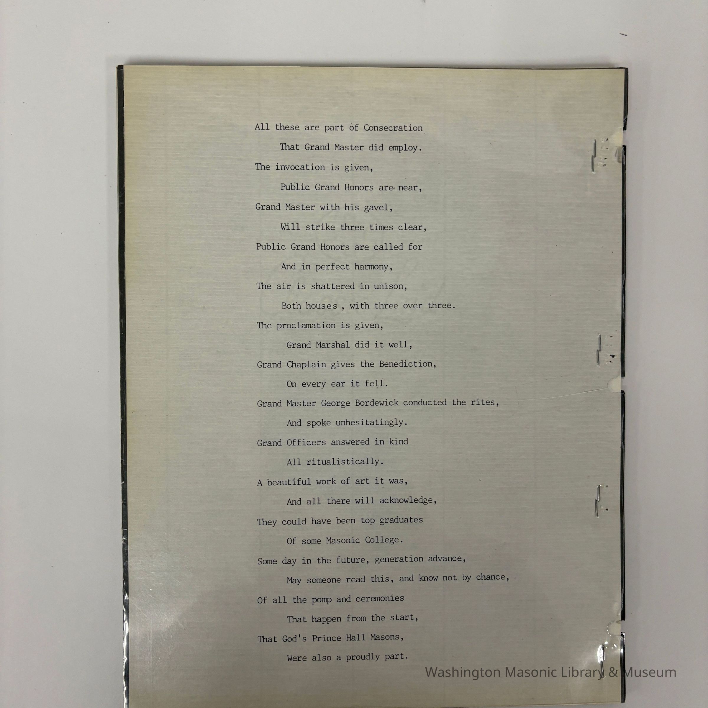 Document: Stapled together and bound in plastic. Poem and forward. Detailing the dedication of the cornerstone at the Tacoma Dome by Prince Hall Grand Lodge of Washington and the MW Grand Lodge of Washington. Written by Sidney A. Breckenridge (of Prince Hall) and signed by PGM George Bordewick and PGM Sidney Allen (Prince Hall). (1983)