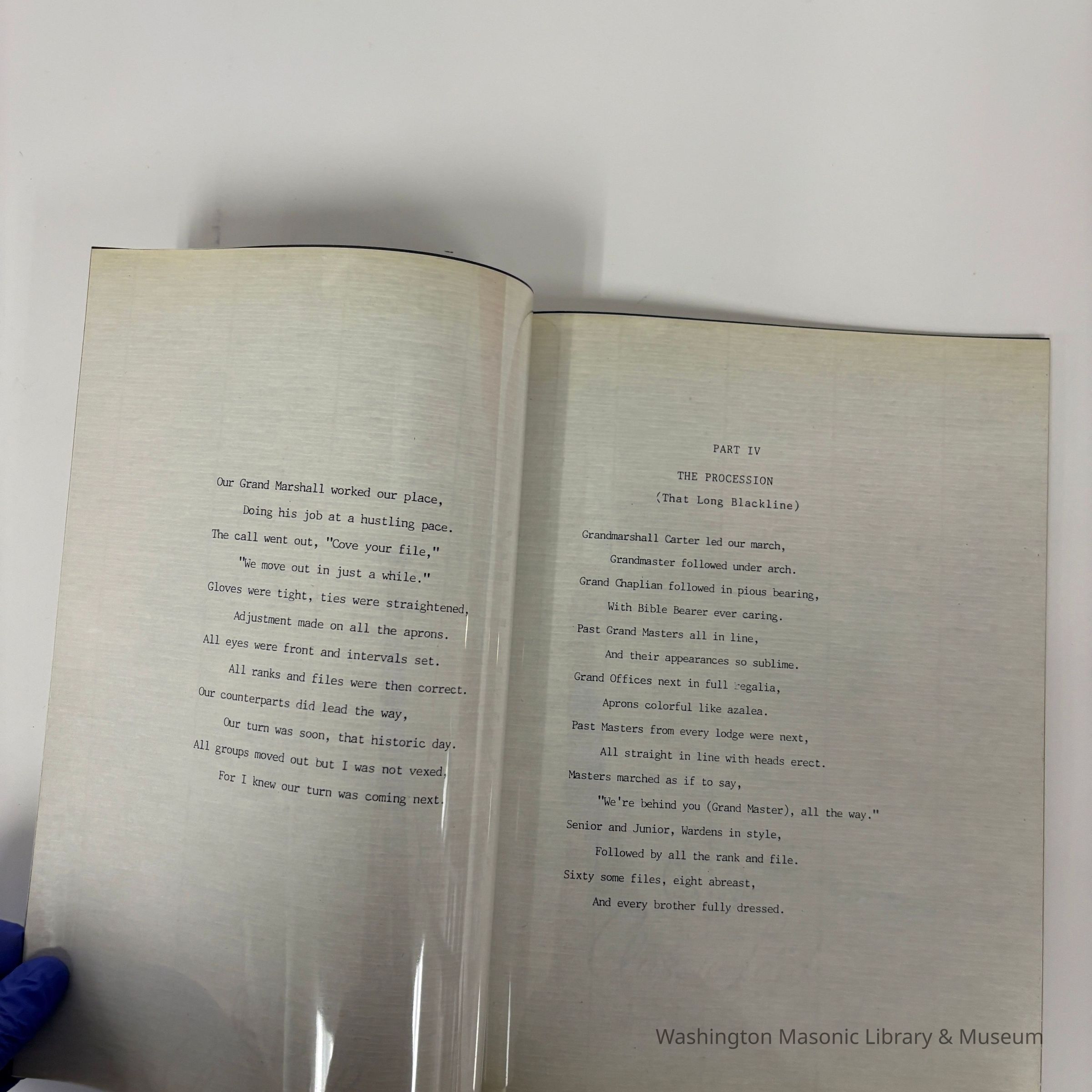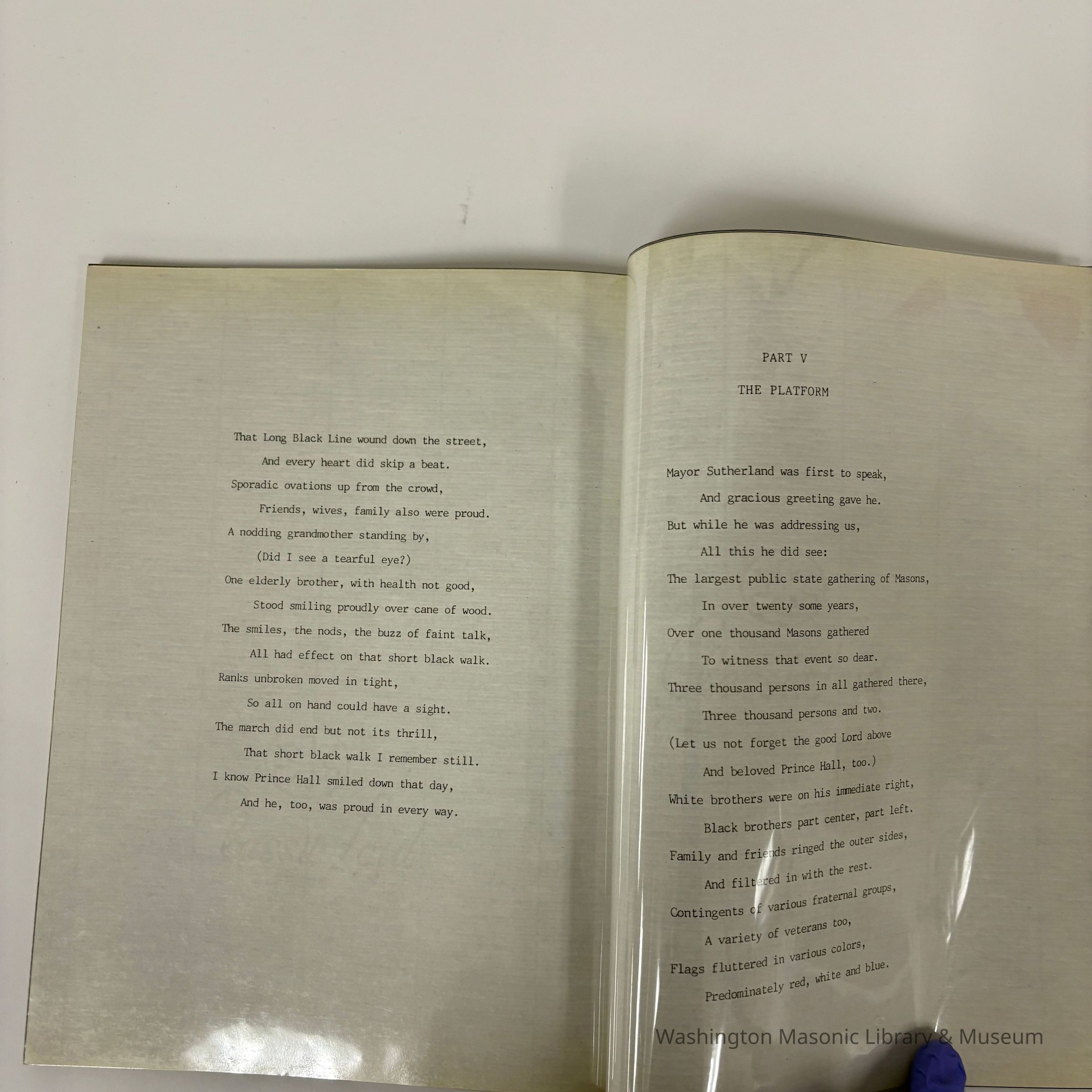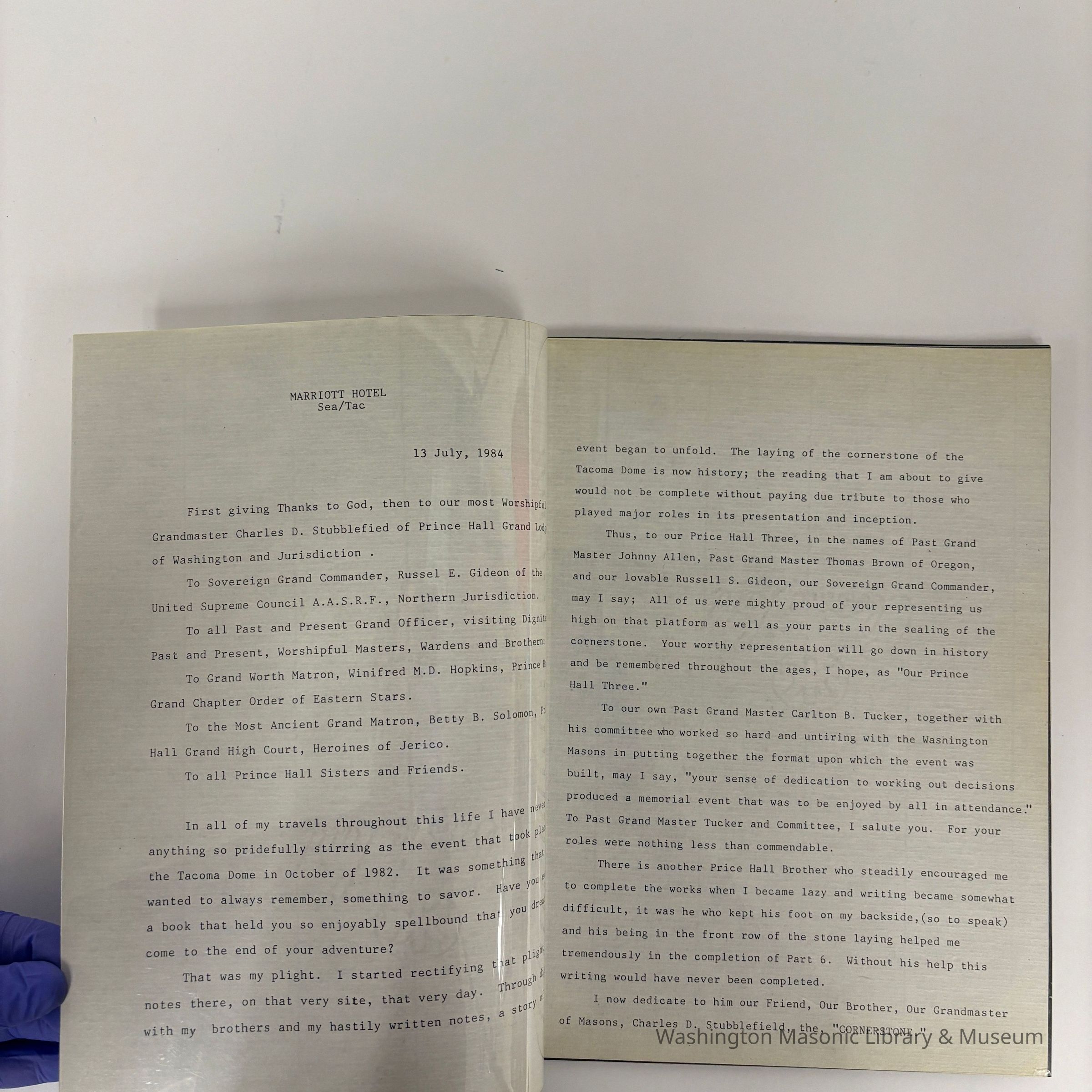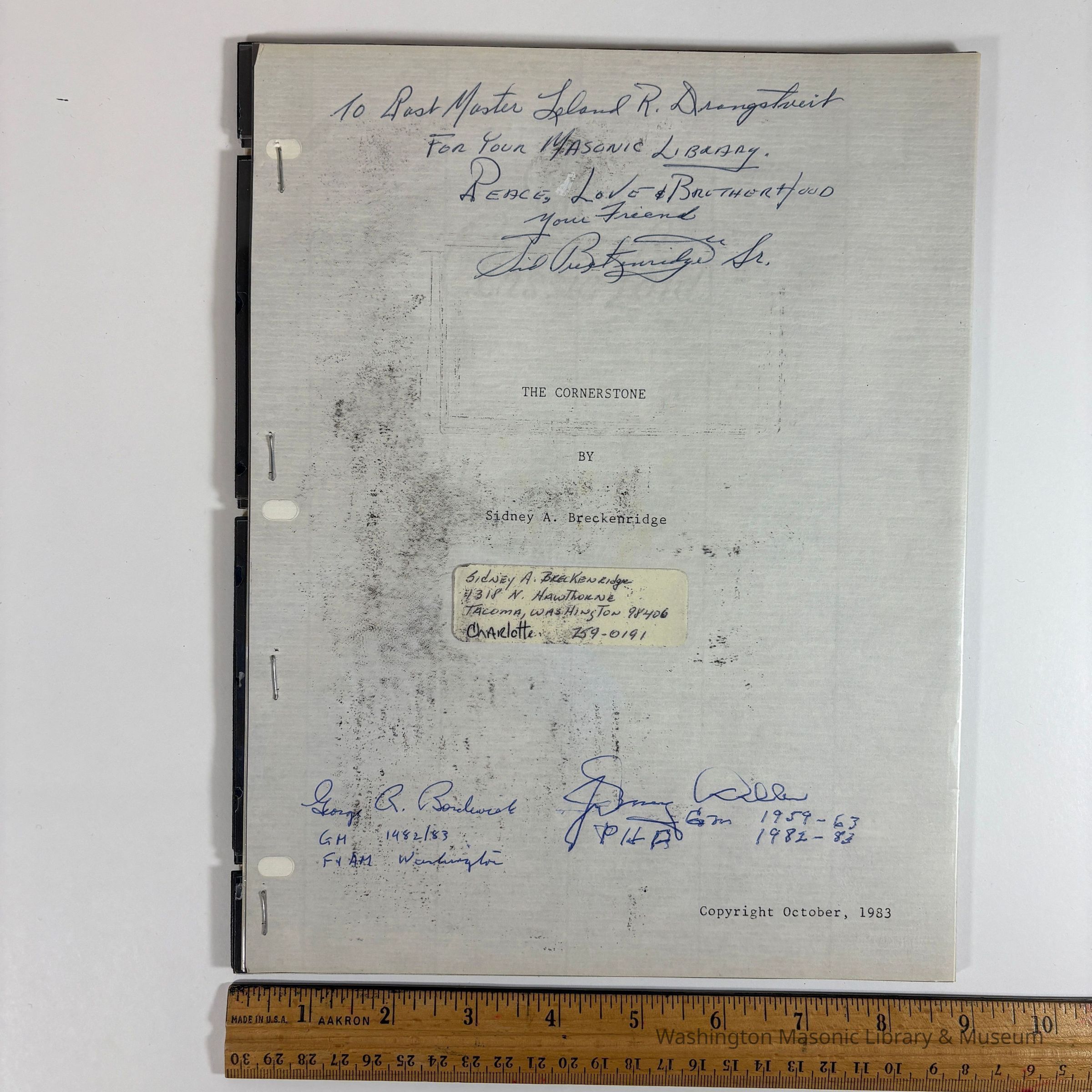 Document: Stapled together and bound in plastic. Poem and forward. Detailing the dedication of the cornerstone at the Tacoma Dome by Prince Hall Grand Lodge of Washington and the MW Grand Lodge of Washington. Written by Sidney A. Breckenridge (of Prince Hall) and signed by PGM George Bordewick and PGM Sidney Allen (Prince Hall). (1983)