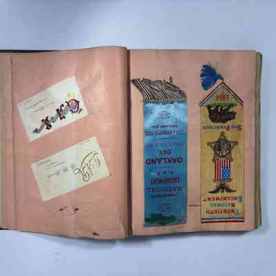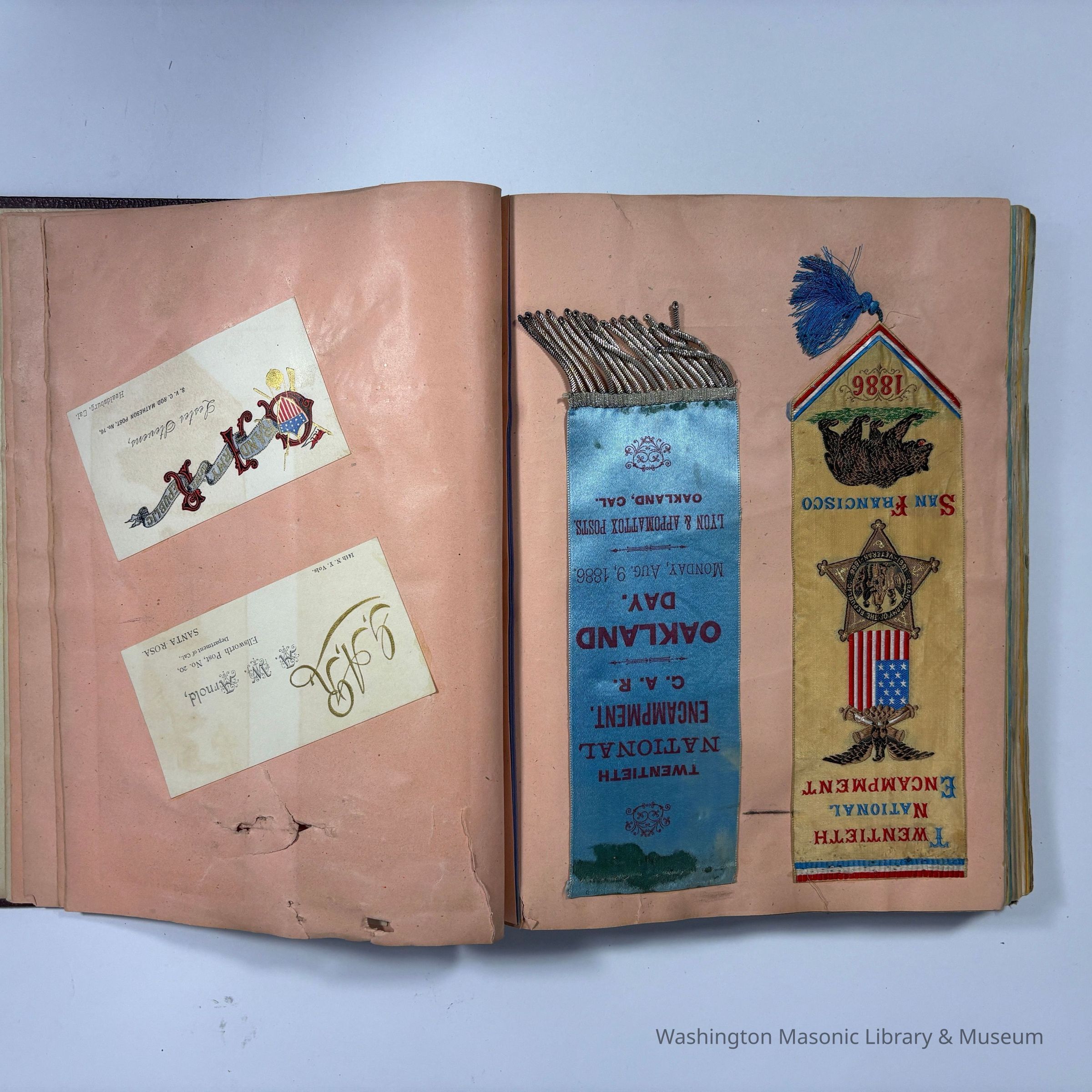 Many of the cards and ribbons were collected at the 22nd Triennial Conclave in San Francisco (1883). Then, in 1886, the scrapbook was reused to collect ephemera and ribbons from the Native Sons of the Golden West (N.S. G. W.)