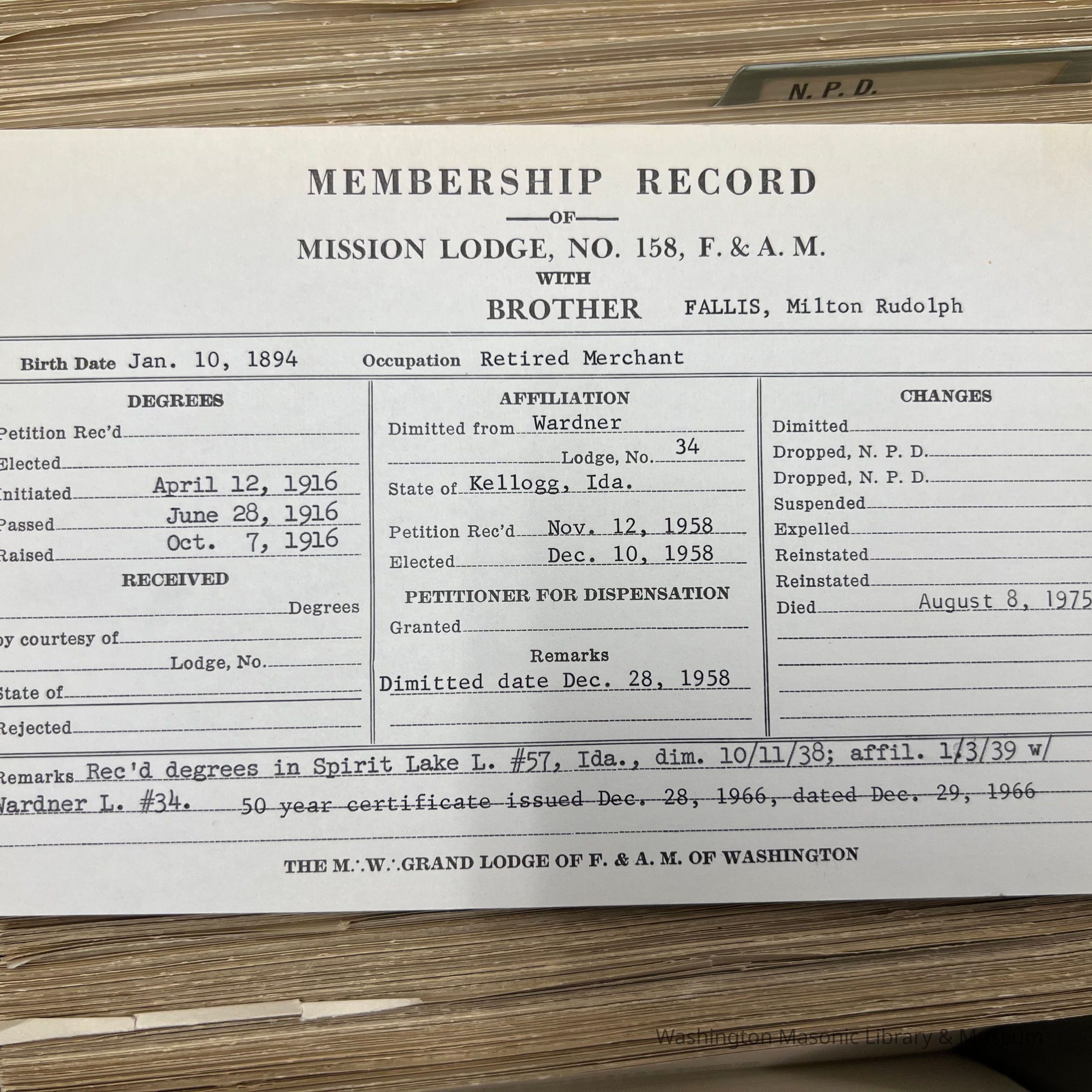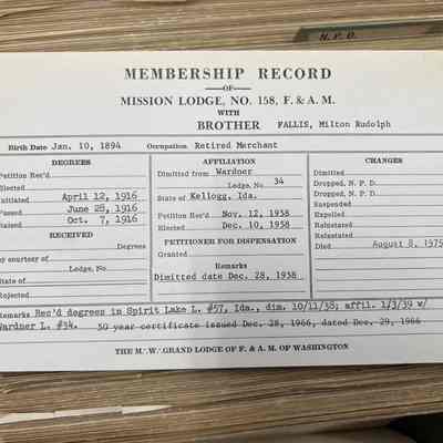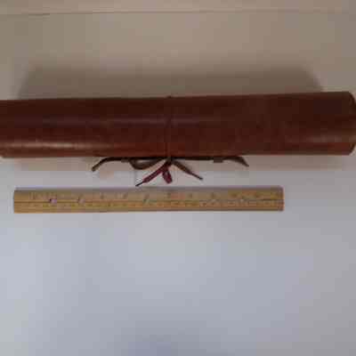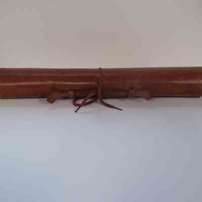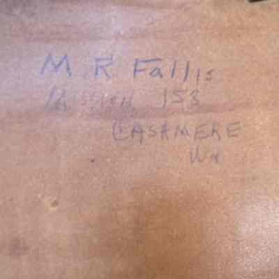 Empty leather apron case. Inside is written: "M.R. Fallis, Mission 158 Cashmere, WA"