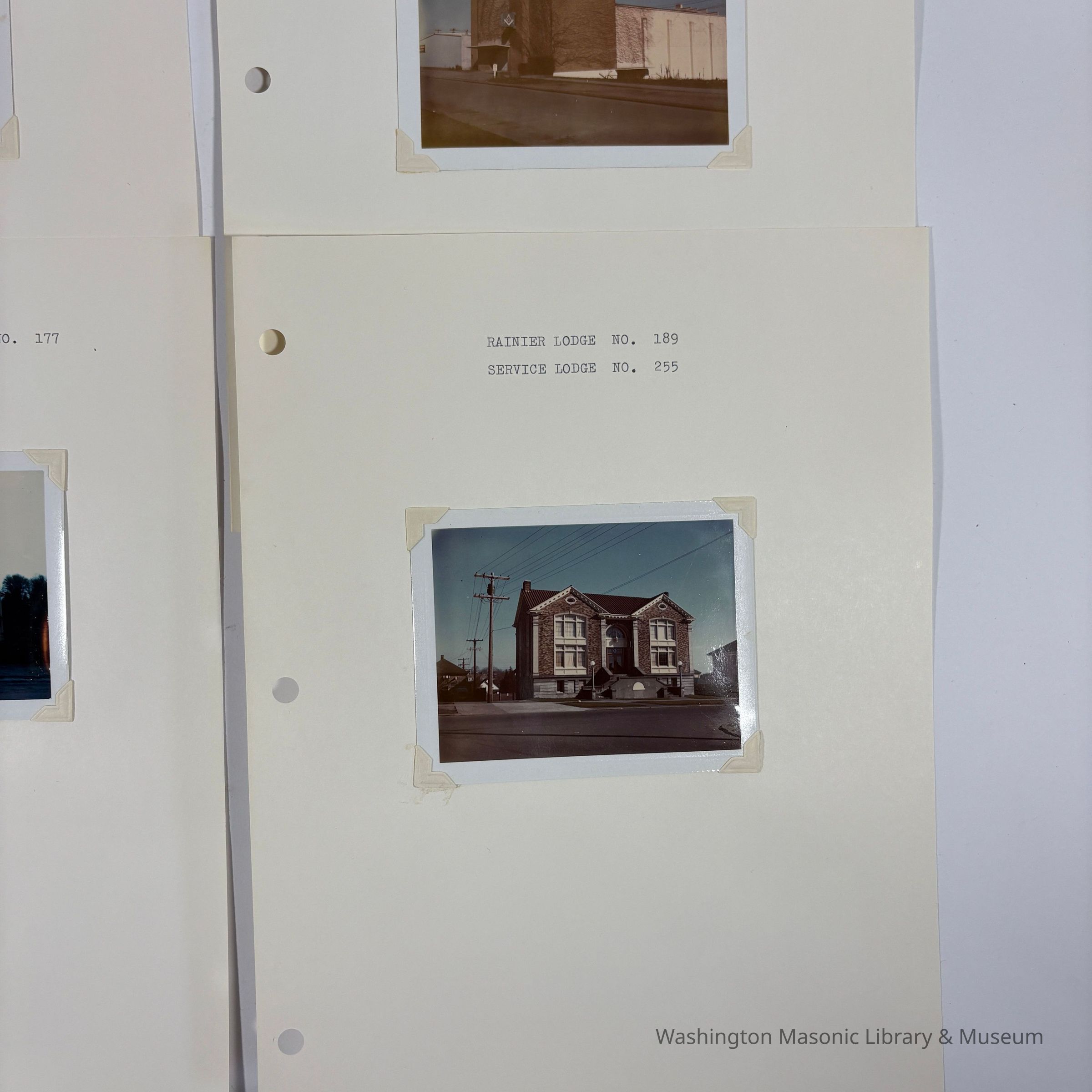 Eight Photographs: Attached to paper. Of the exteriors of Lodge buildings throughout Washington's jurisdiction. (c. 1970s)