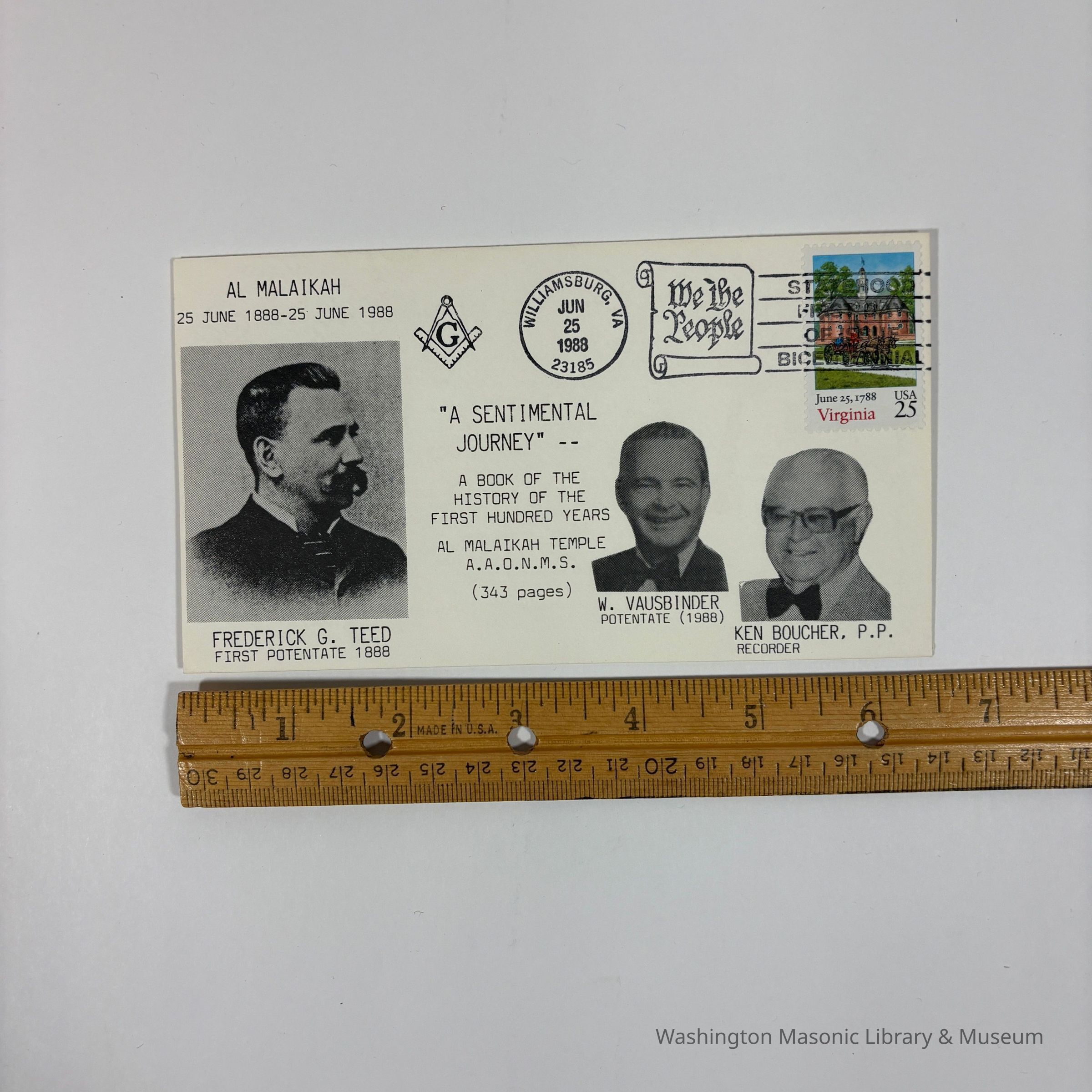 Envelope and Insert: "A Sentimental Journey." Themed Envelope.Created for centennial of Al Malaikah Shrine formation in Lost Angeles, California (1888-1898). Displaying information on Al Malaikah Temple No.40 "First Day of Issue" February 22nd, 1989. Issued on the 257th Birthday of George Washington.Collection
