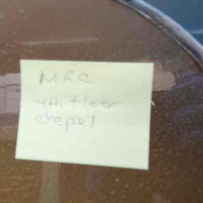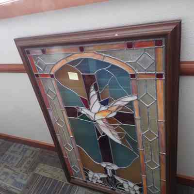 Stained Glass Window: shows bird and flowers. Sticky note on it says: " MRC Fourth Floor Chapel"