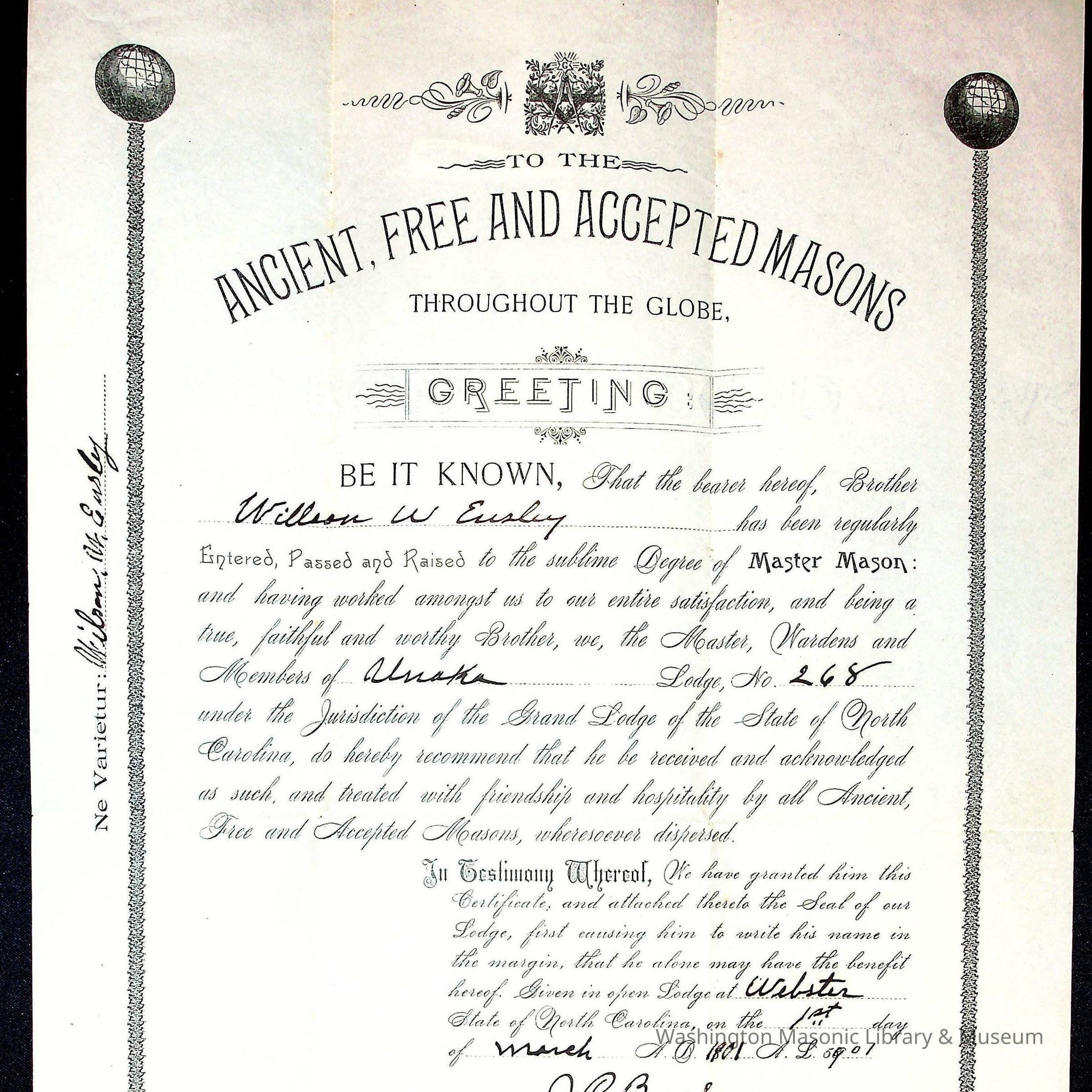 Certificate: William W. Eusleyds, Master Mason, Unaka Lodge No.268, Grand Lodge of North, Carolina, March 5, 1901Entry/Object ID