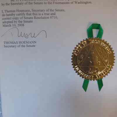 Senate Resolution: Washington State Senate Resolution honoring freemasons. signed by Thomas Hoemann, Secretary of the Senate, March 10, 2008. Senate Resolution 8710.