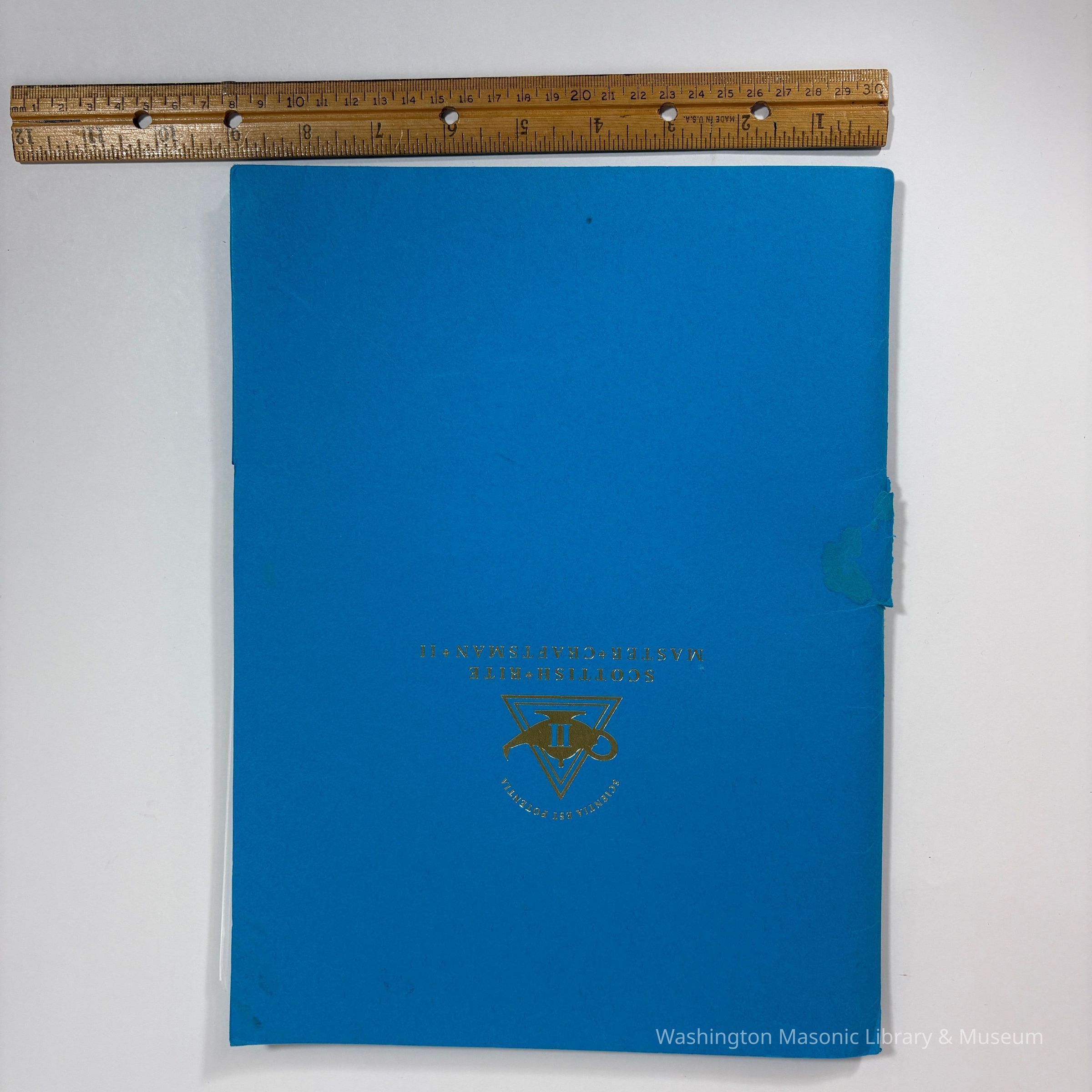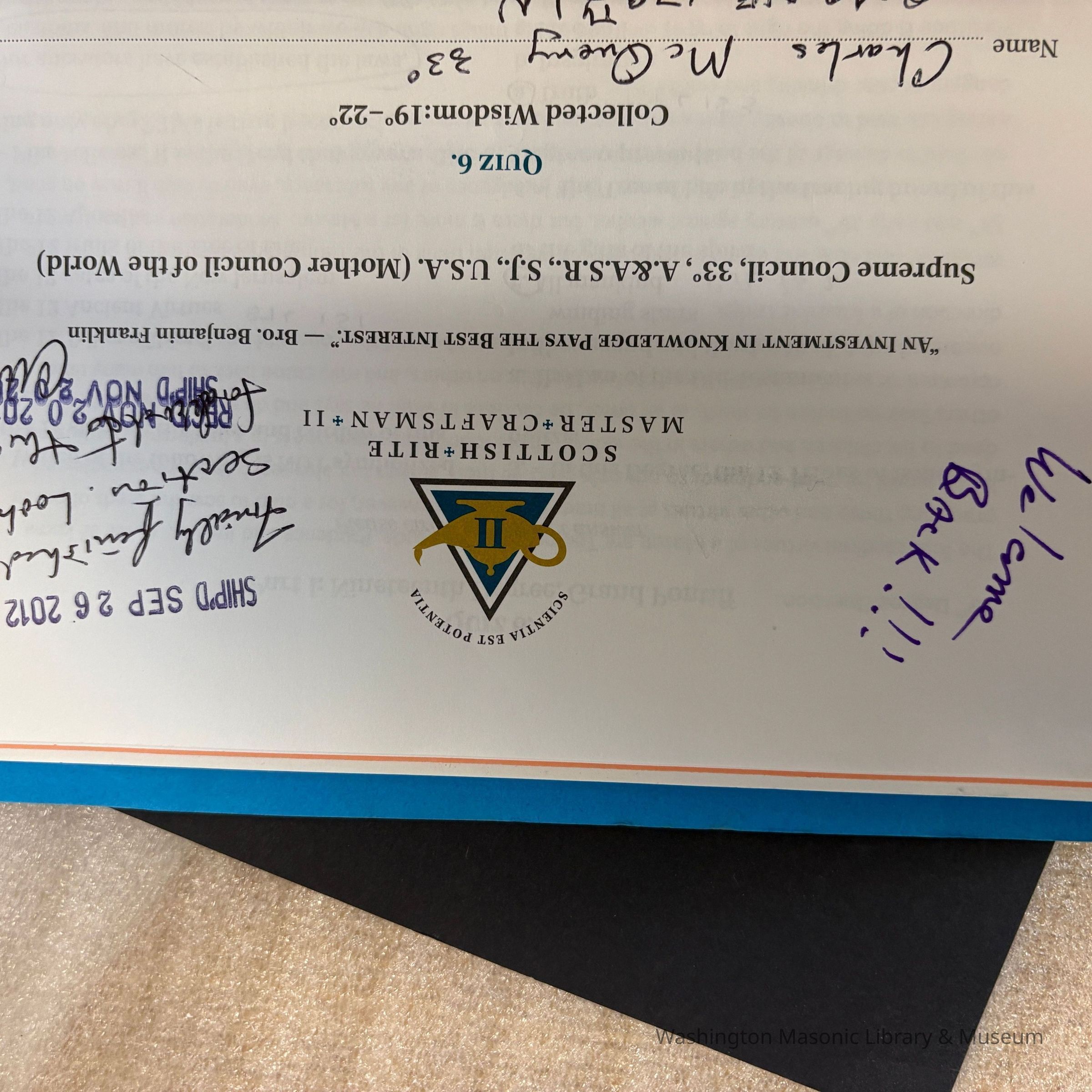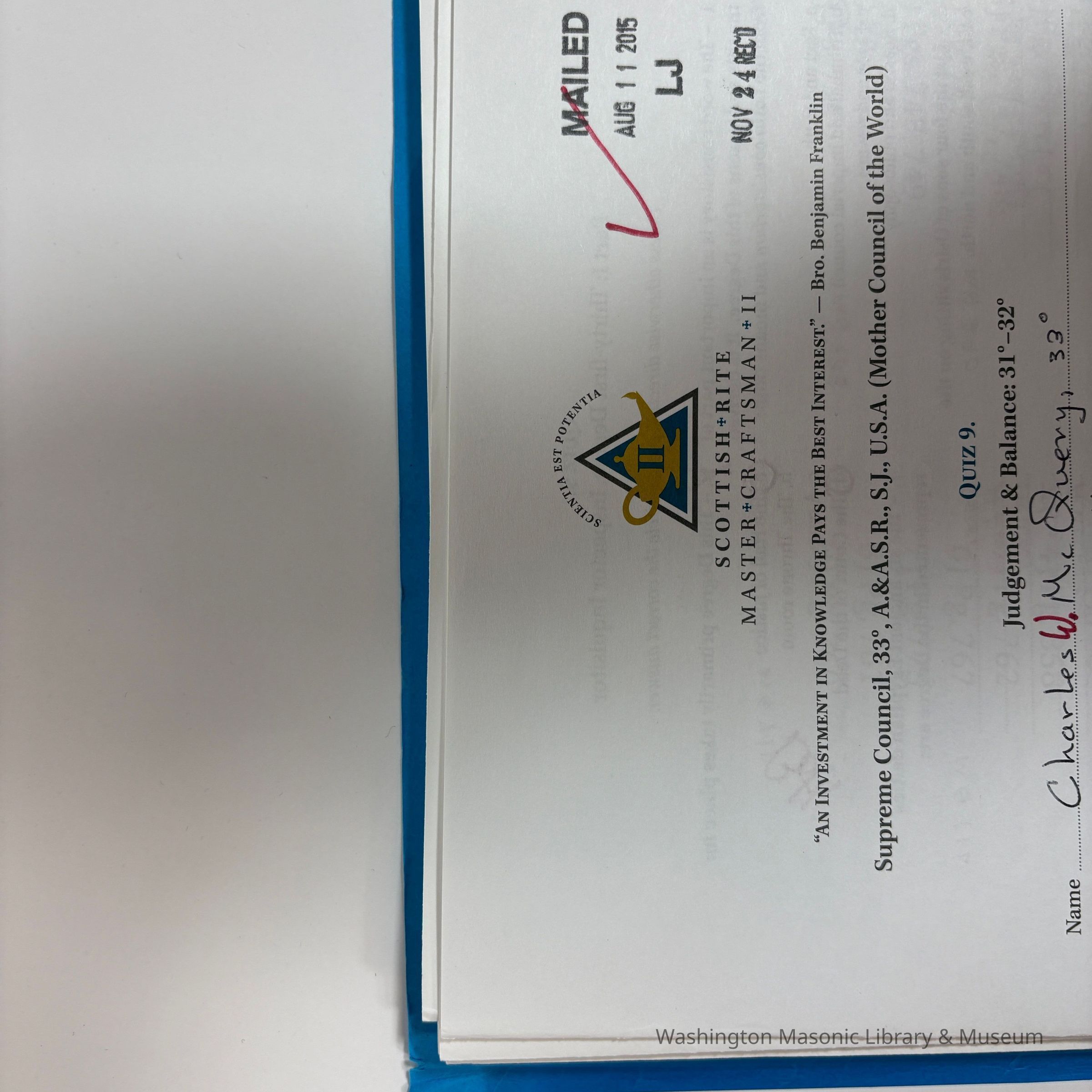Folder: Blue. Contains Scottish Rite Master Craftsman II Test Answers completed by PGM Charles W. McQuery. The first test answers were completed and shipped to Supreme Council Southern Jurisdiction December 2009, and the last were received Nov 24, 2015.