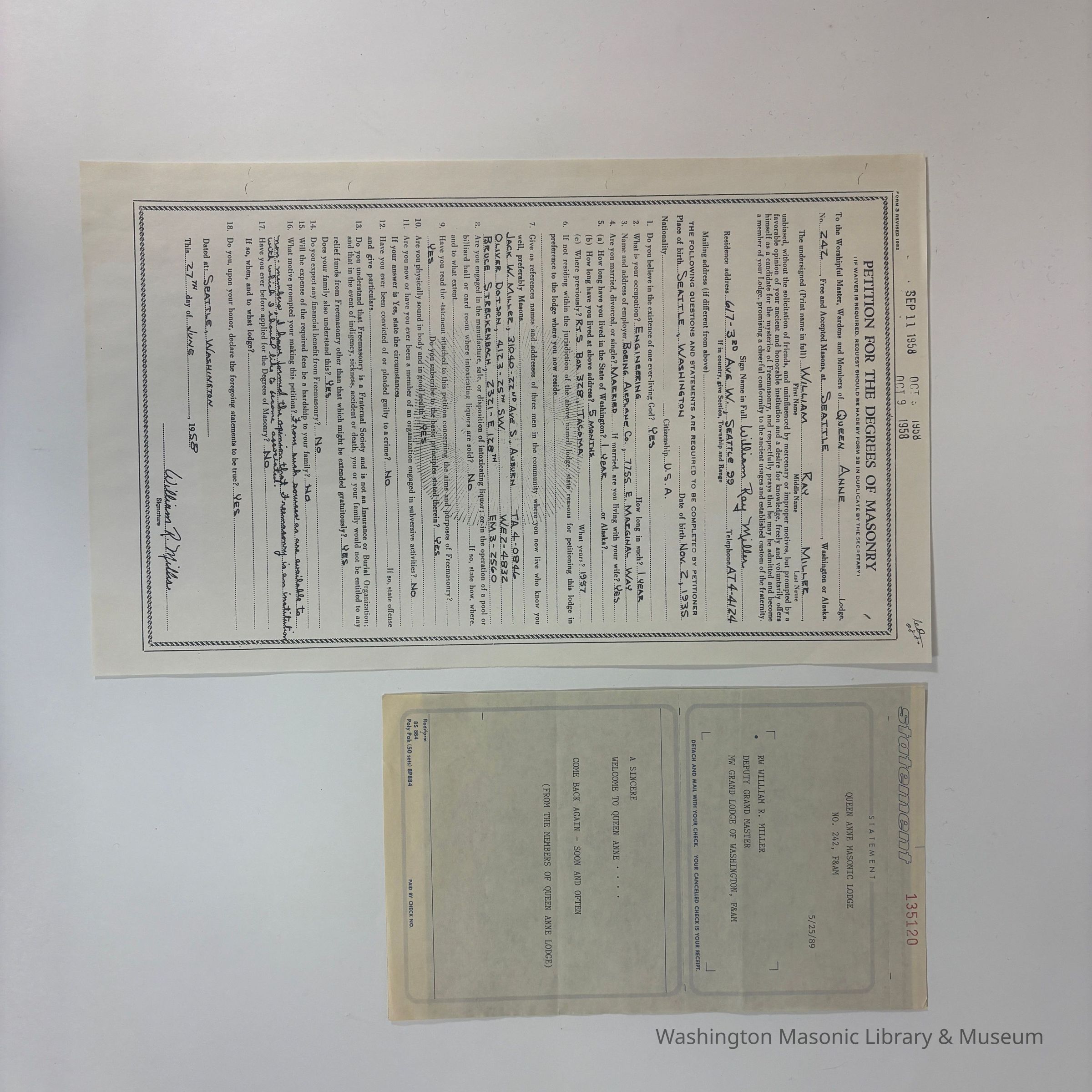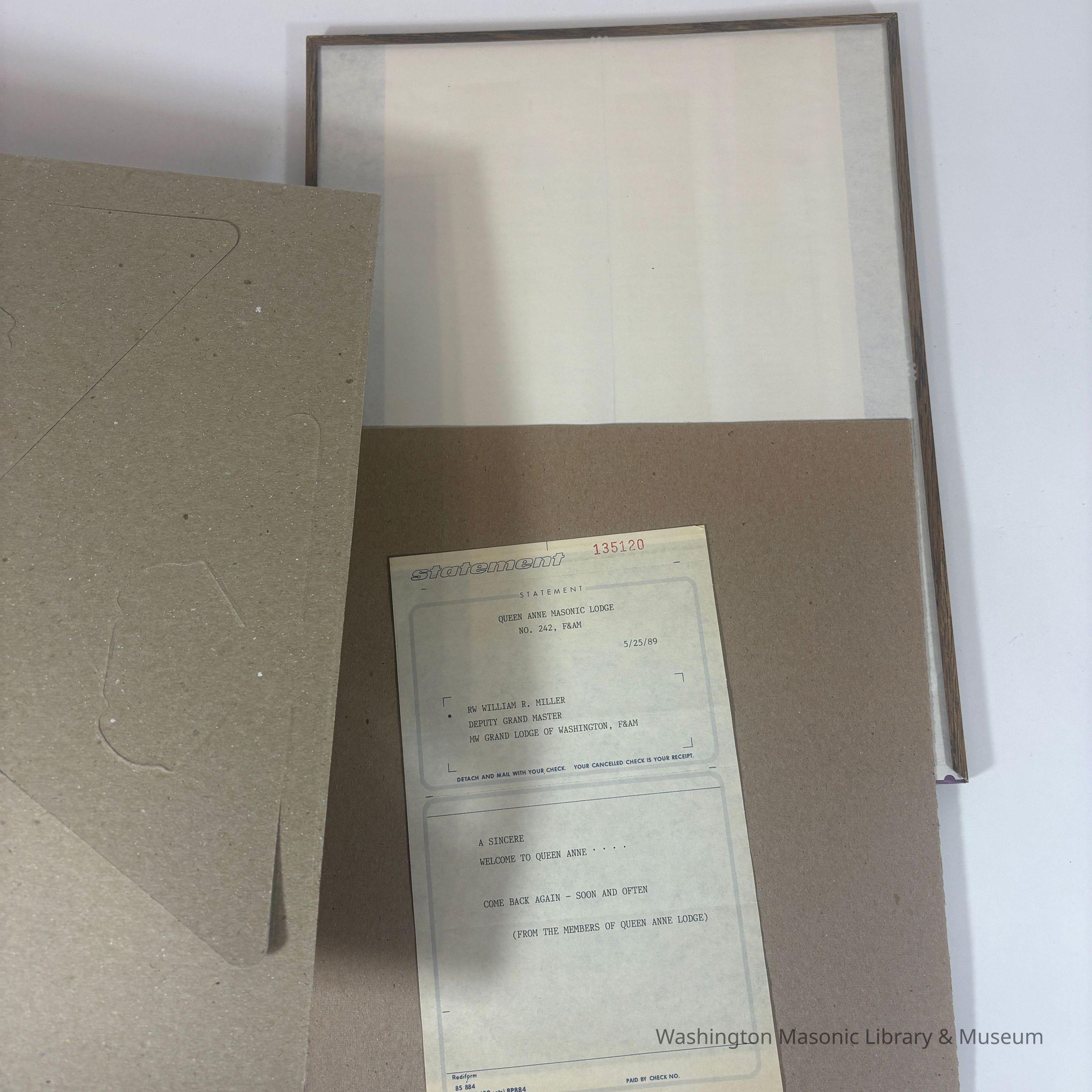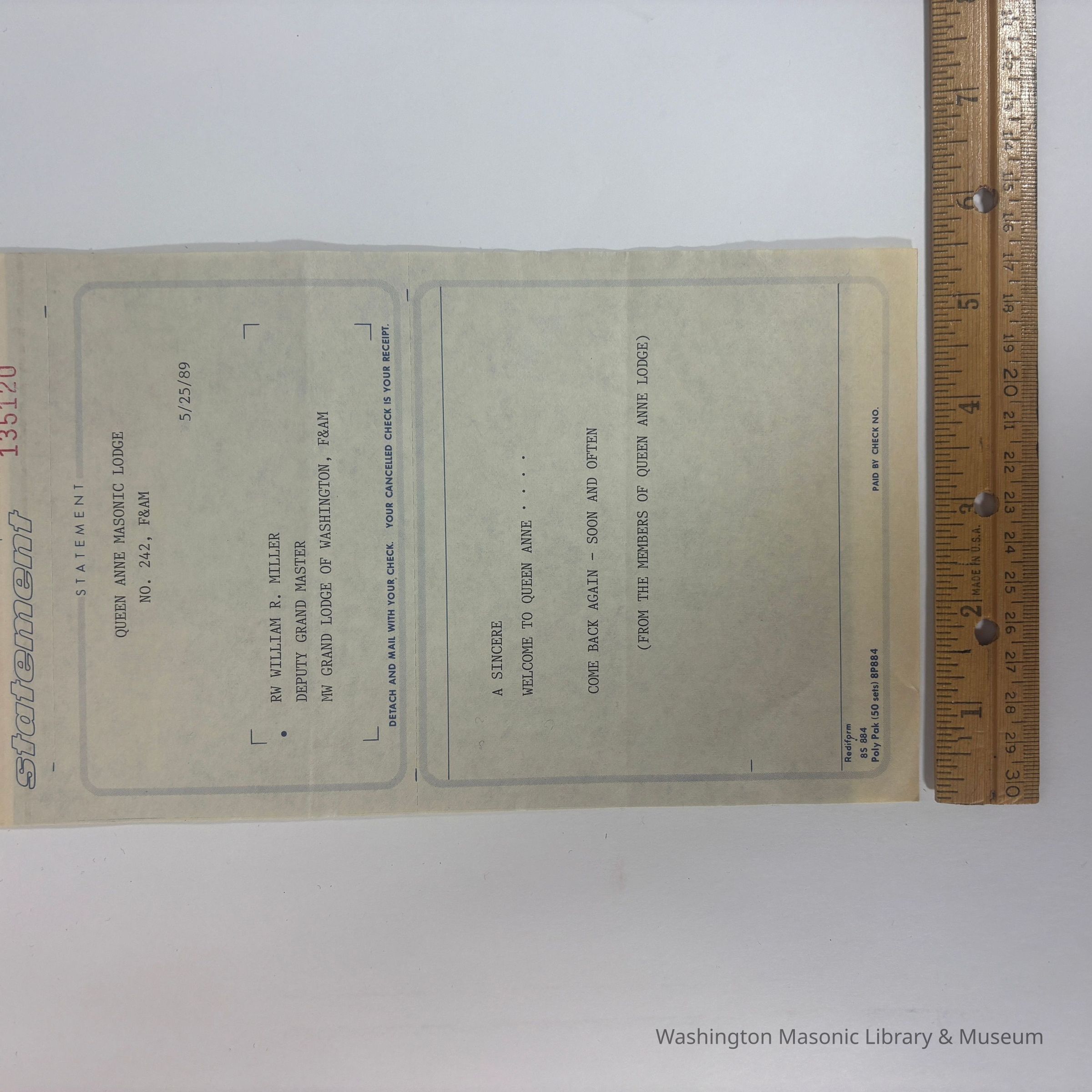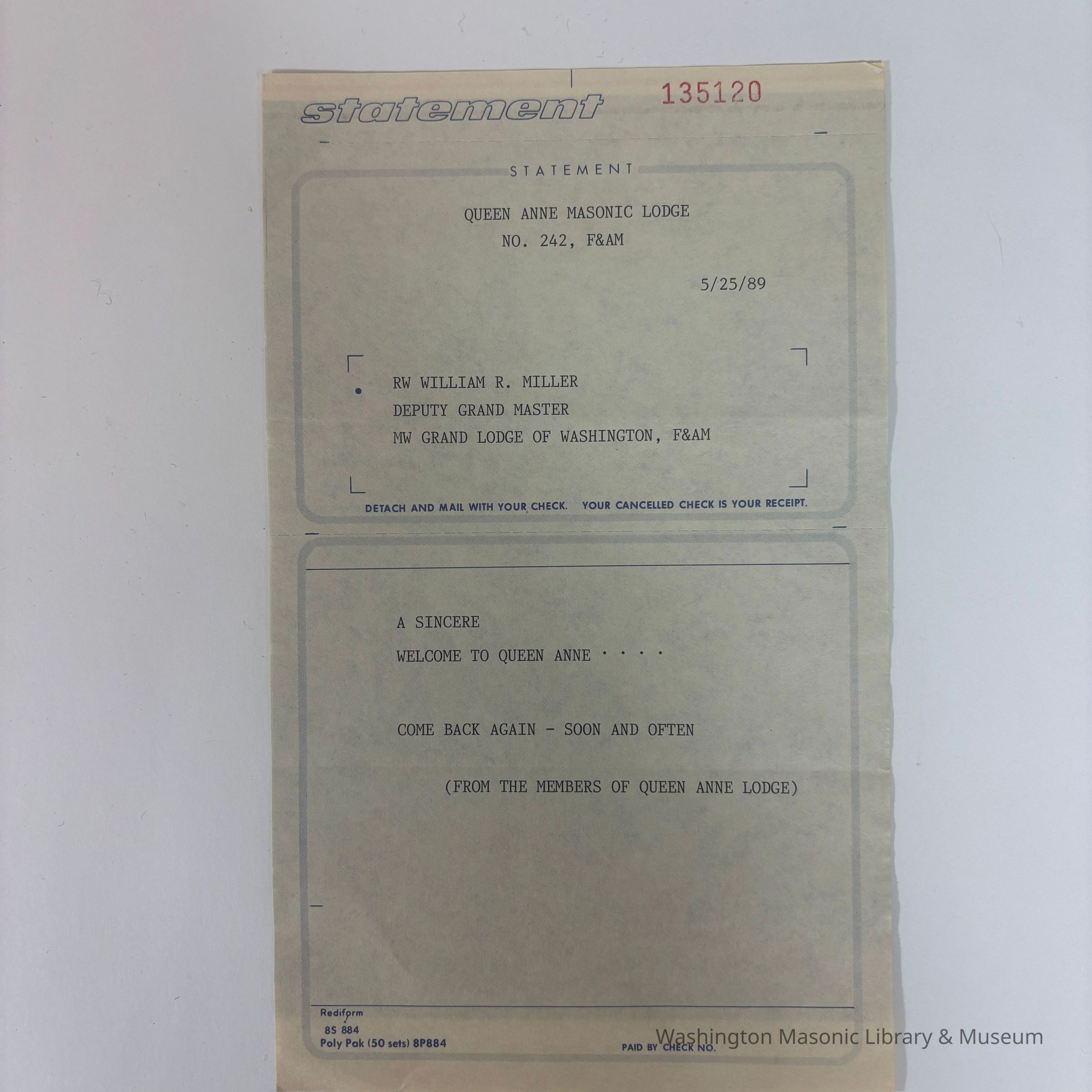 Form: Statement Rediform, statement to be mailed with a check. 'Queen Anne Masonic Lodge No. 242, F&AM, 5/25/89. RW William R. Miller Deputy Grand Master, MW Grand Lodge of Washington, F&AM. A Sincere Welcome to Queen Anne....Come Back Again--Soon and Often, (From the Members of Queen Anne Lodge)'Create Date