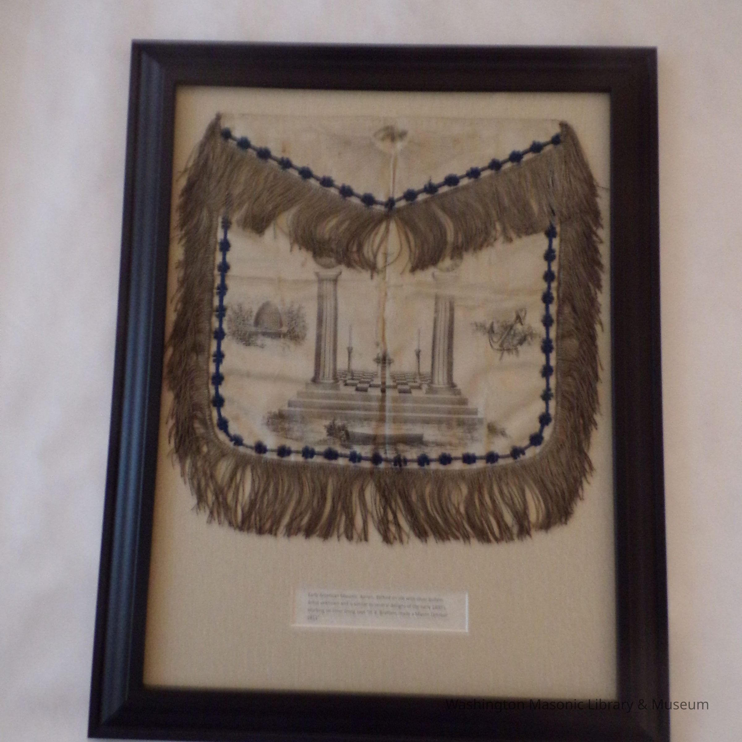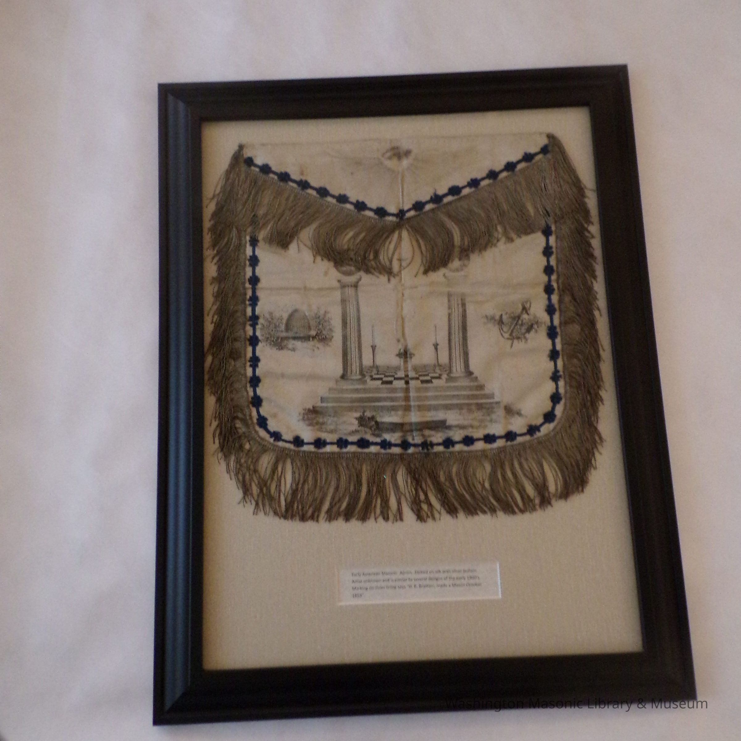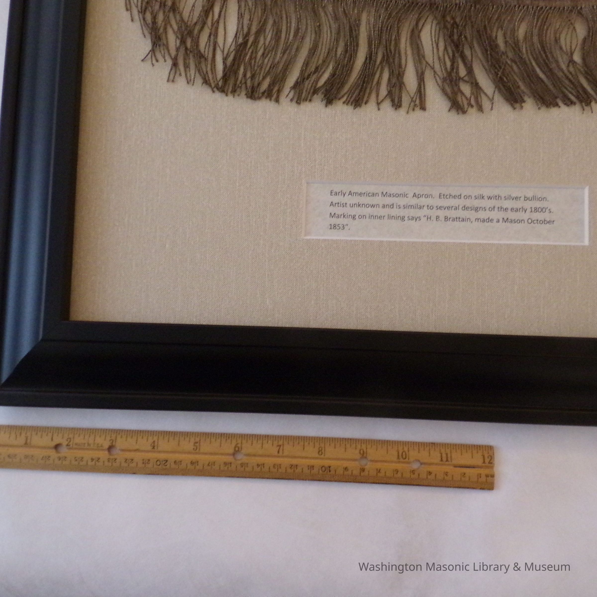 Framed Apron: "Early American Masonic Apron. Etched on silk with silver bullion. Artist unknown and is similar to several designs of the early 1800s. Marking on inner lining says "H.B. Brattain, made a mason October 1853"Collection