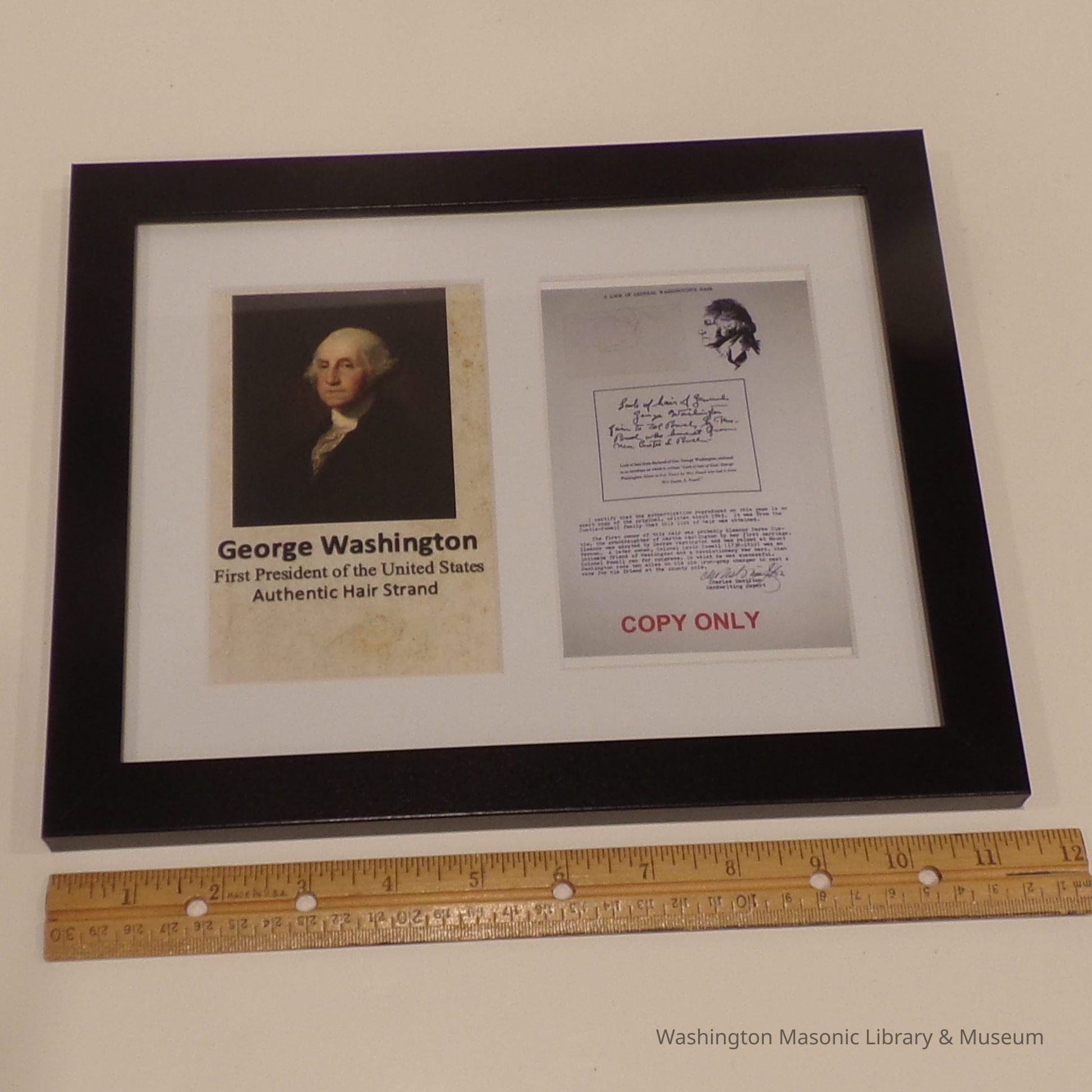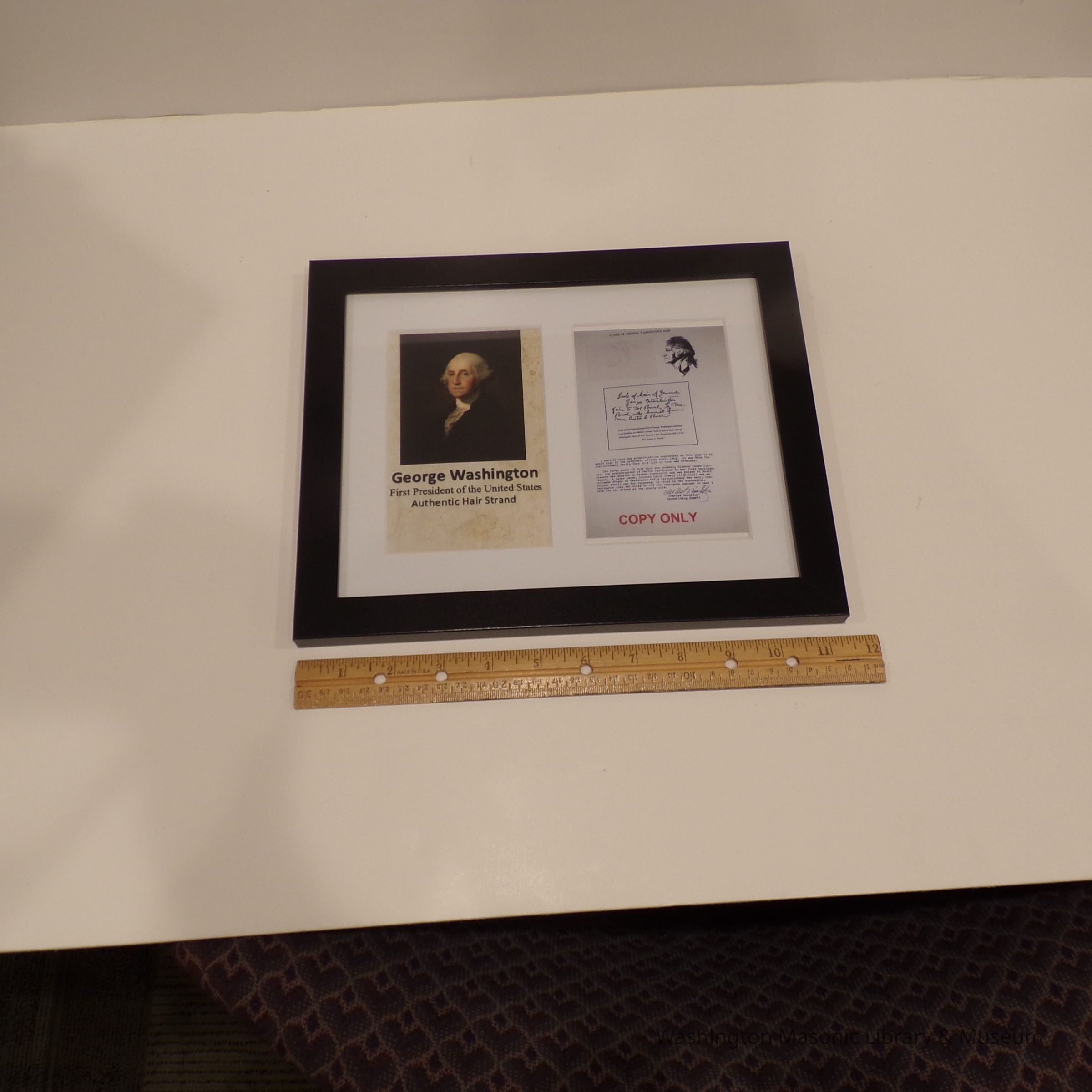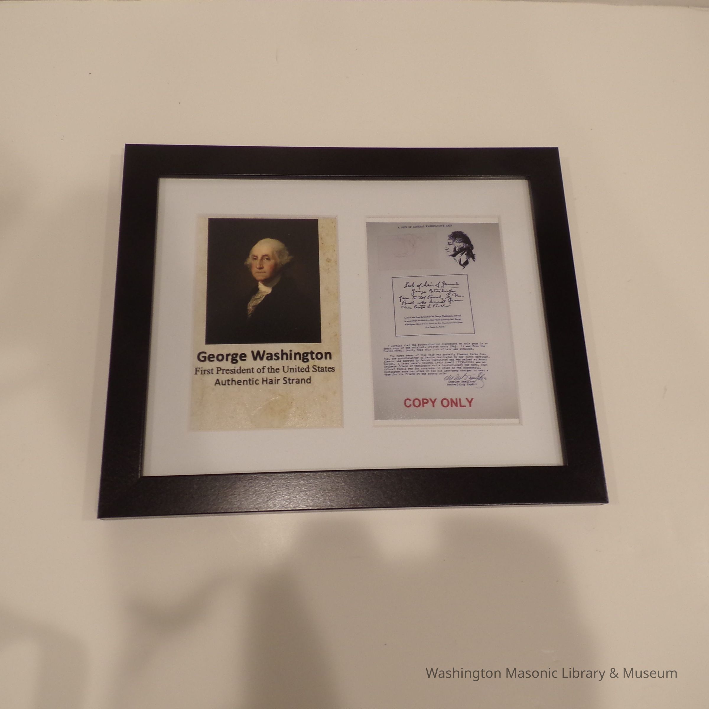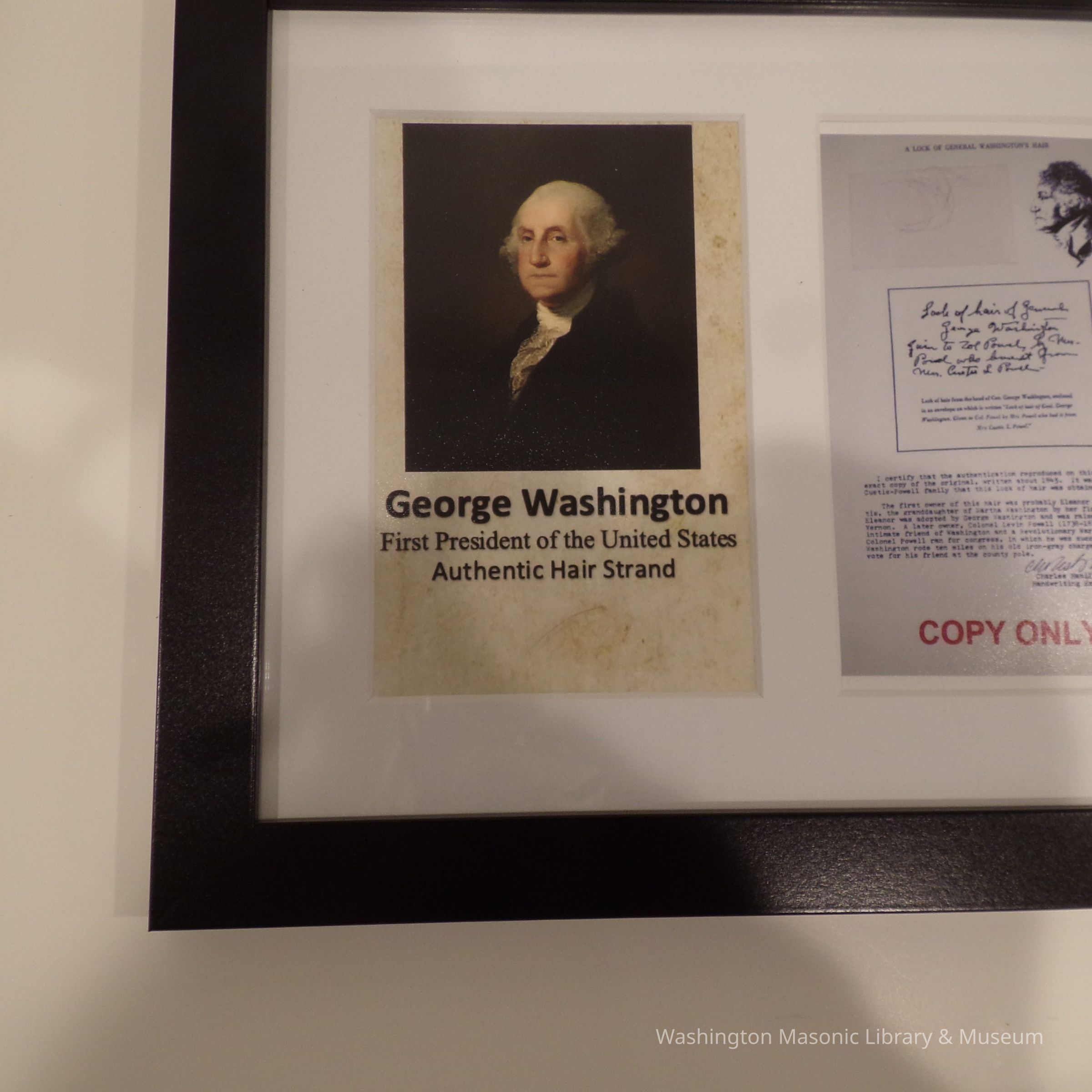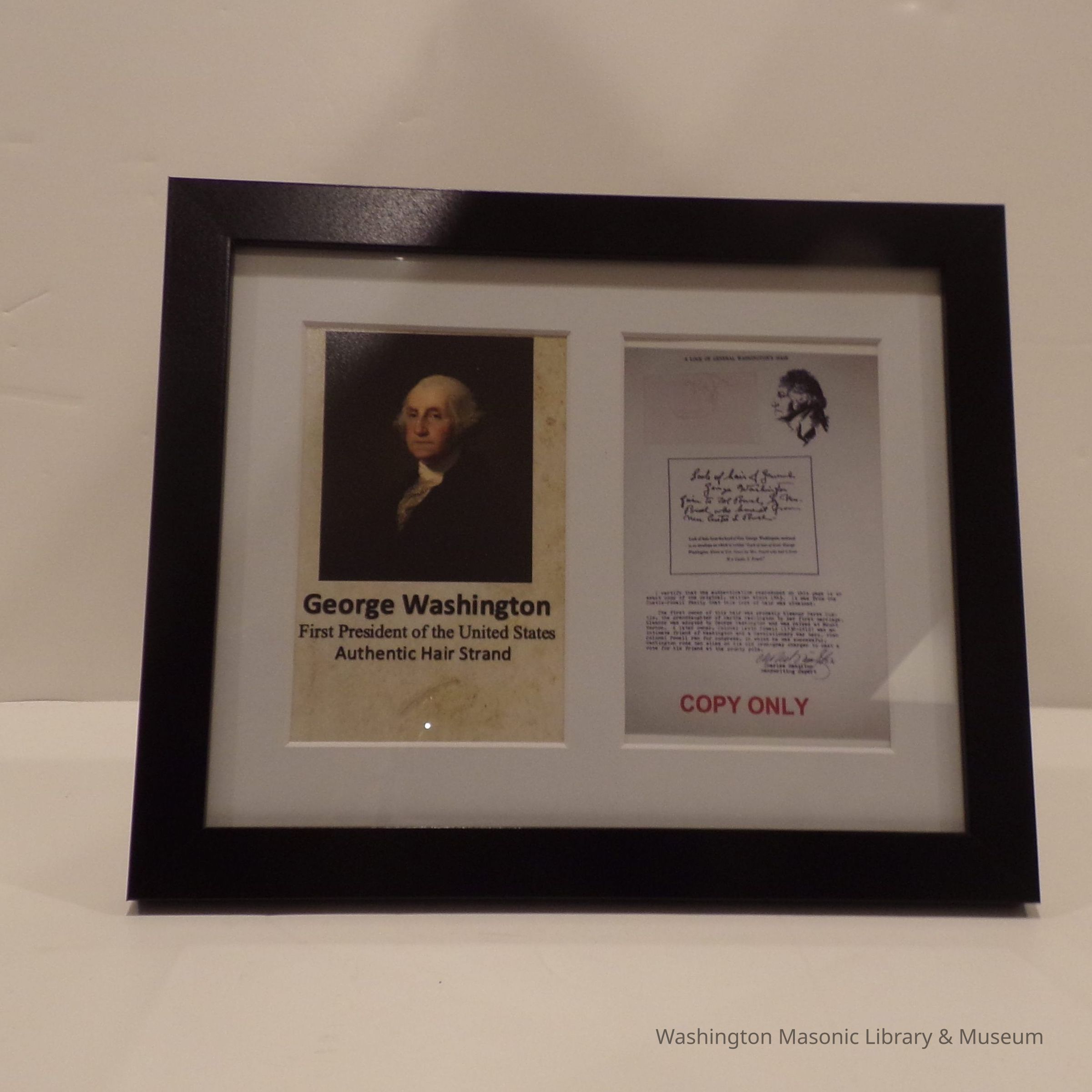 Framed Display: "George Washington First President of the United States Authentic Hair Strand. " One Hair. And a copy of an authentification document. Back of frame states: "Donated to the Brothers of Olympia Lodge No.1 by Grand Historian Roger Nelson 3/3/22 and entrusted to the care of the Grand Lodge Museum."Collection
