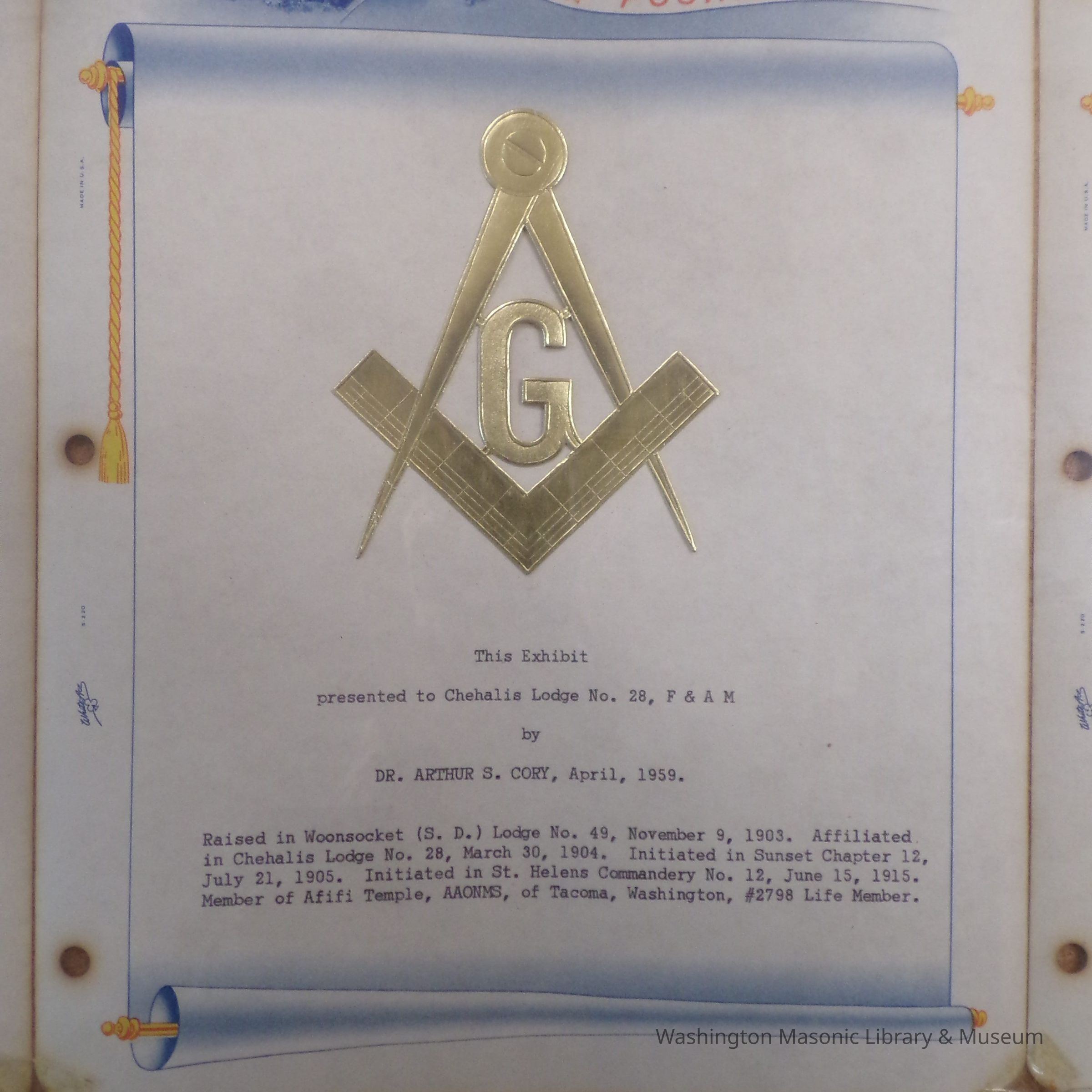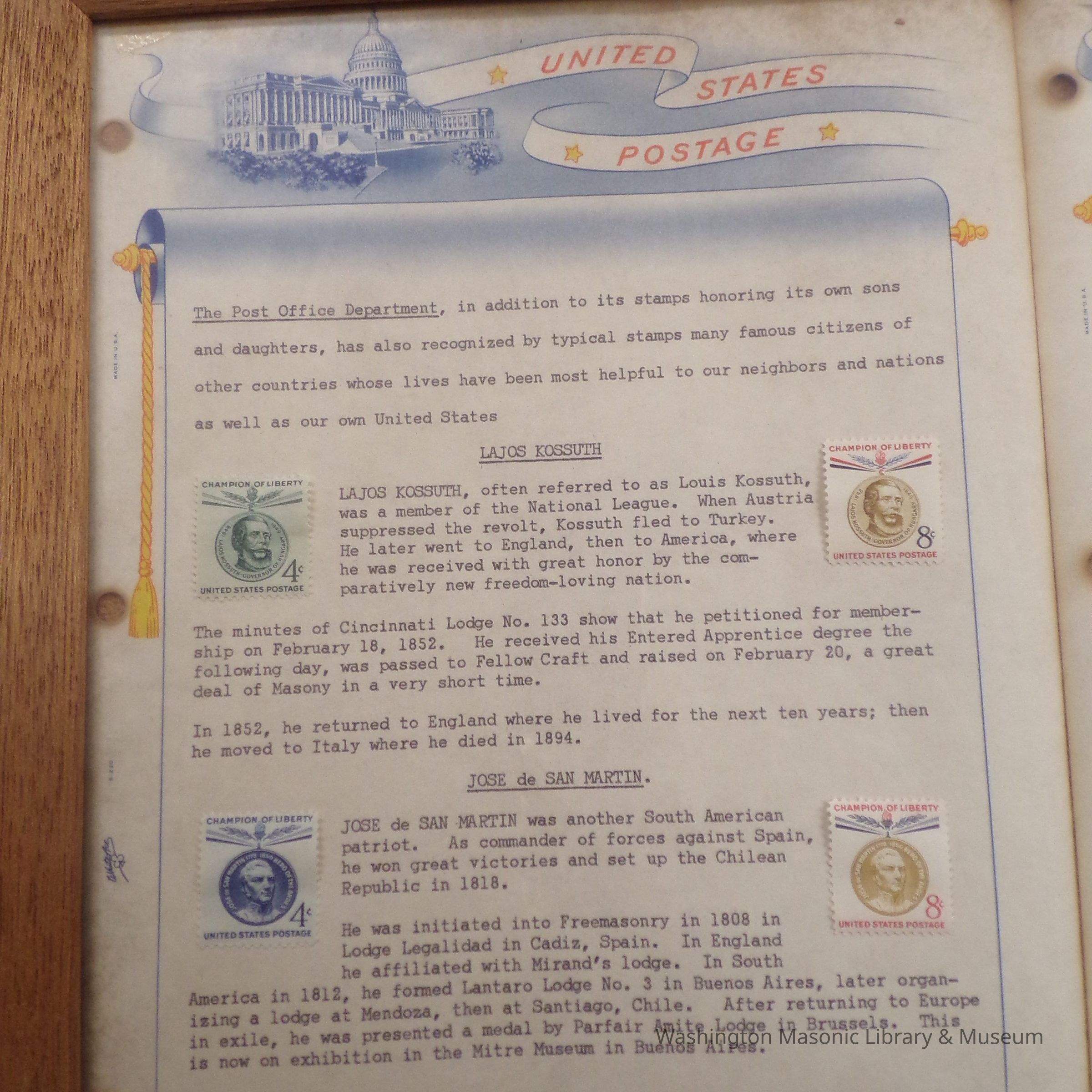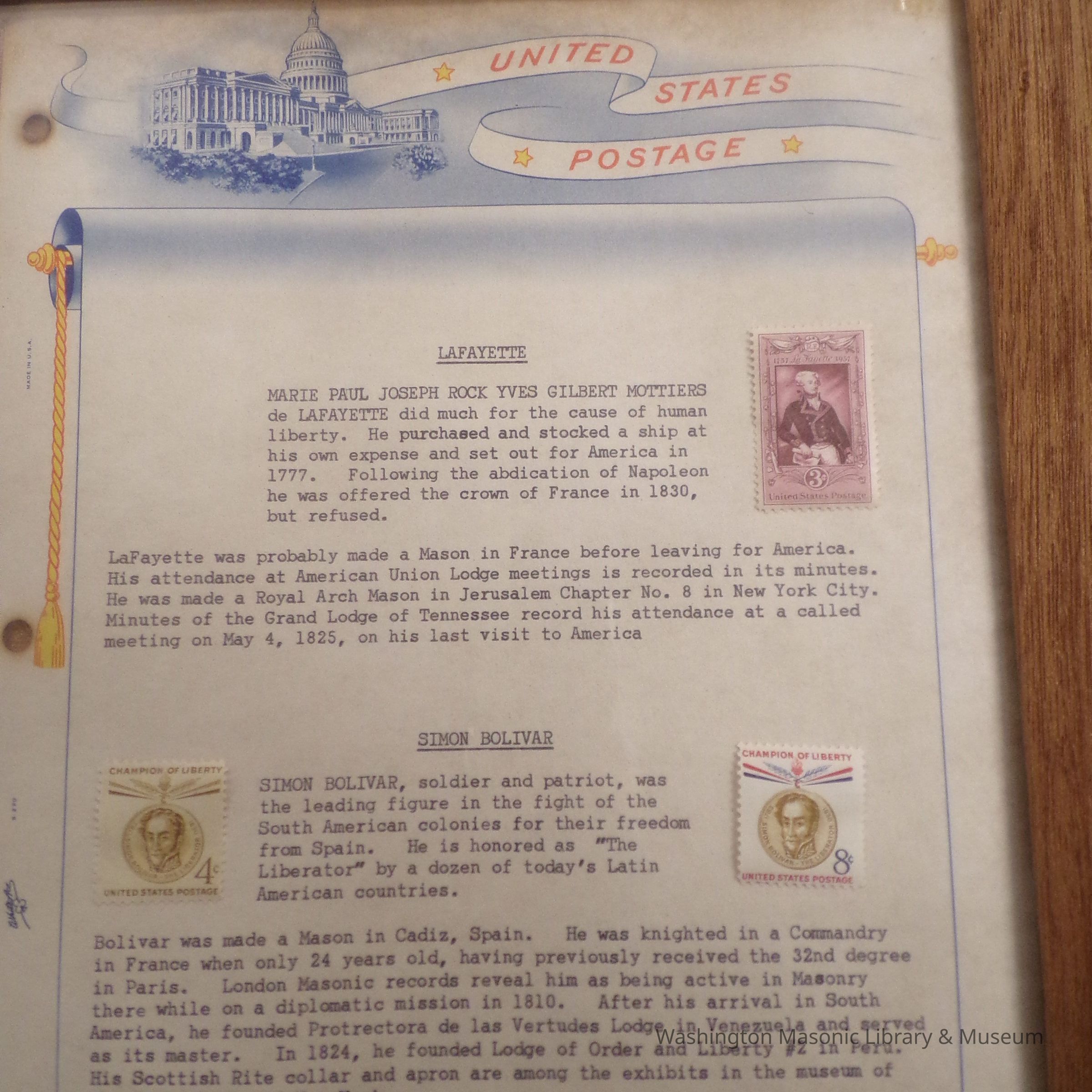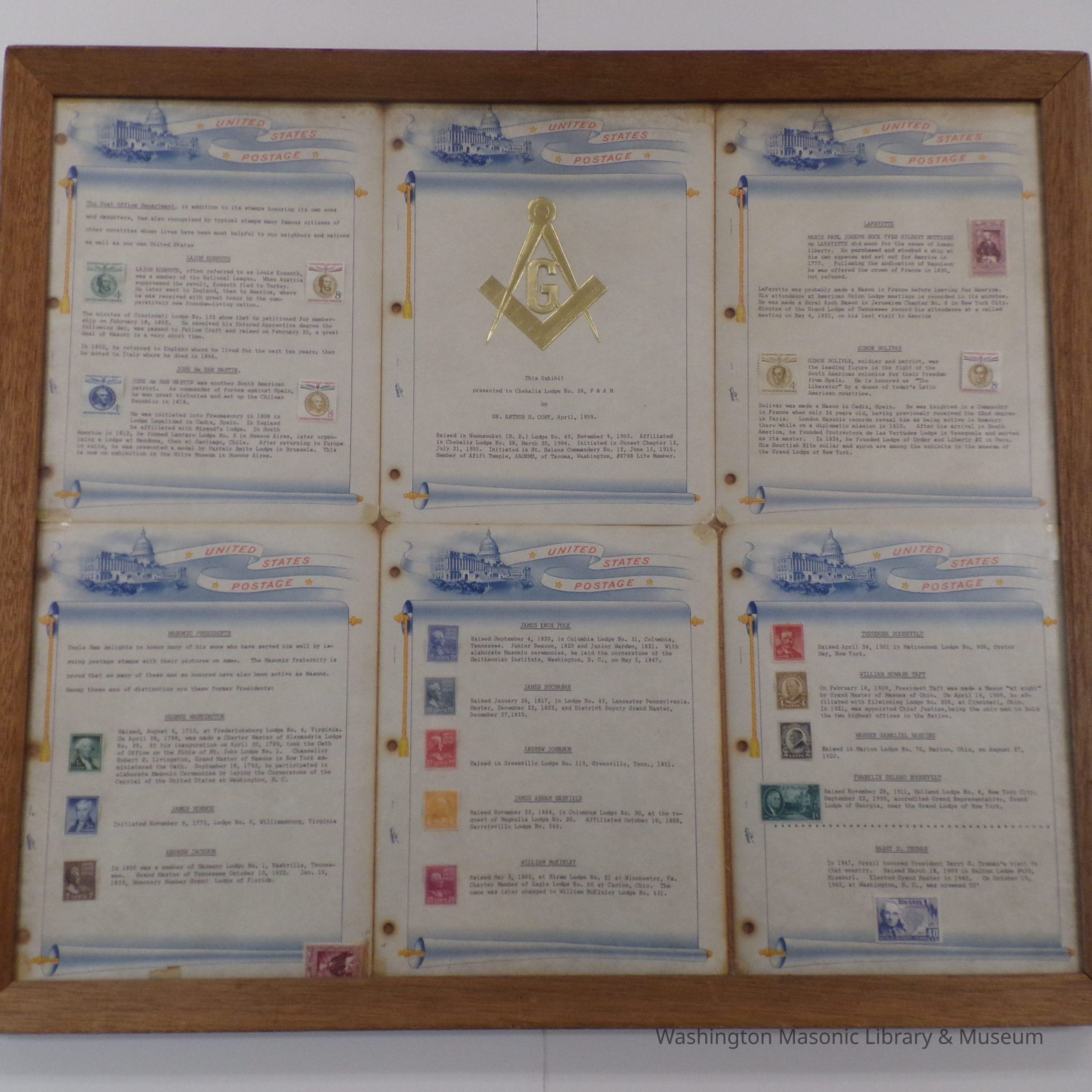 Framed Exhibit: 6 pages displaying stamps of famous masons. "Presented to Chehalis Lodge 28 by Dr. Arthur S. Cory, April 1959"Collection