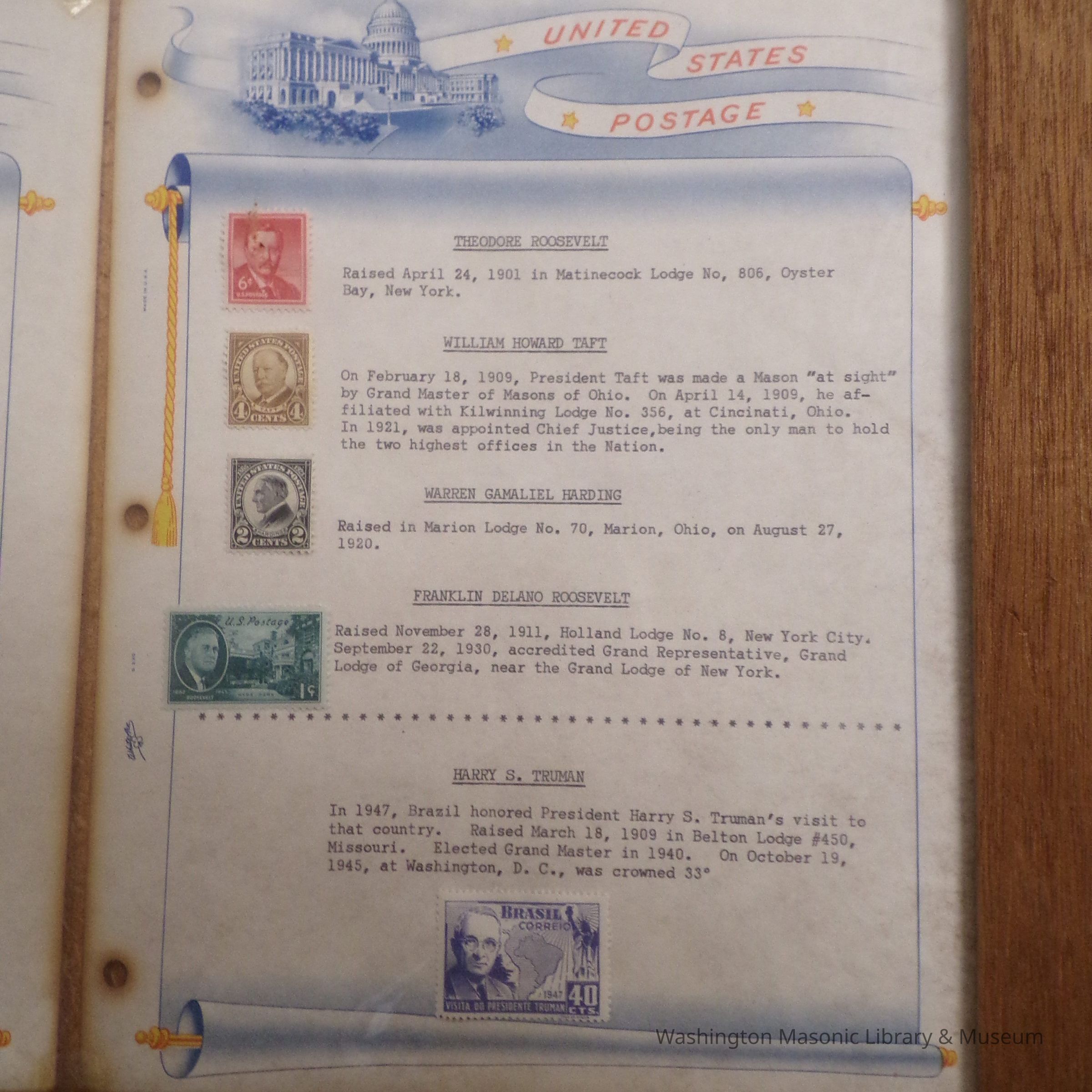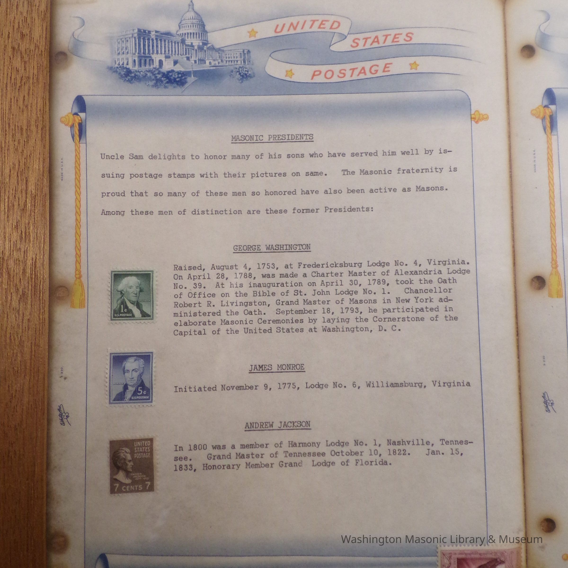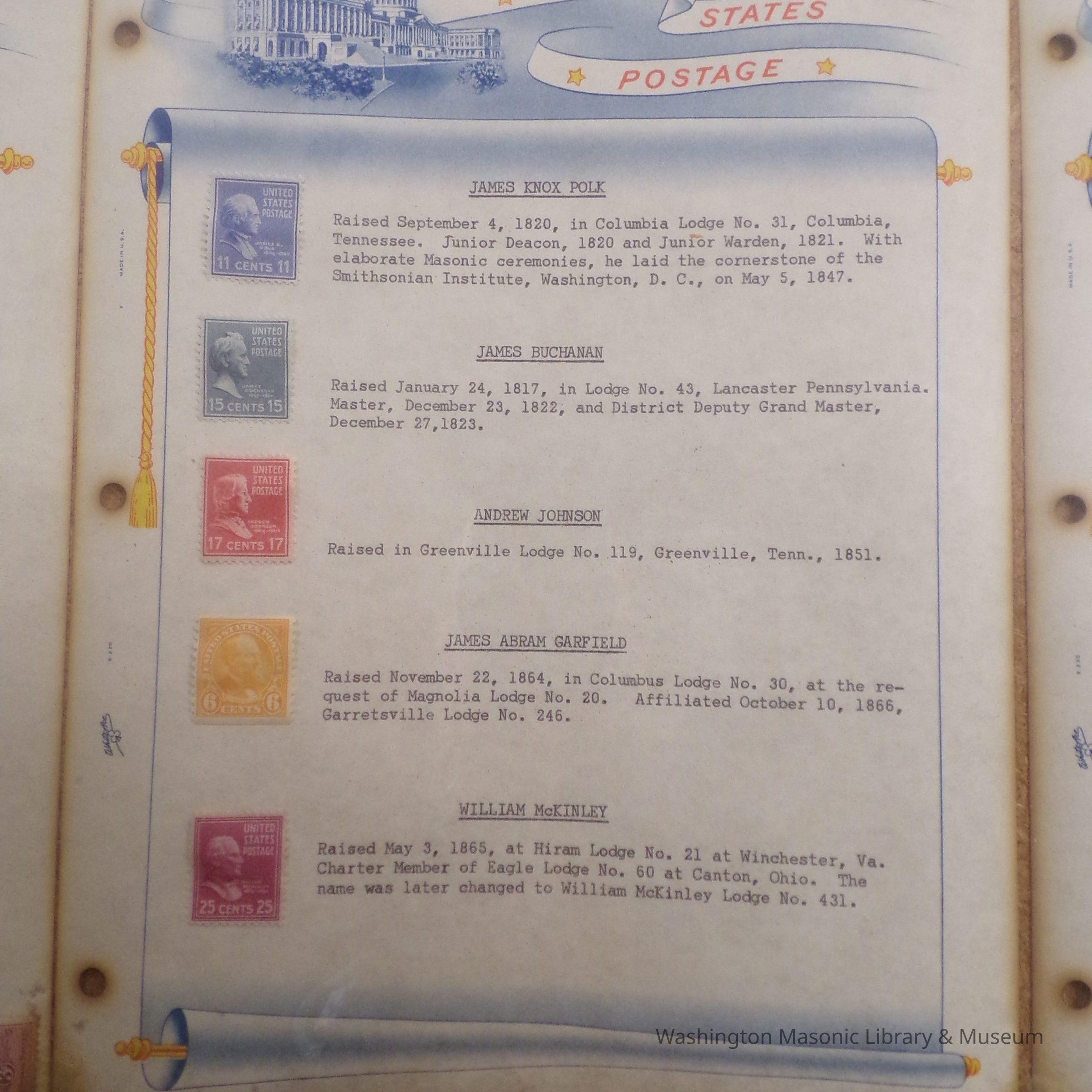 Framed Exhibit: 6 pages displaying stamps of famous masons. "Presented to Chehalis Lodge 28 by Dr. Arthur S. Cory, April 1959"Entry/Object ID
