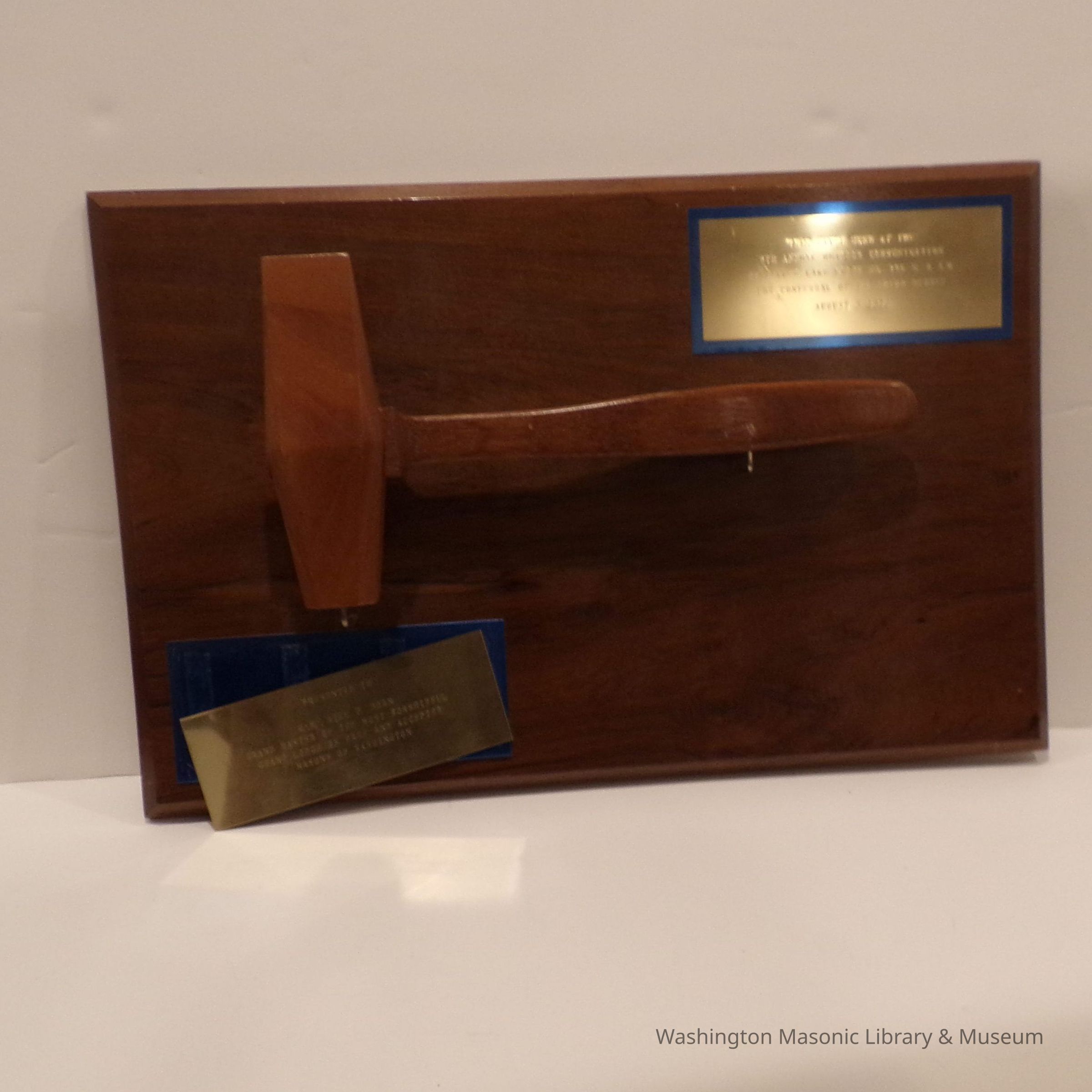 Gavel on plaque: Wooden. Presented to GM Bill Horn by Haller Lake Lodge 296. Gavel used at 9th Annual outdoor communication for 296. August 15, 1972.Entry/Object ID