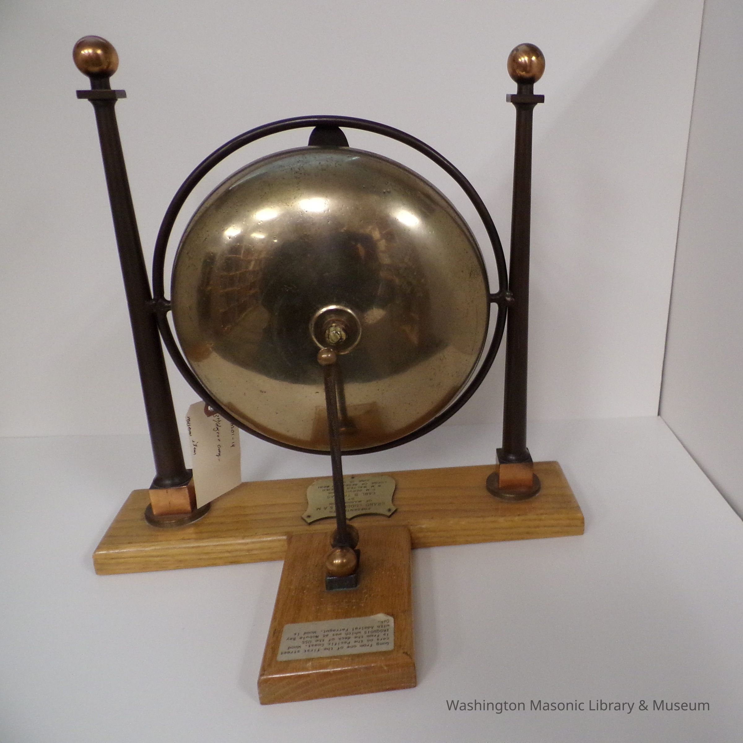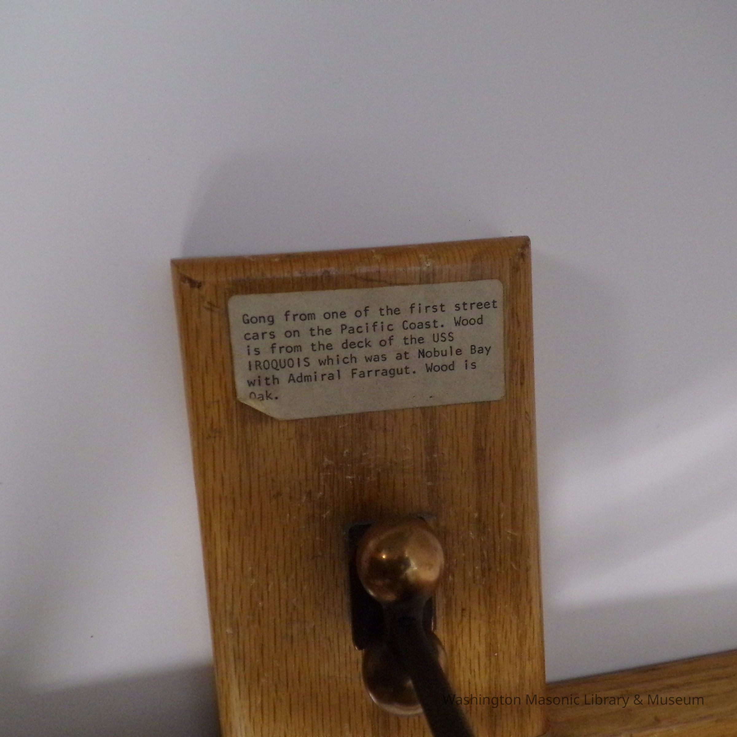 3rd Degree Gong. Plaque reads "Presented to Grand Lodge F&A.M of Washington by Earl B. Thomas P.M. Service 255 W.M. Walter F. Meier Lodge of Research #281 June 15, 1954." Sticker on wood reads: "Gong from one of the first street cars on the Pacific Coast. Wood is from the deck of the USS Iroquois which was at Nobule Bay with Admiral Farragut. Wood is Oak"Collection