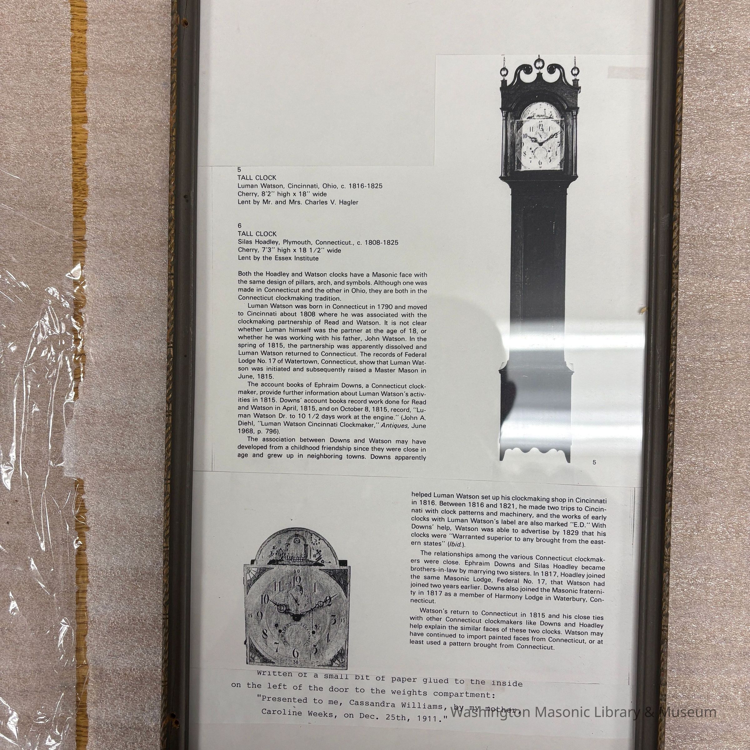 Grandfather Clock: Has masonic symbols on front. Masonic Library Association Plaque. Inside is note that says "presented to me, Cassandra WIlliams by my mother Caroline Weeks, this clock on Dec. 25th, 1911.Collection