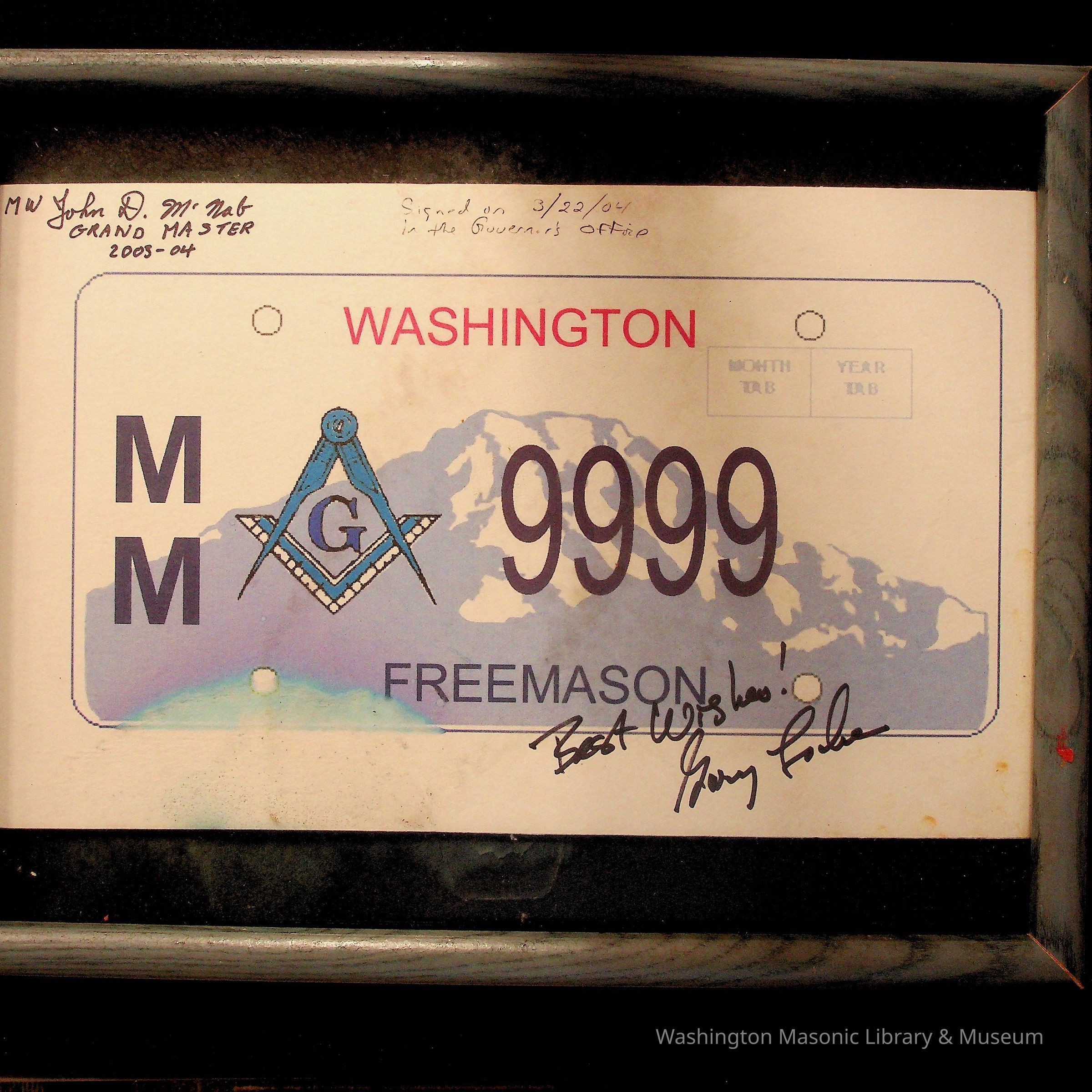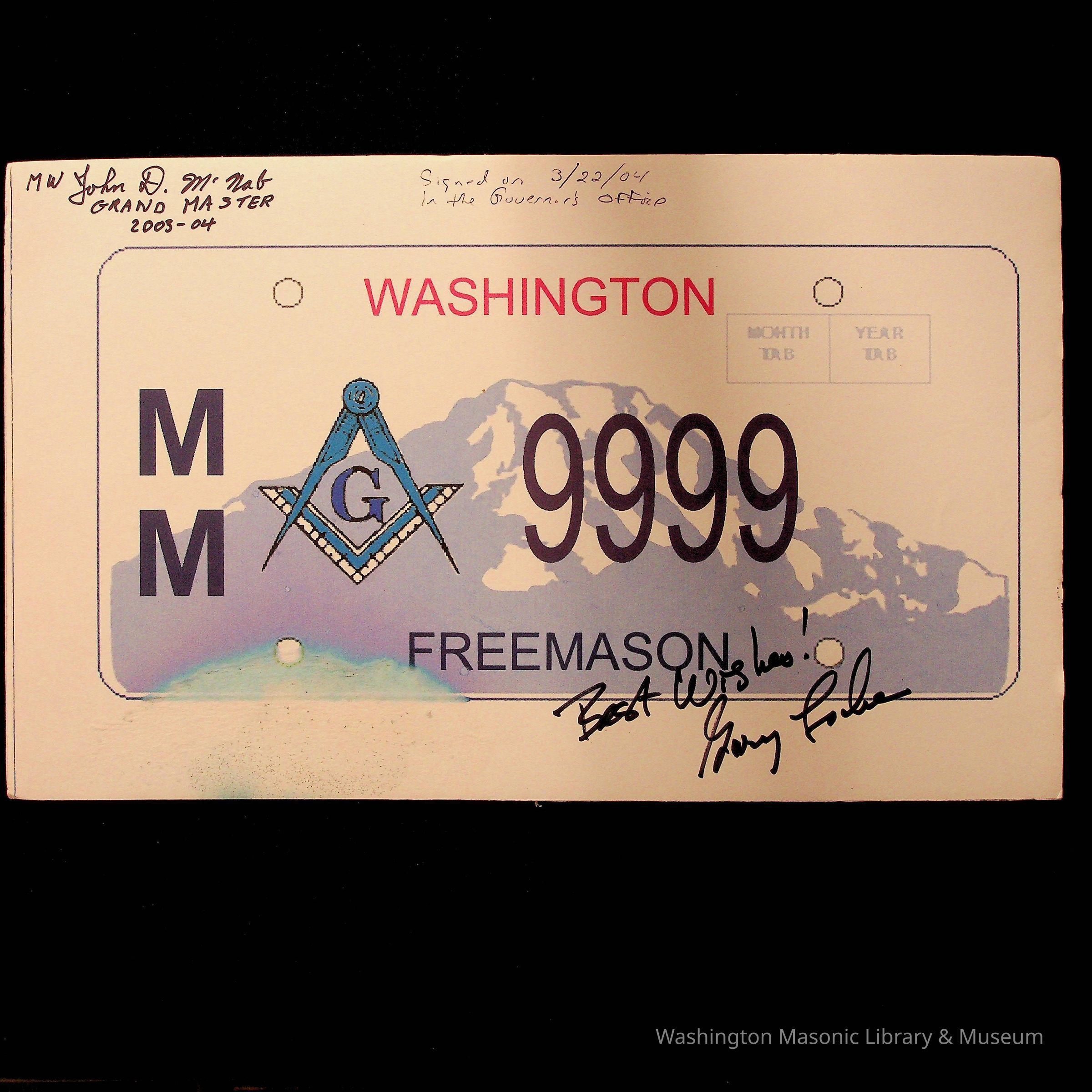 Image: Of a Washington Masonic License Plate. Signed by GM John D. McNab and Washington Governor Gary Locke (2004)Entry/Object ID