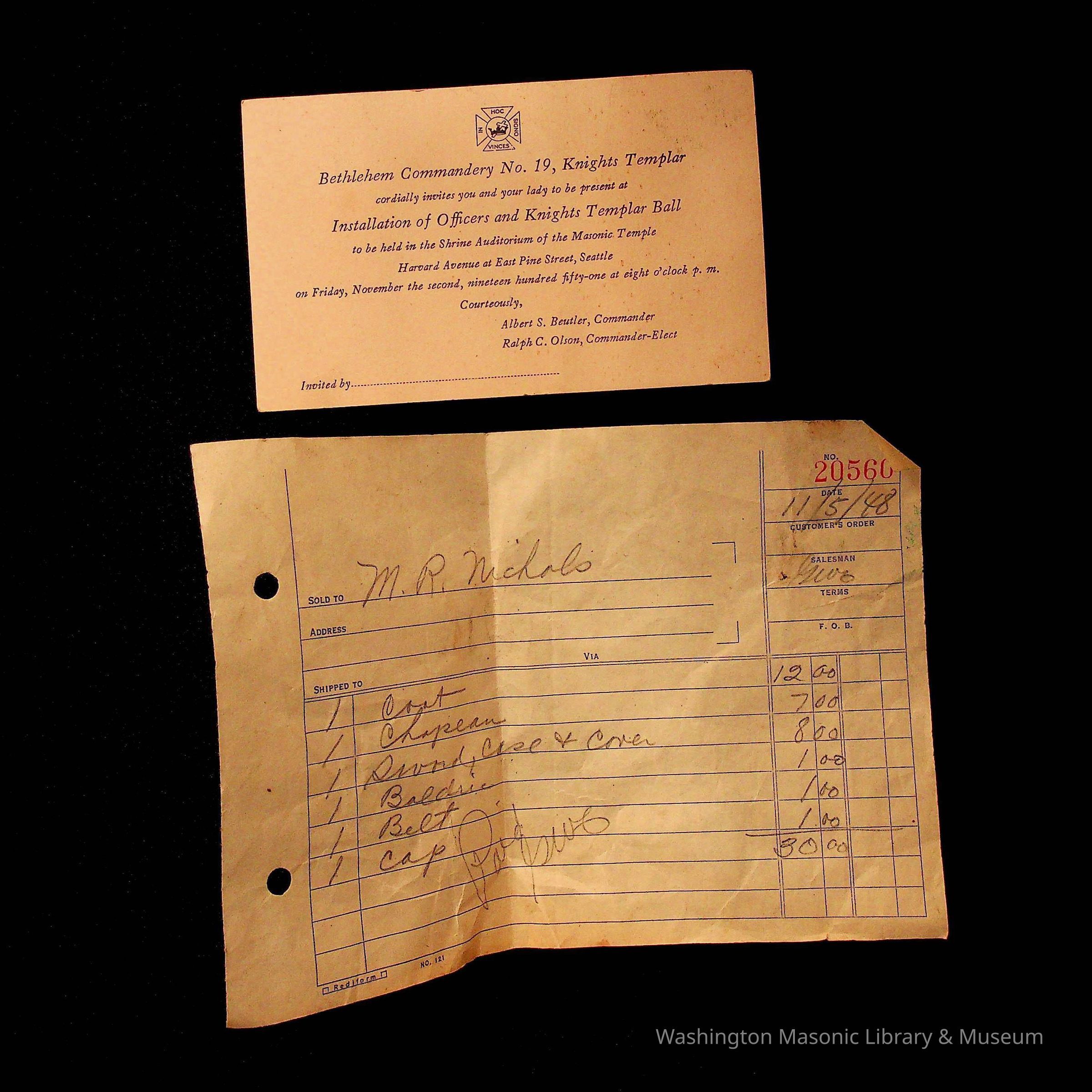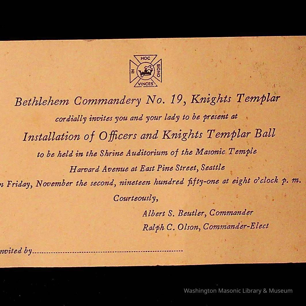 Invitation: Bethlehem Commandery No. 19, Knights Templar Ball, November 2, 1951.