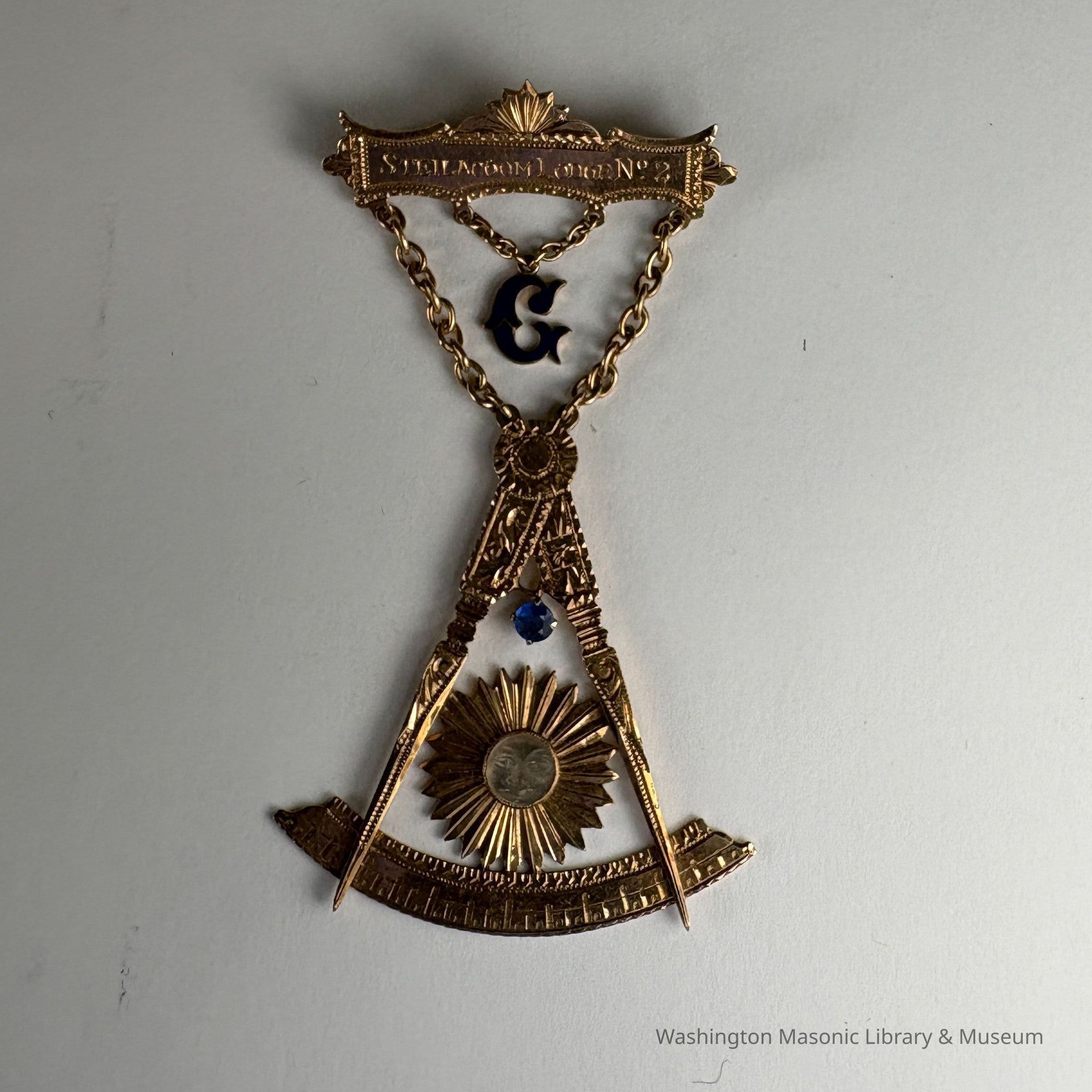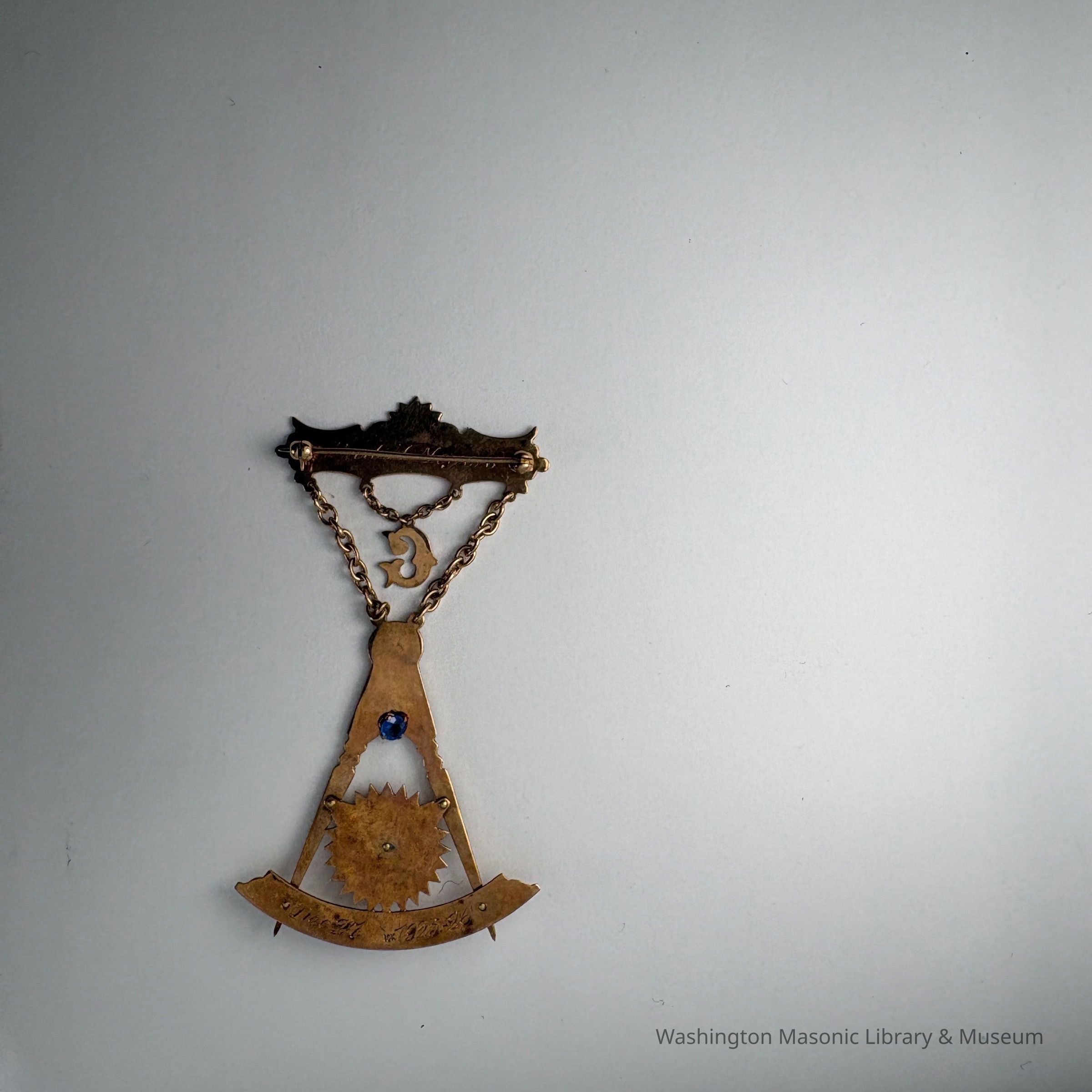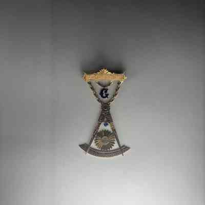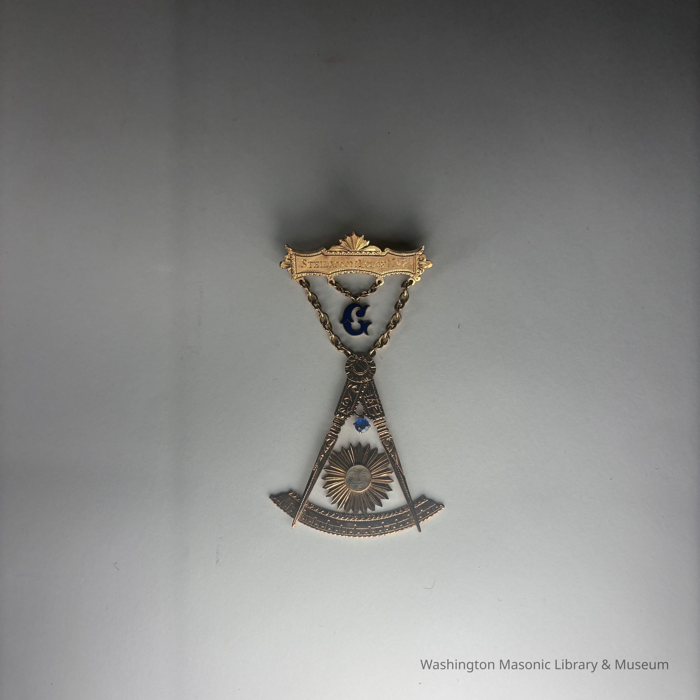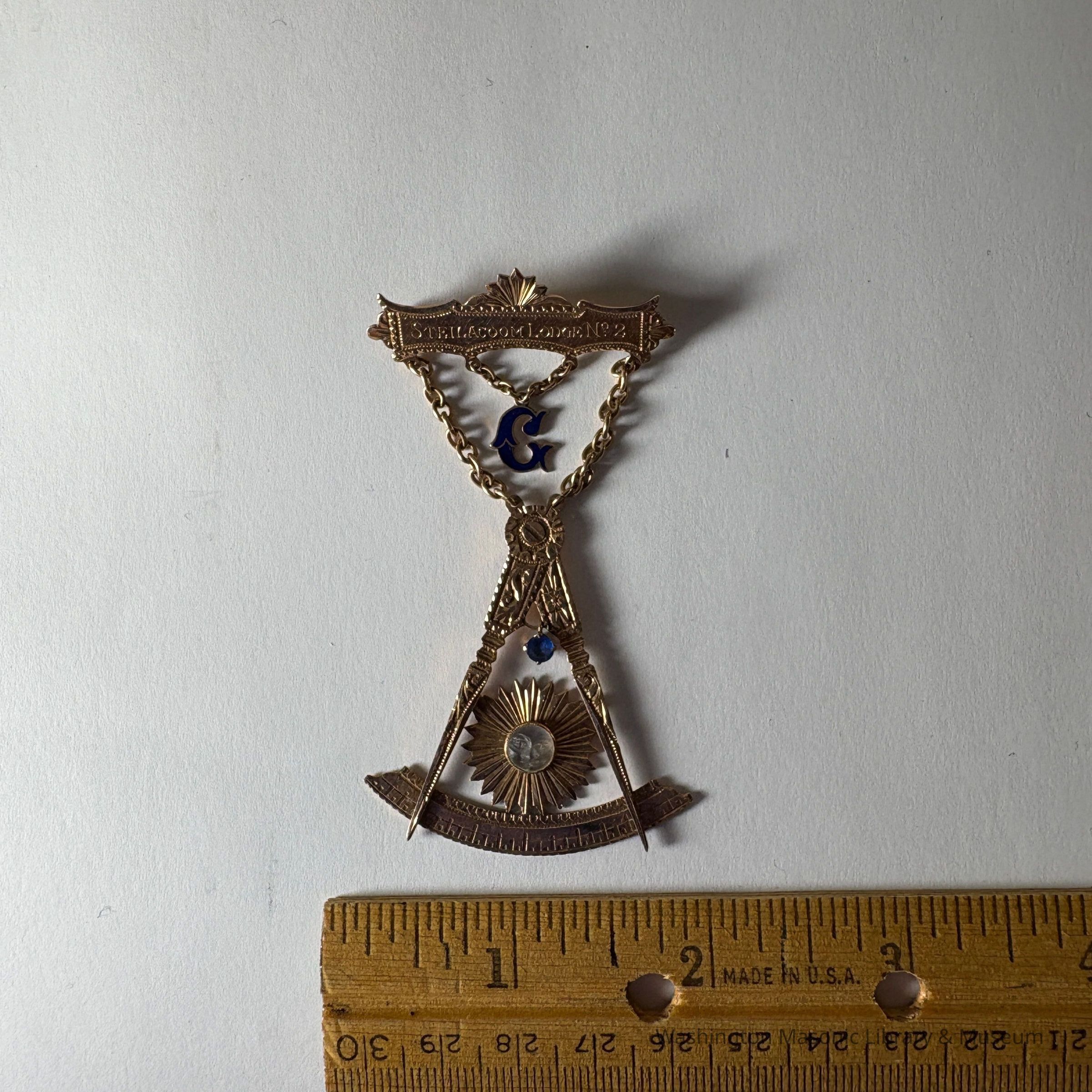 Jewel: Gold with blue Letter G and blue and white jewels embedded. Past Master's Jewel. Fred H. Meyers, Steilacoom No. 2. On the back is etched "Fred H. Meyers"Made/Created