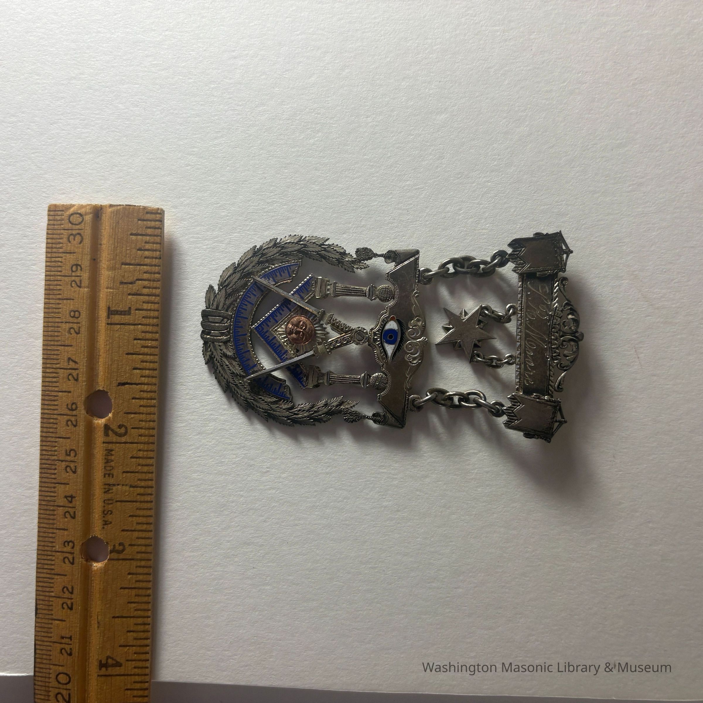 Jewel: Silver with All seeing eye and star. Past Master's Jewel. L.P. Moore, Steilacoom No. 2. On the back is etched " Presented to L.P. Moore by Steilacoom Lodge No. 2" 20th CenturyDimensions