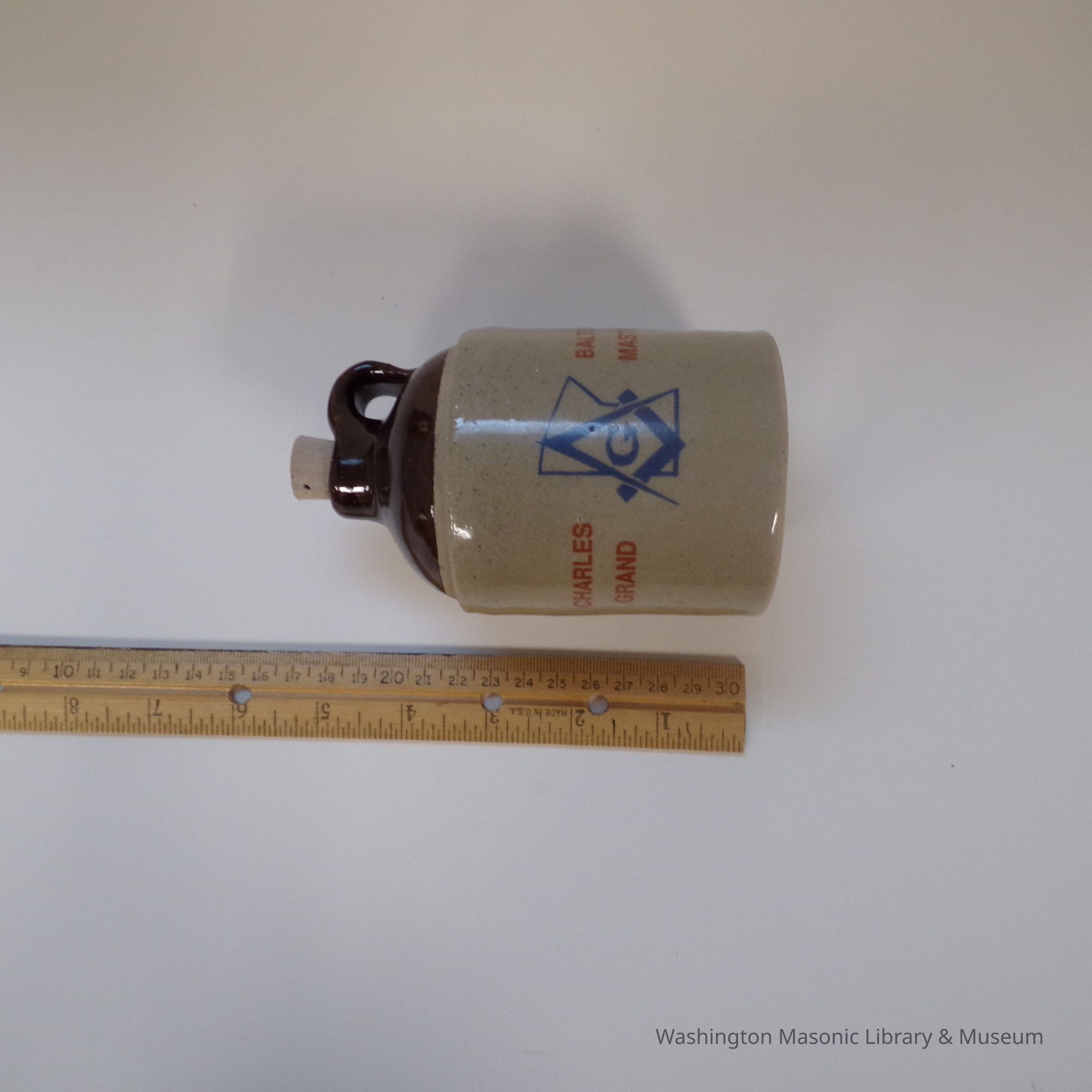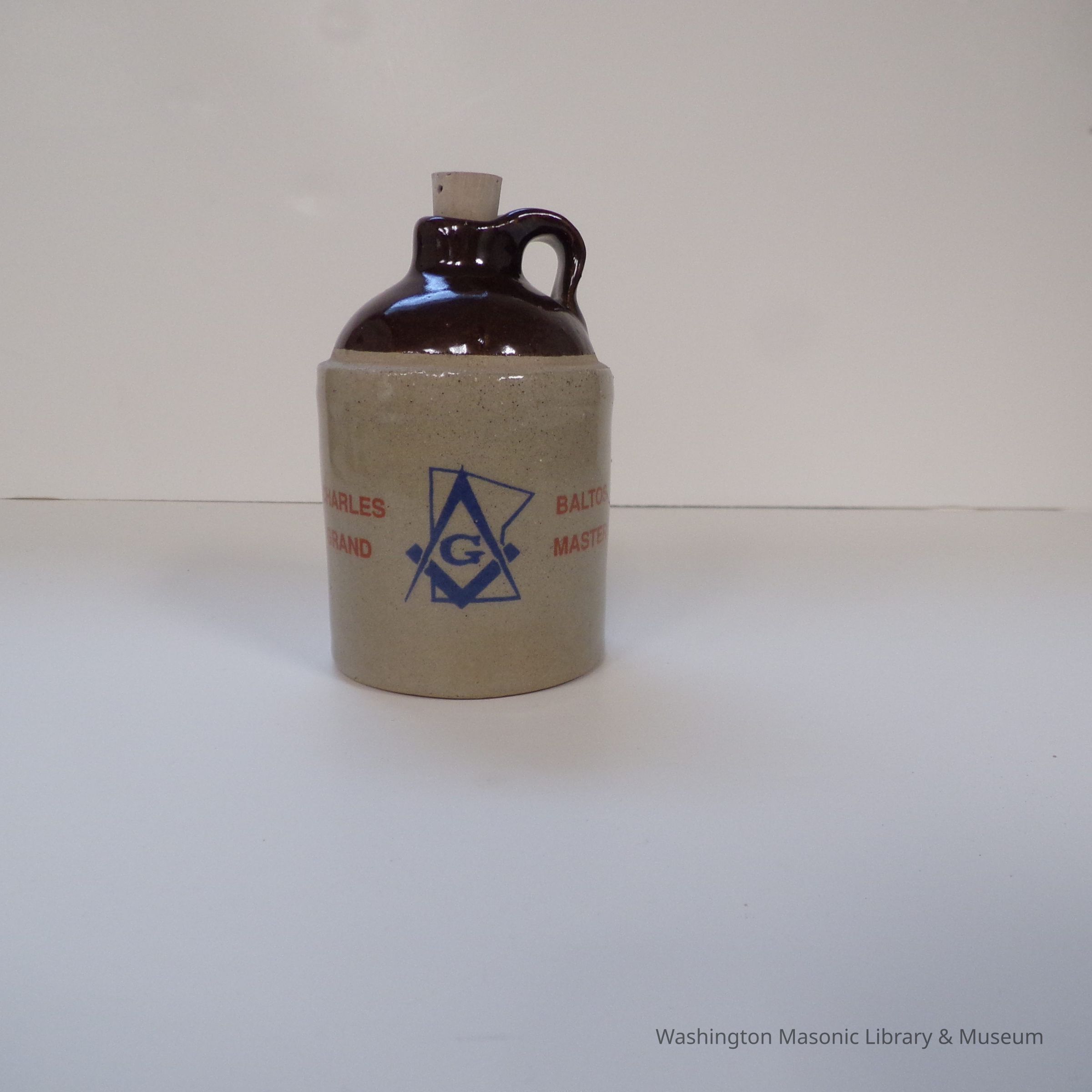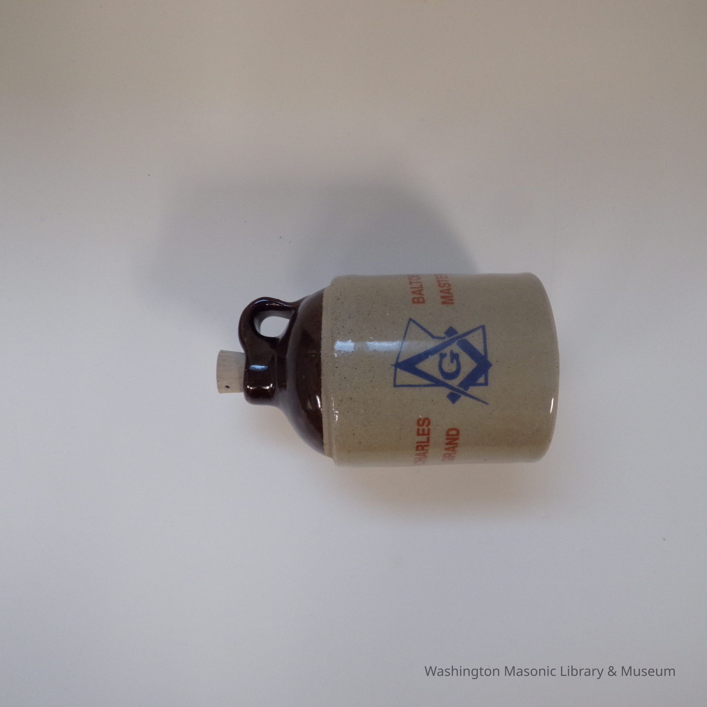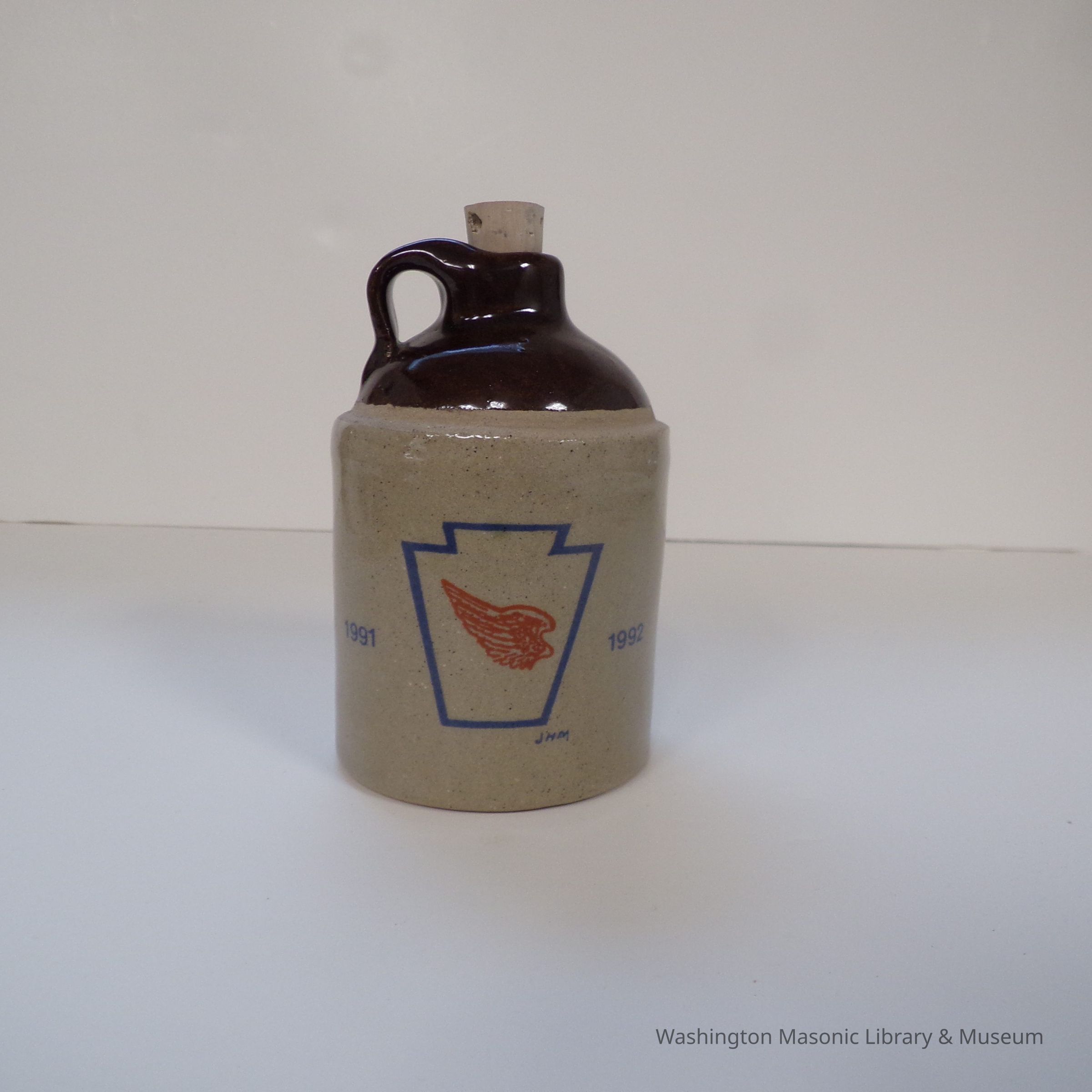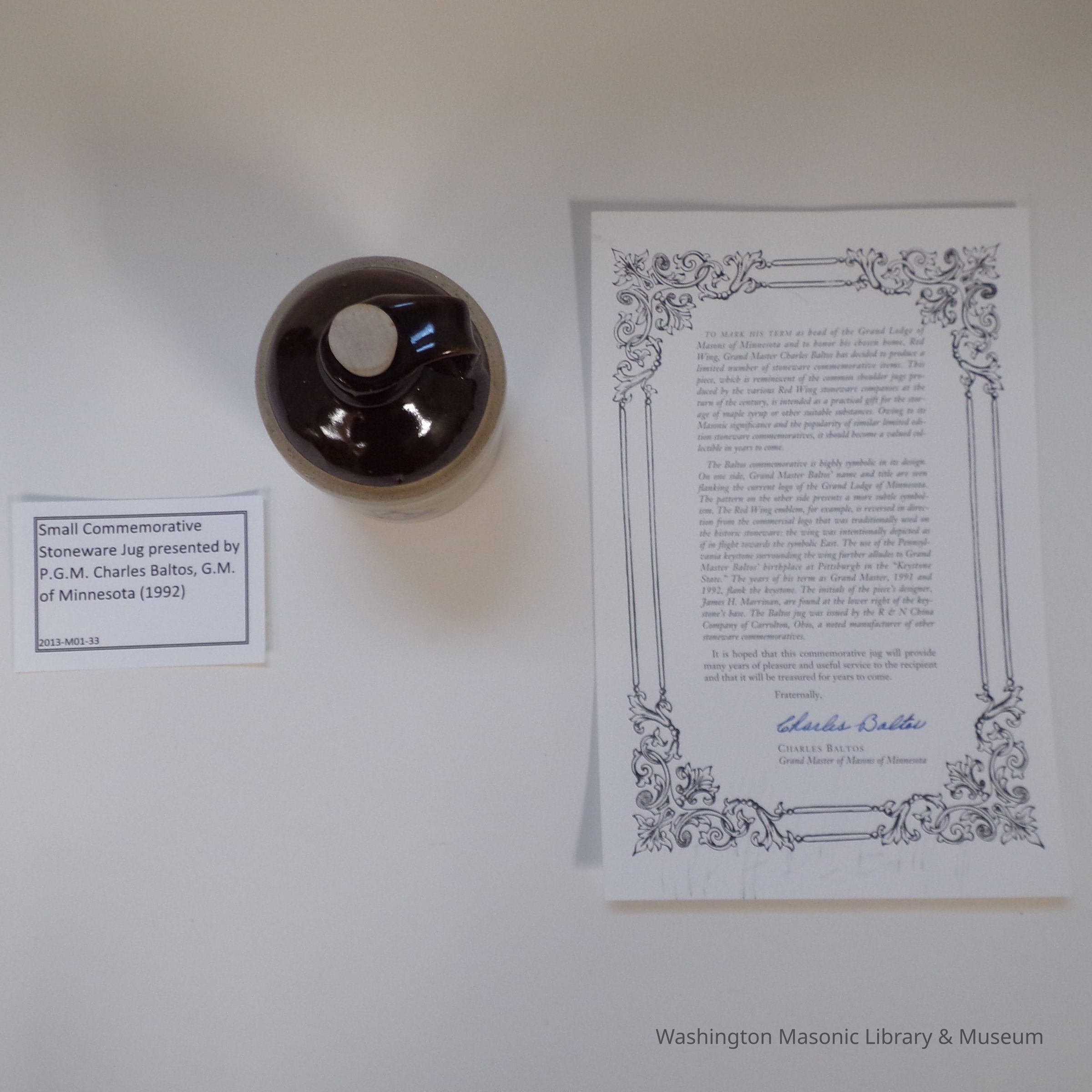 Jug: small commemorative stoneware jug presented by P.G.M. Charles Baltos, G.M. of Minnesota (1992).Entry/Object ID