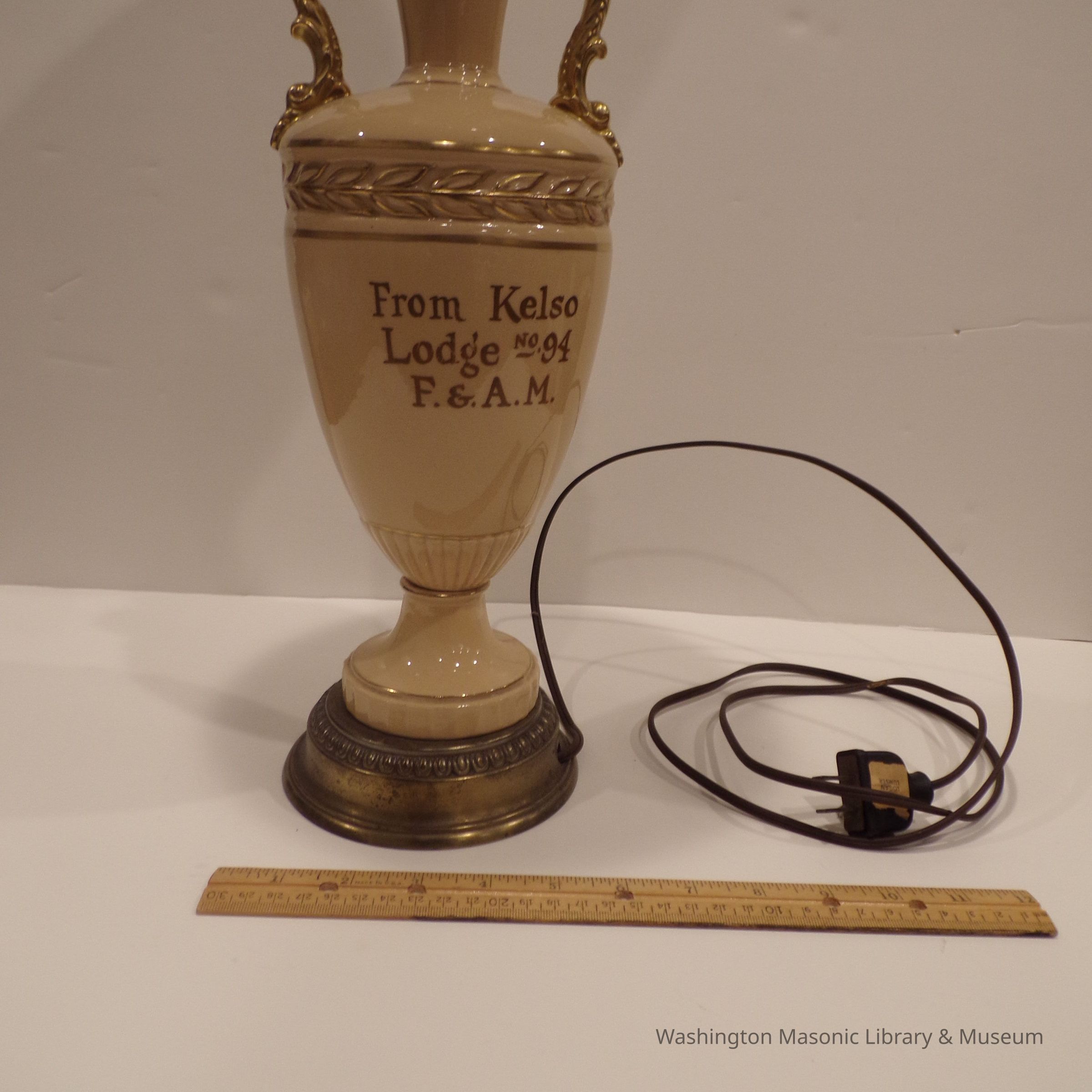 Lamp: Tan and gold. "From Kelso Lodge No. 94, F&AM."