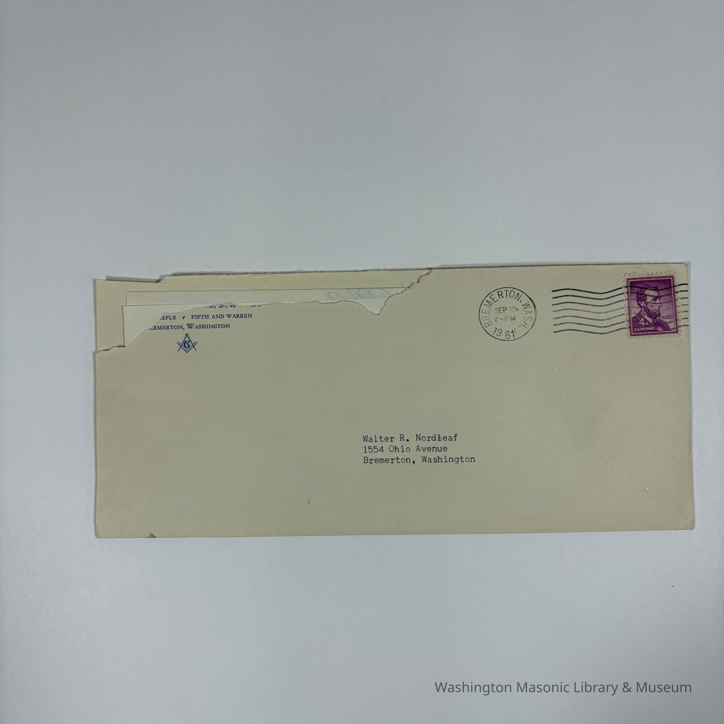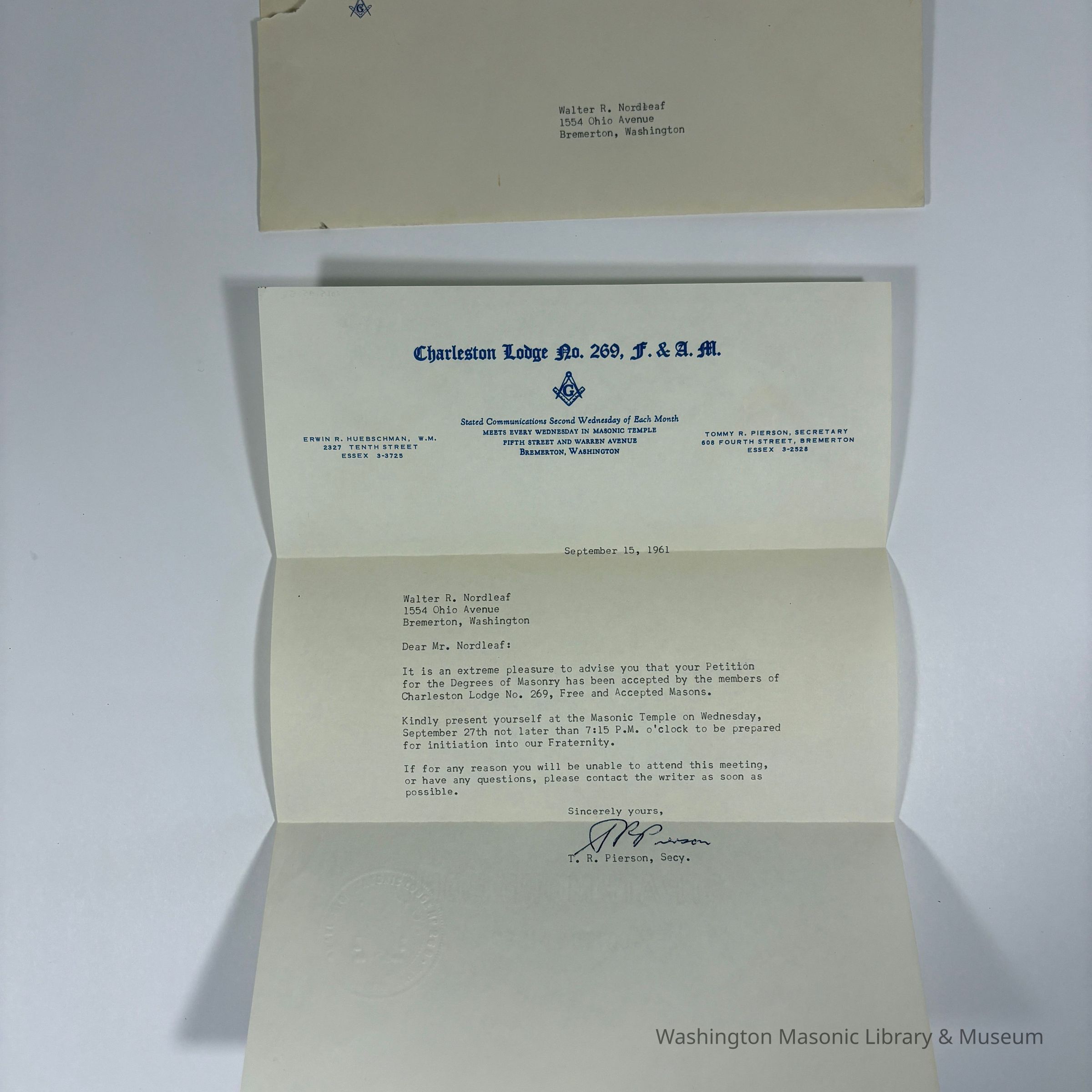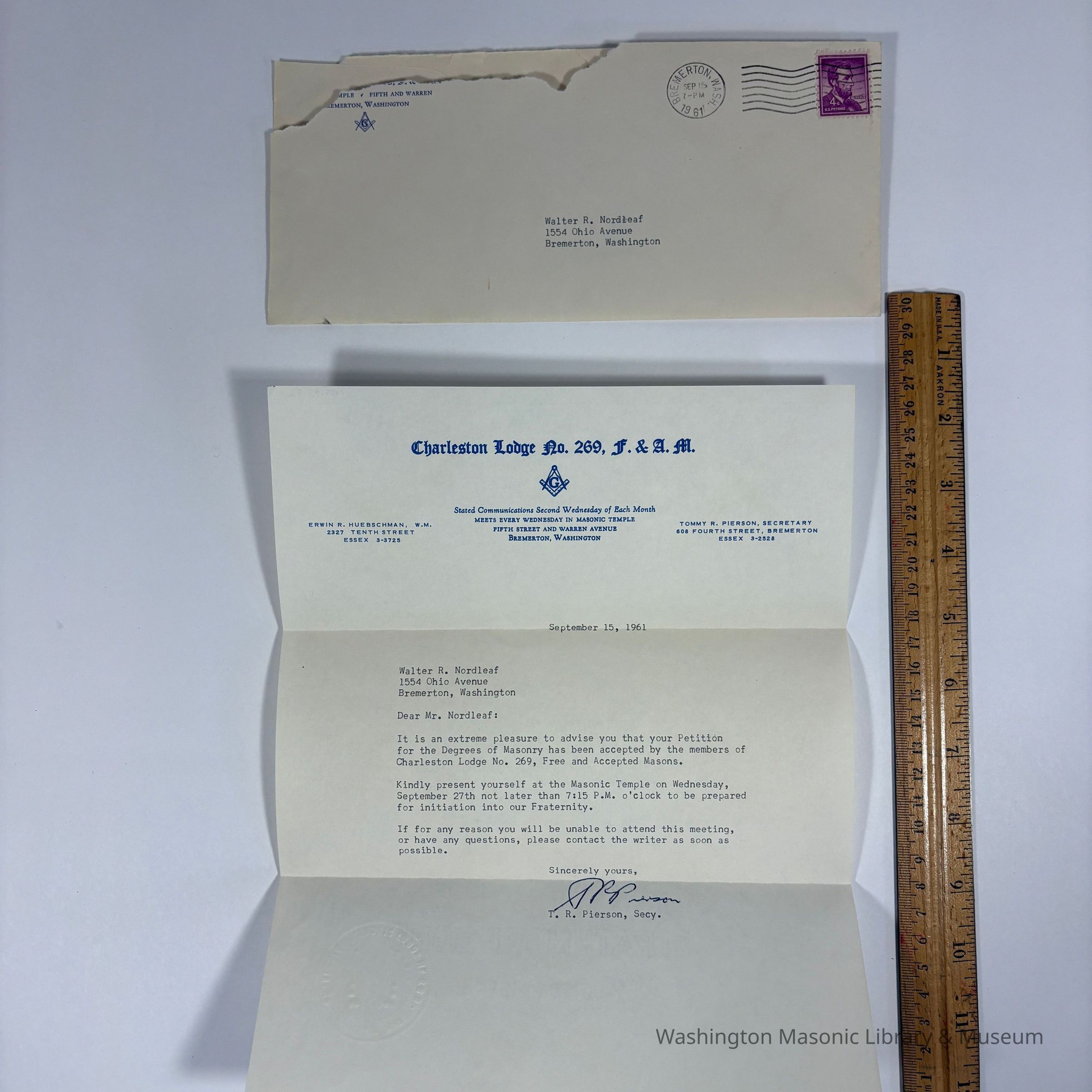 Letter: and envelope. From Charleston Lodge No. 269 to Walter R. Nordleaf stating that his Petition for the Degrees of Masonry has been accepted. Dated September 15, 1961.Entry/Object ID