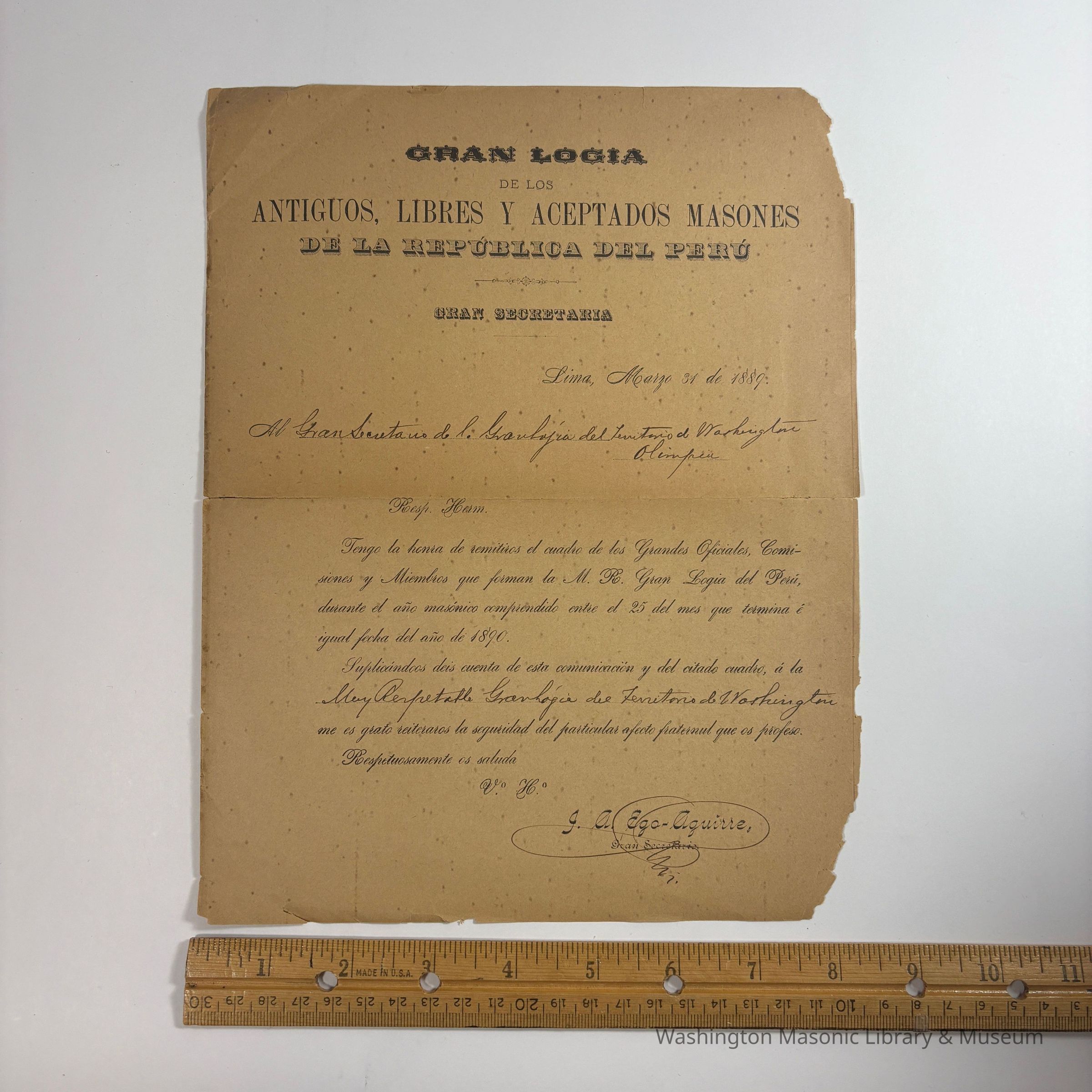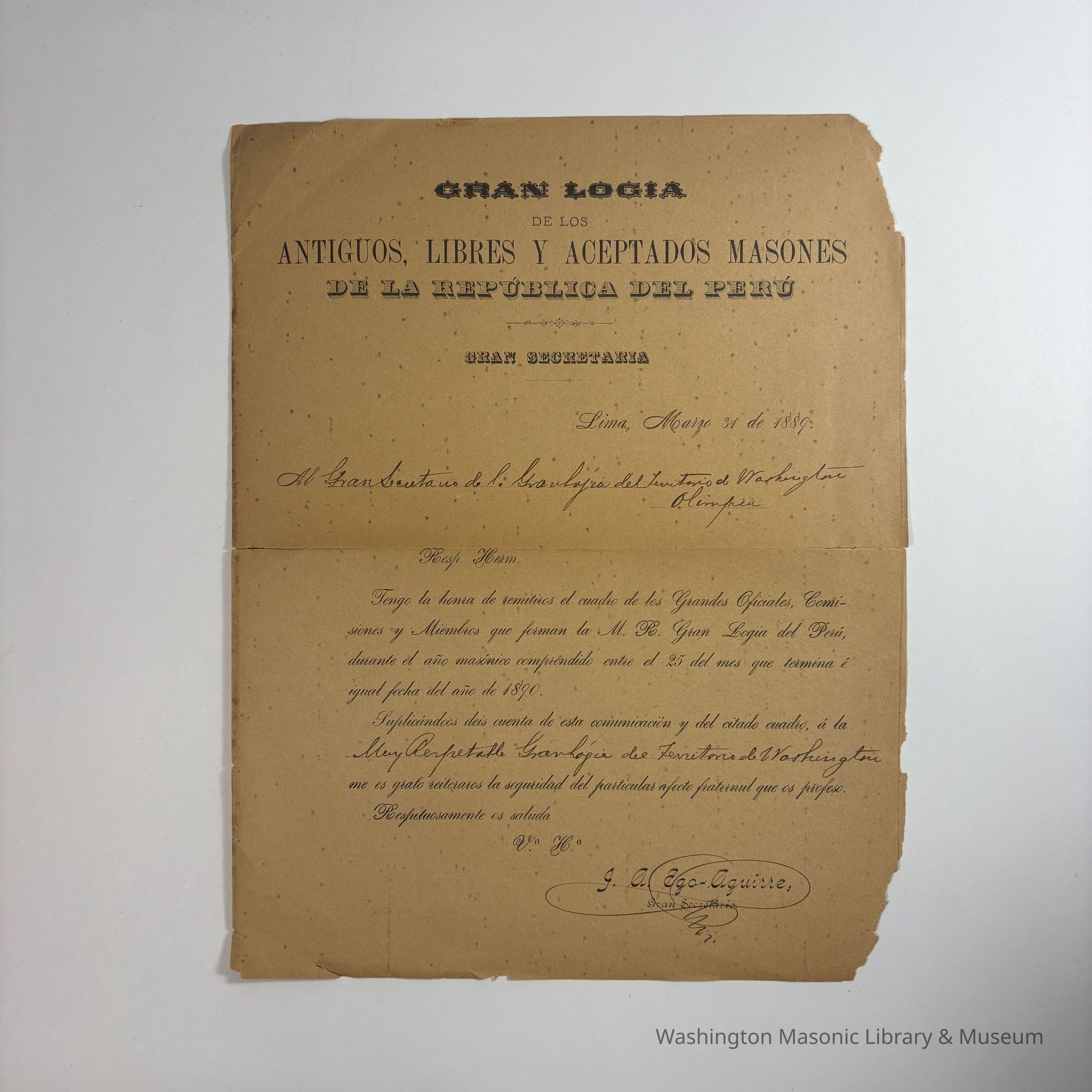 Letter: Correspondence from the Grand Lodge of Peru. Addressed to ' from the Gran Secretario J. A. Ego-Aguirre' of Peru, from the Gran Logia of Peru, located in Lima. Spanish introductory letter accompanying the Grand Lodge of Peru's proceedings, dated March 31, 1889.Collection