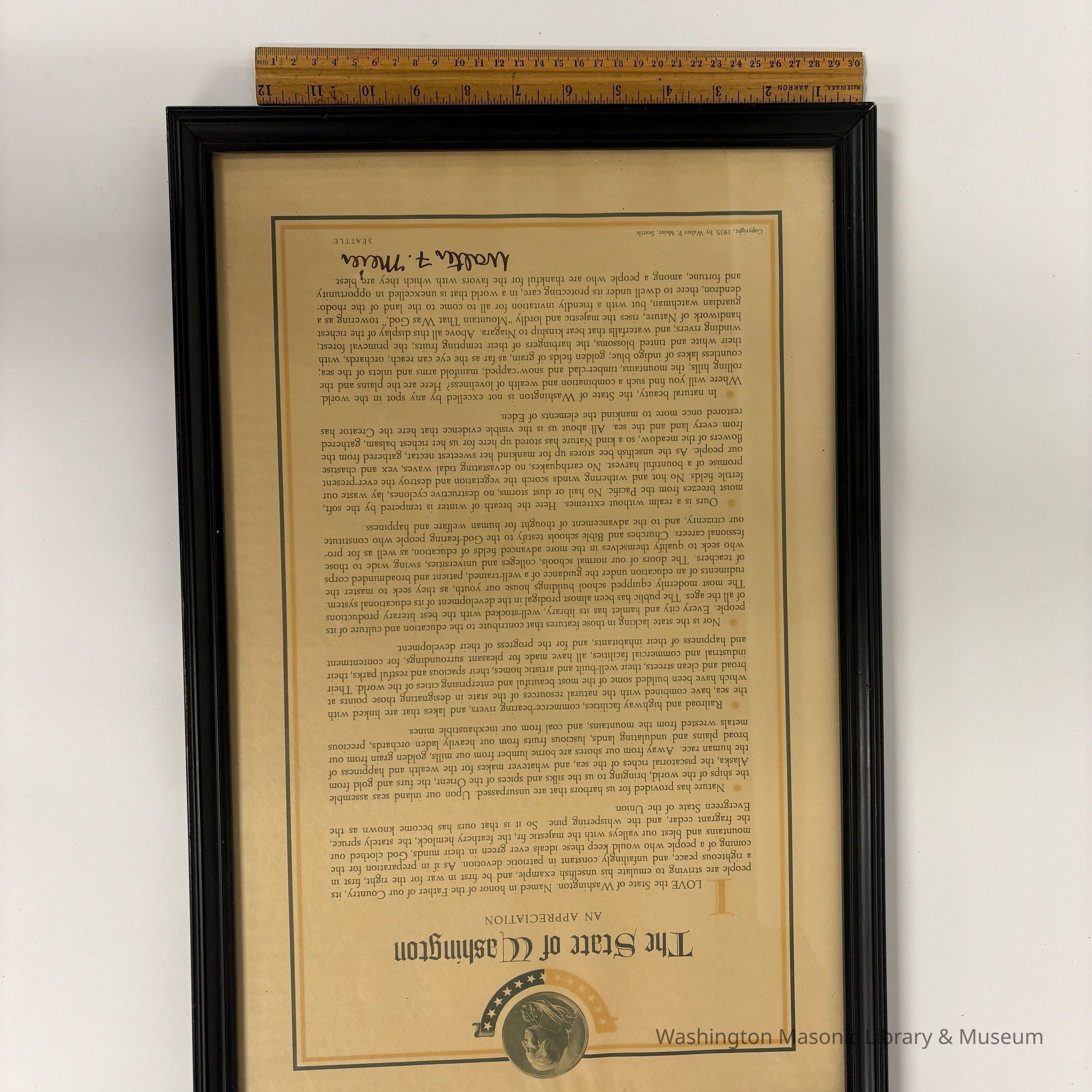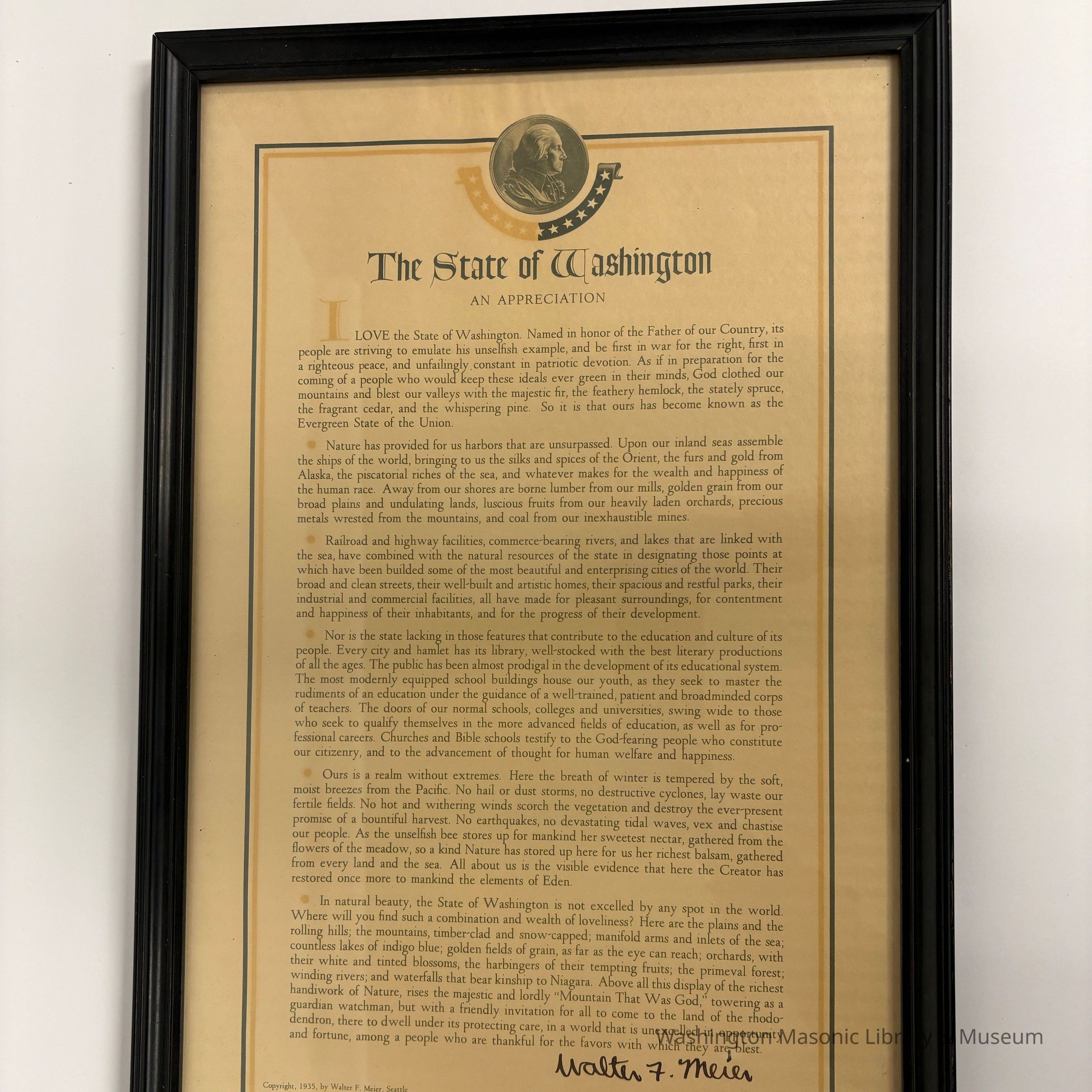 Letter: Framed. "The State of Washington: An Appreciation." by Walter F. Meier, PGM of Washington (1935)Entry/Object ID