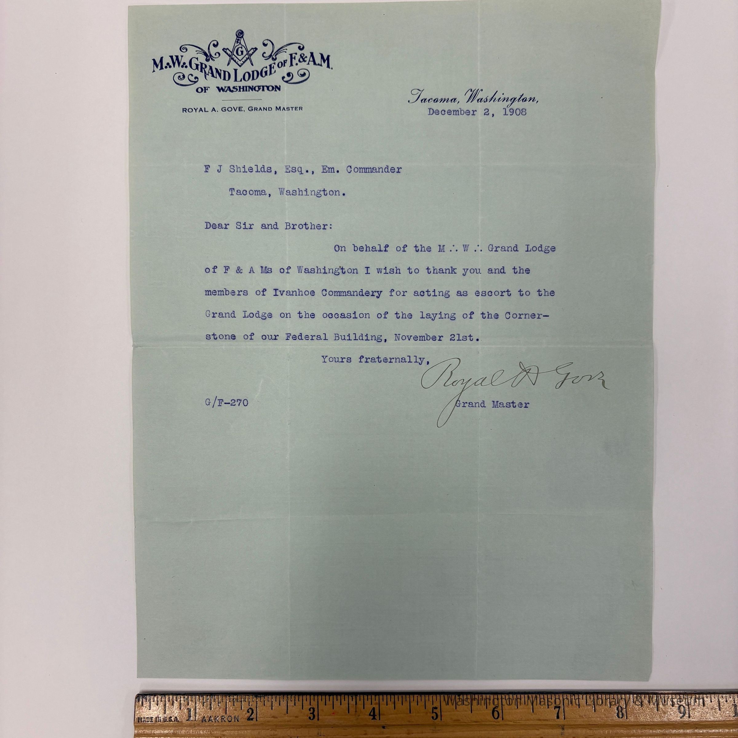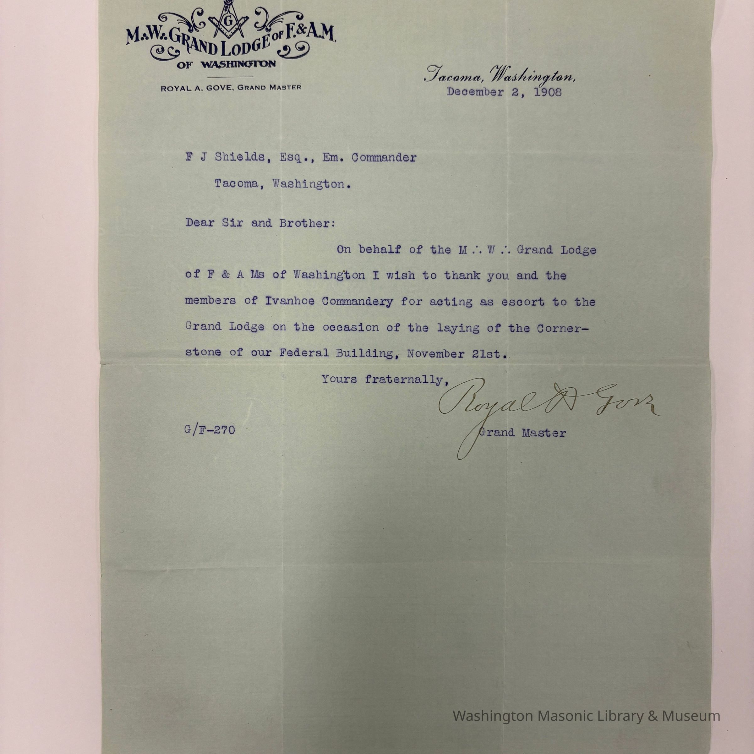 Letter: From Grand Secretary Royal A. Gove to F.J. Shields, dated December 2, 1908. Thanking Emminent Commander Shields "for acting as escort to the Grand Lodge on the occasion of the laying of the cornerstone of our Federal Building, November 21st." (1908)Collection