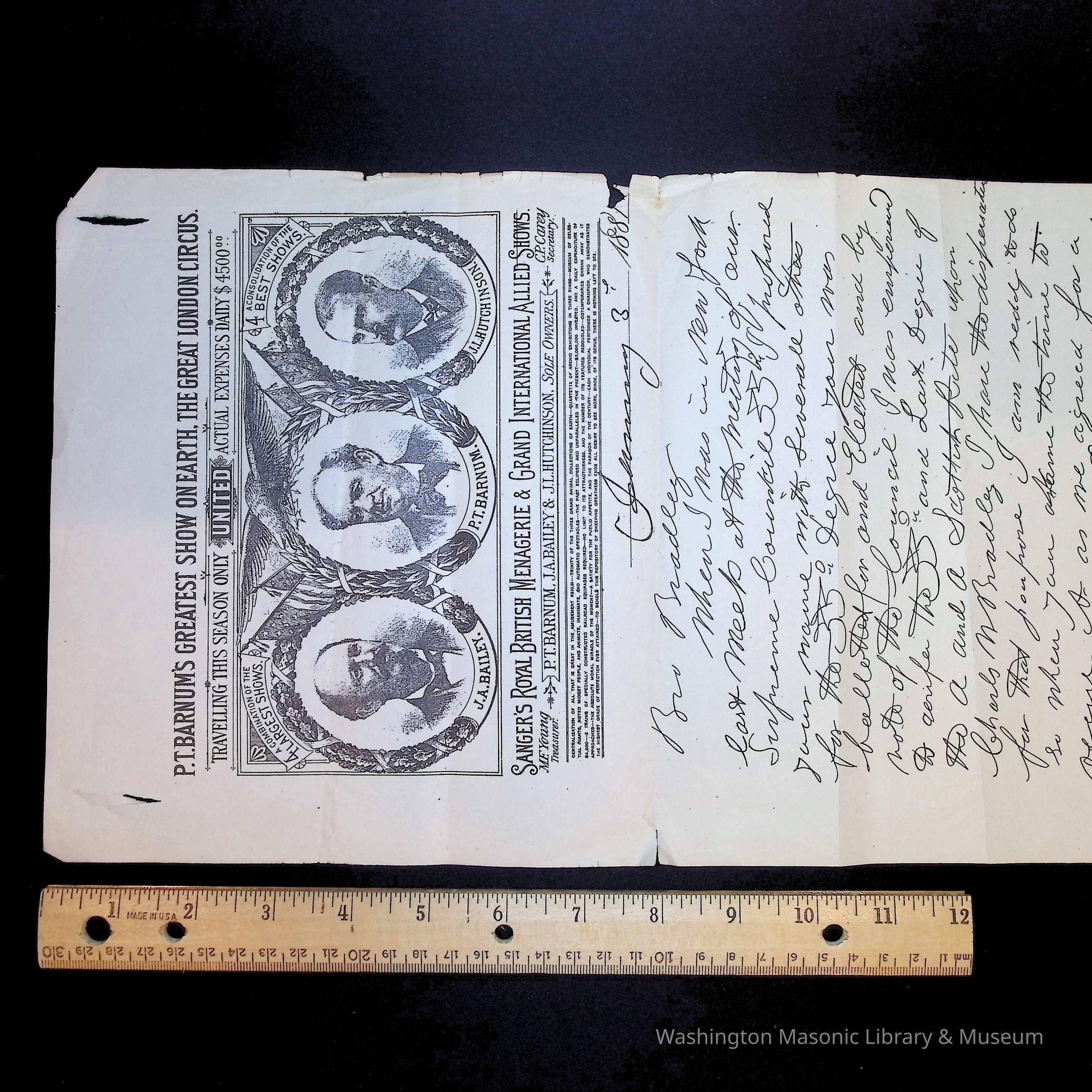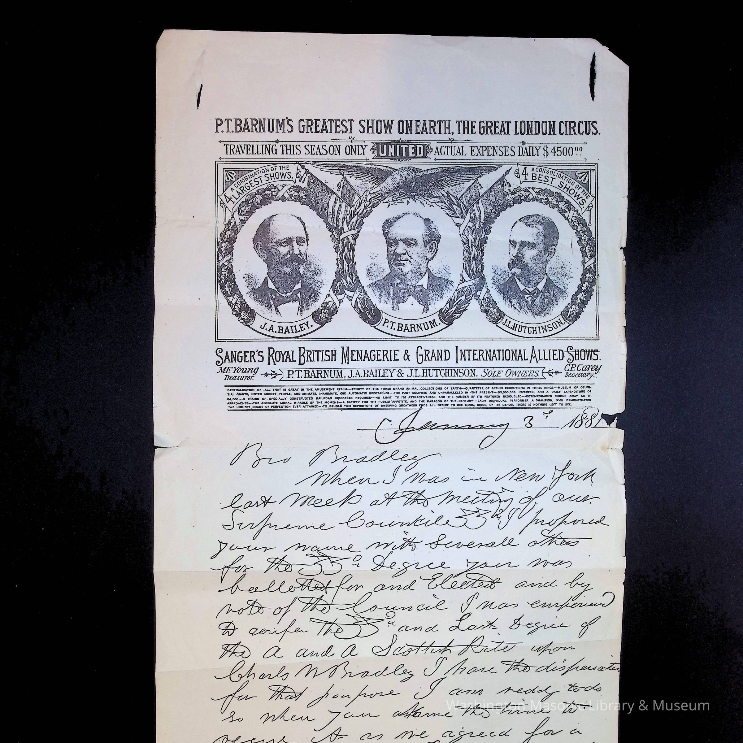 Written on stationary advertising P.T. Barnum's Greatest Show on Earth, The Great London Circus.