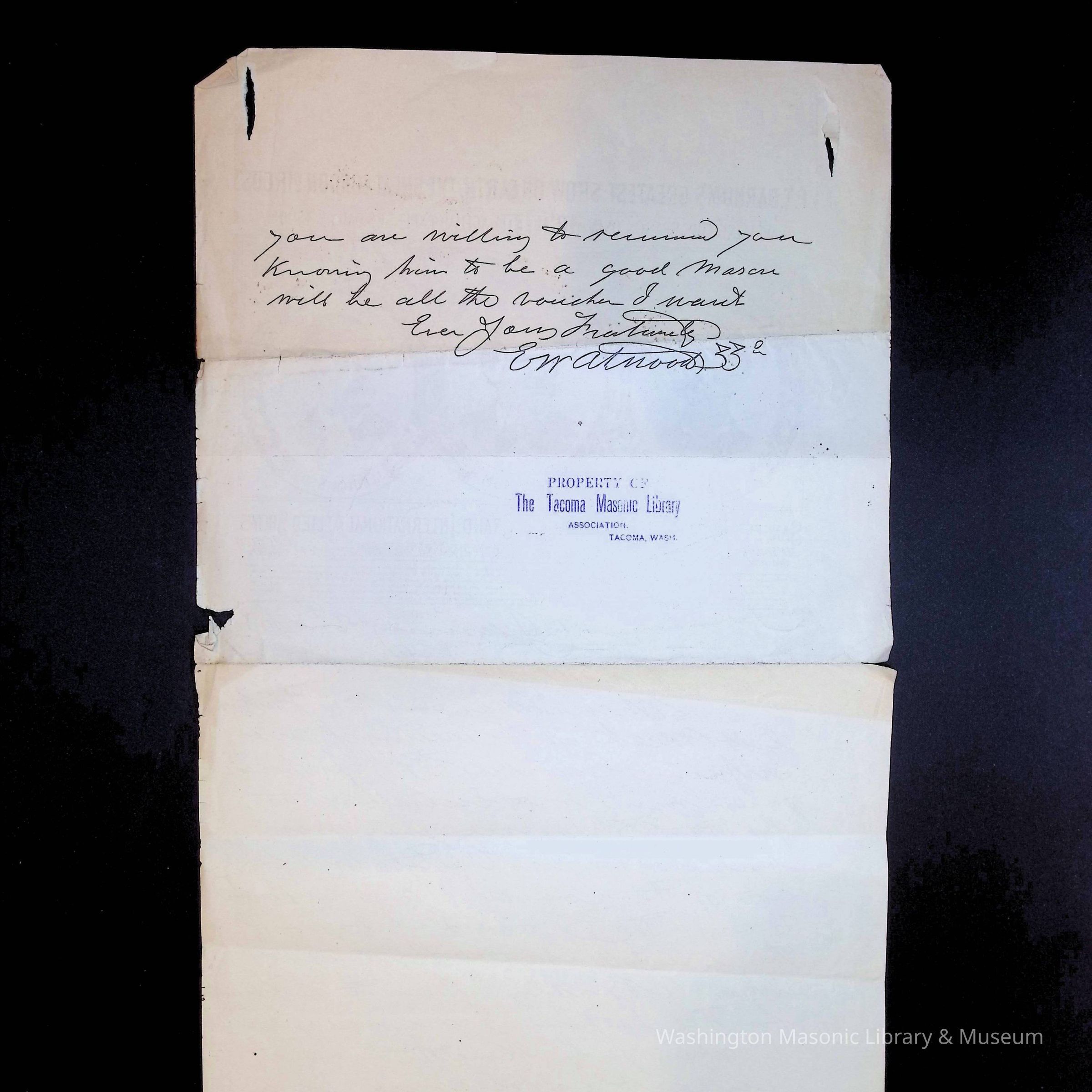 Letter: To "Bro Bradley" from E.W. Atwood, 33 Degree Mason. (1881)Entry/Object ID