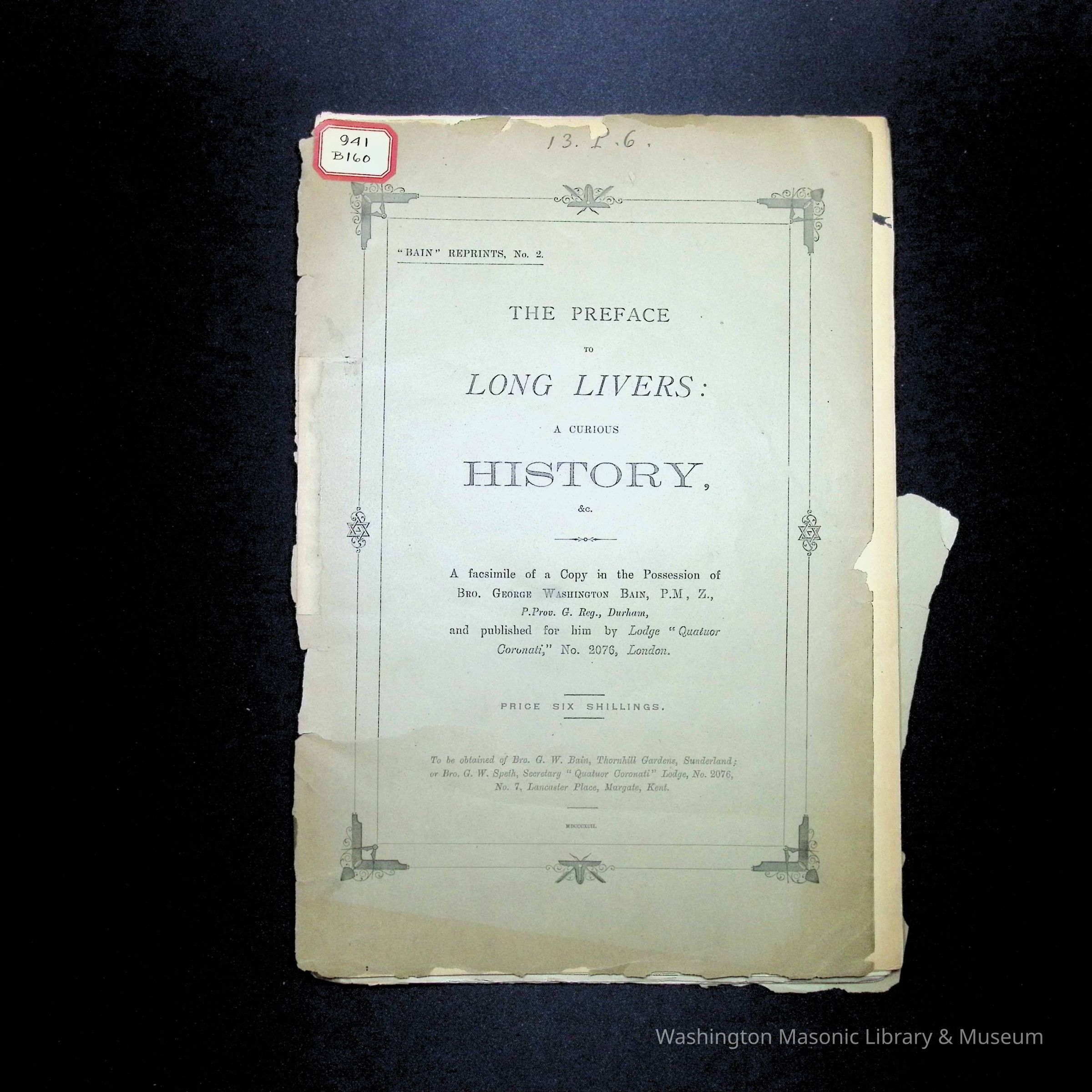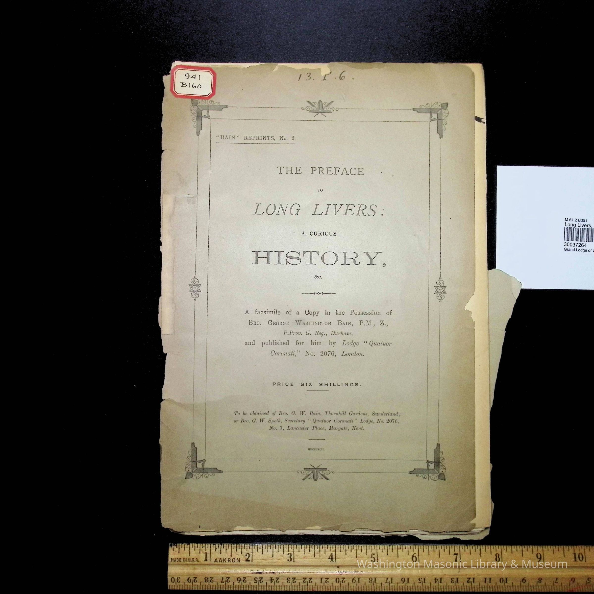 A Facsimile of a copy in the posession of Bro. George Washington Bain, P.M., Z., P. Prov., G. Reg., Durham, and published for him by Lodge "Quatuor Coronati," No. 2076, London.Collection