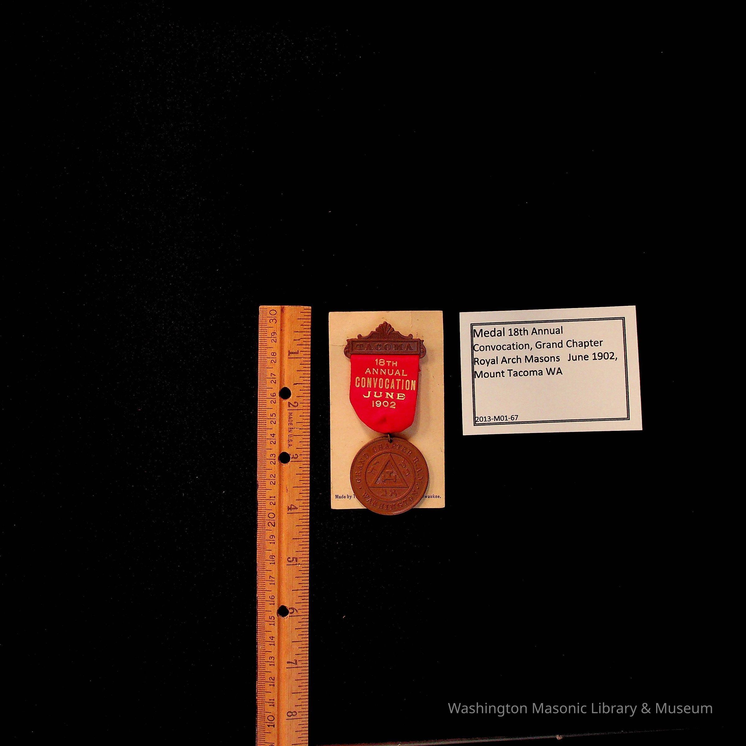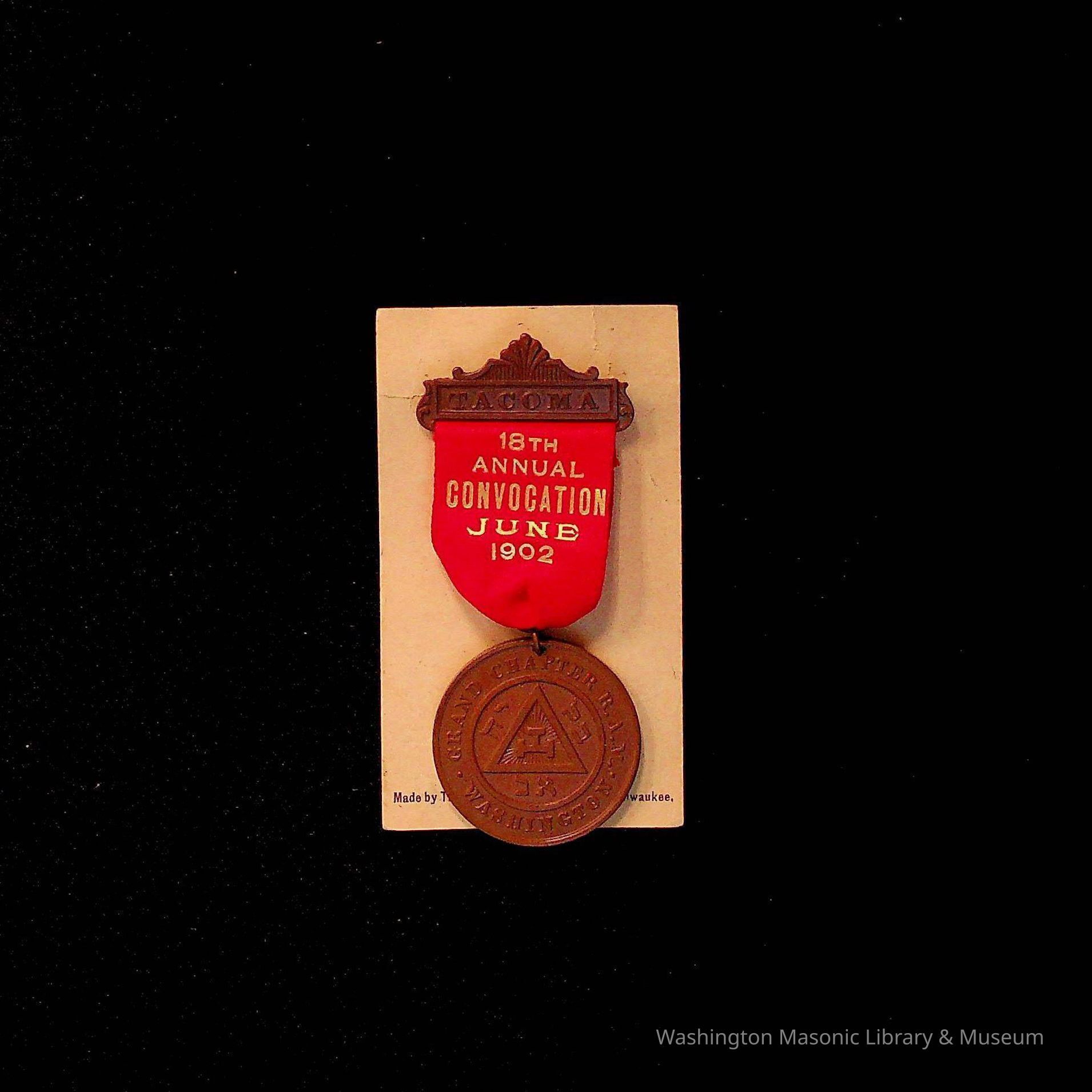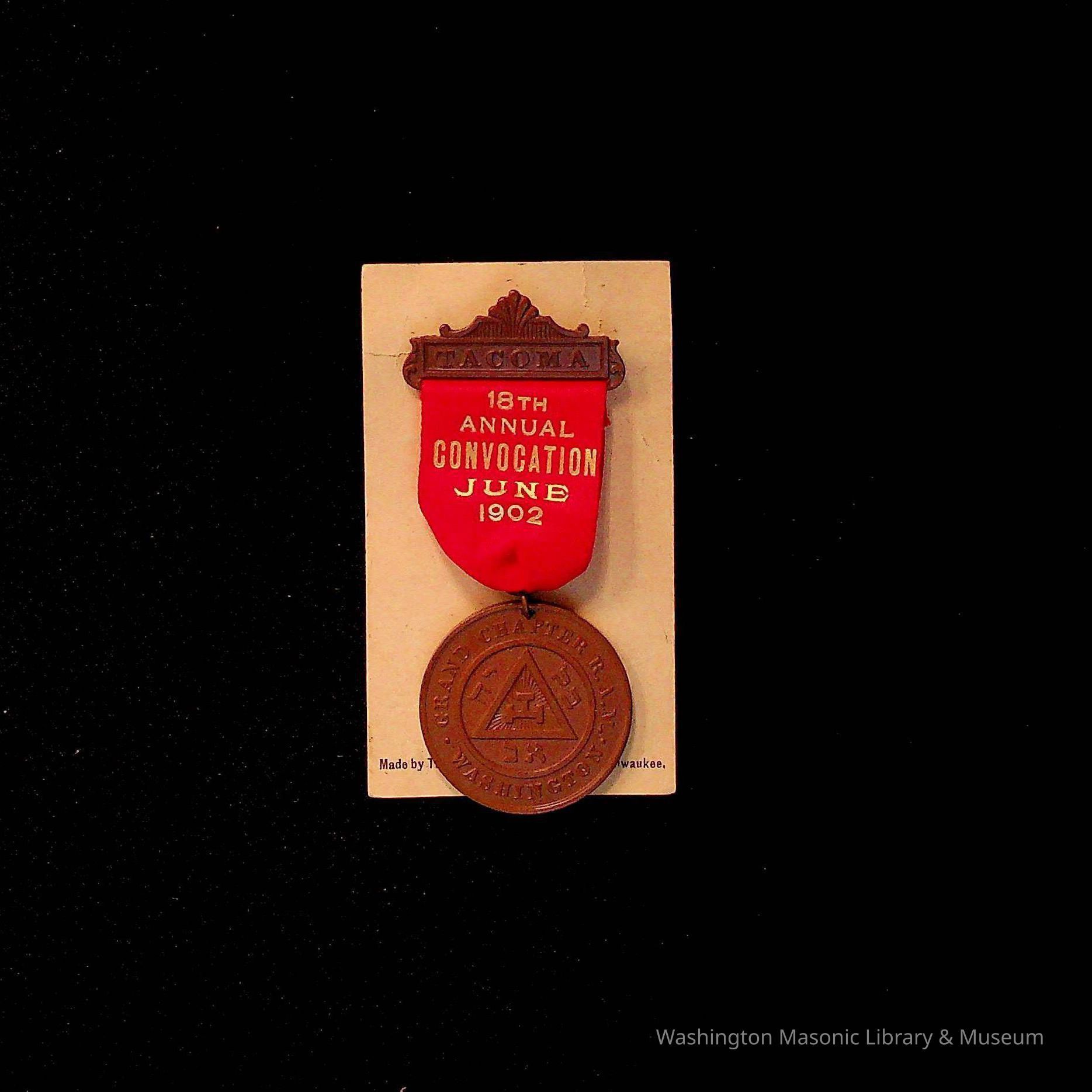 Medal: 18th Annual Convocation Grand Chapter R.A.M. Tacoma, 1902. Royal Arch Masons. Bronze color medal with red ribbon. On the back of medal is a picture of "Mount Tacoma" (now called Mount Rainier). Pinned to a piece of paper that reads "Made by Schwaab Stamp and Seal Co, Milwuakee"Collection