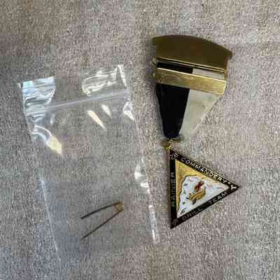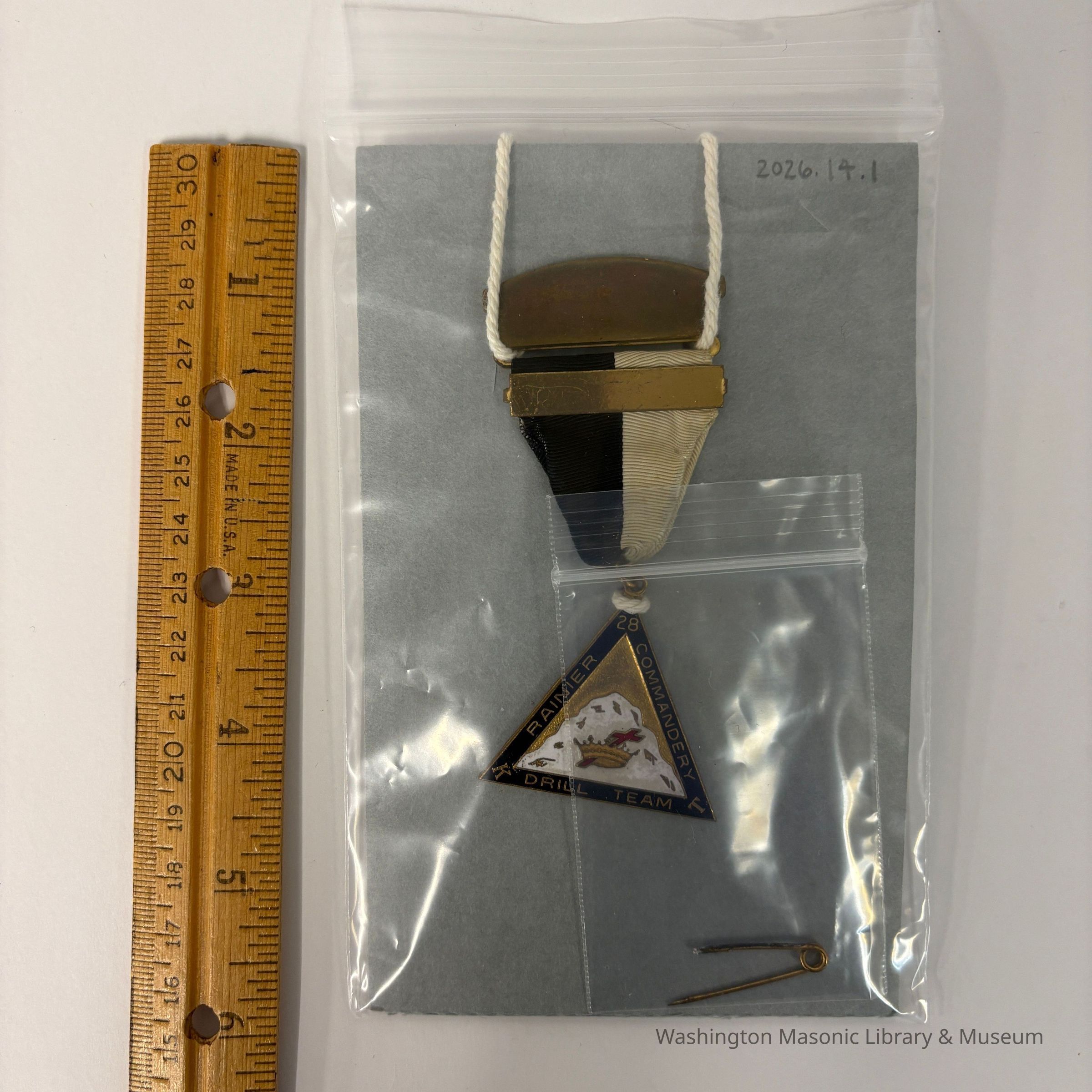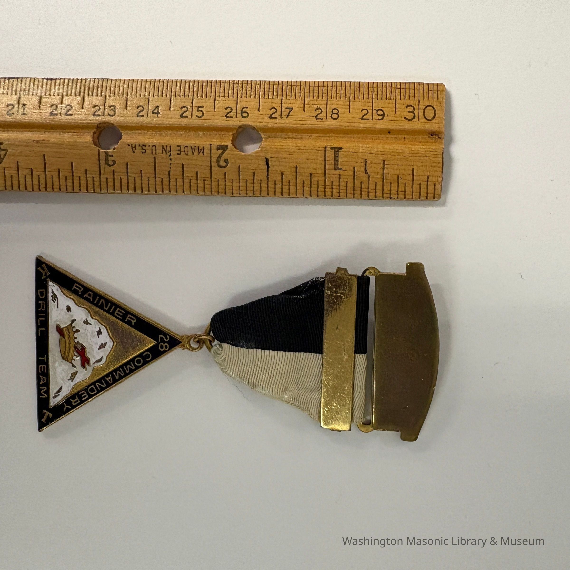 Medallion: Knights Templar. Black and white ribbon, triangular hanging ornament. Rainier Commandery No. 28 Drill Team.Collection