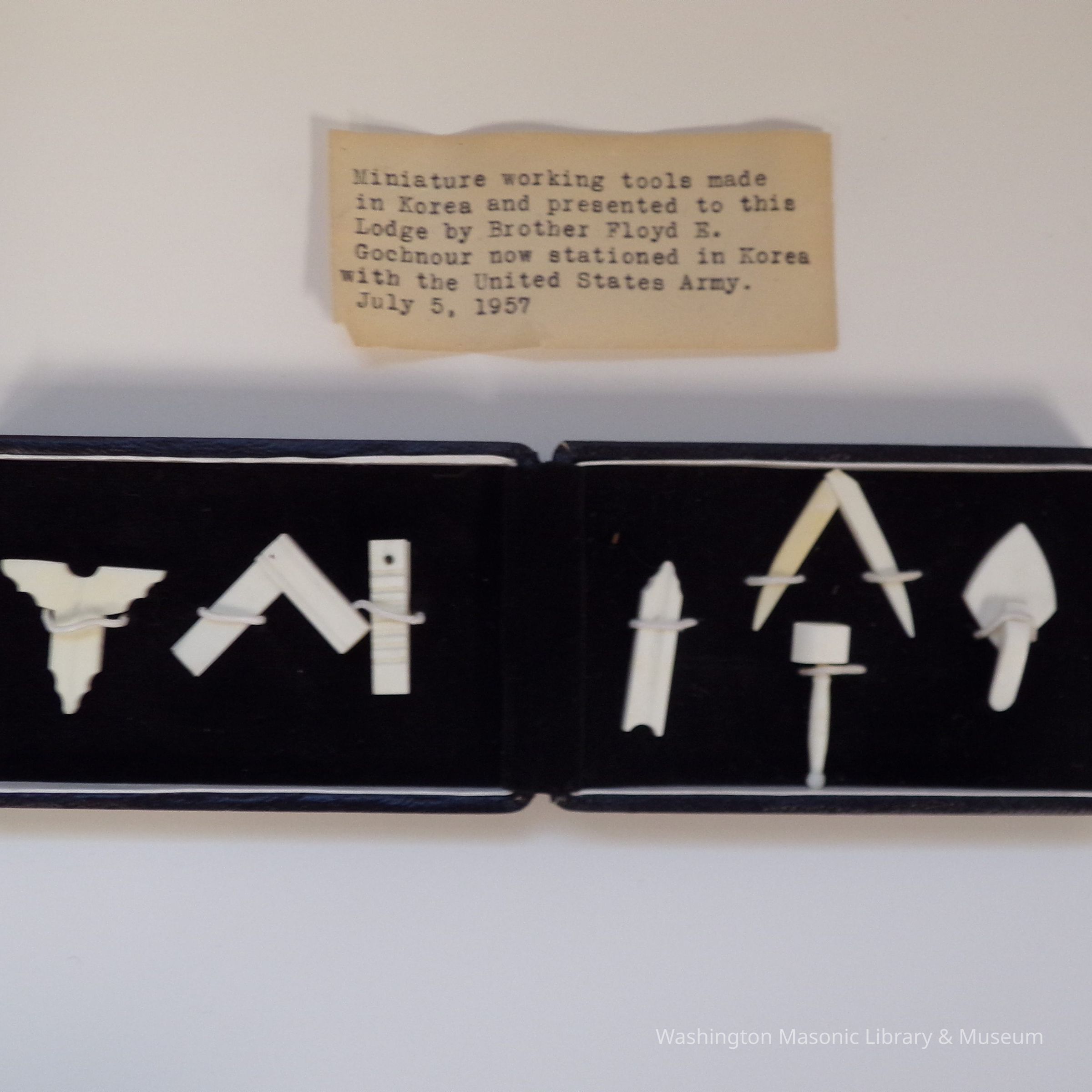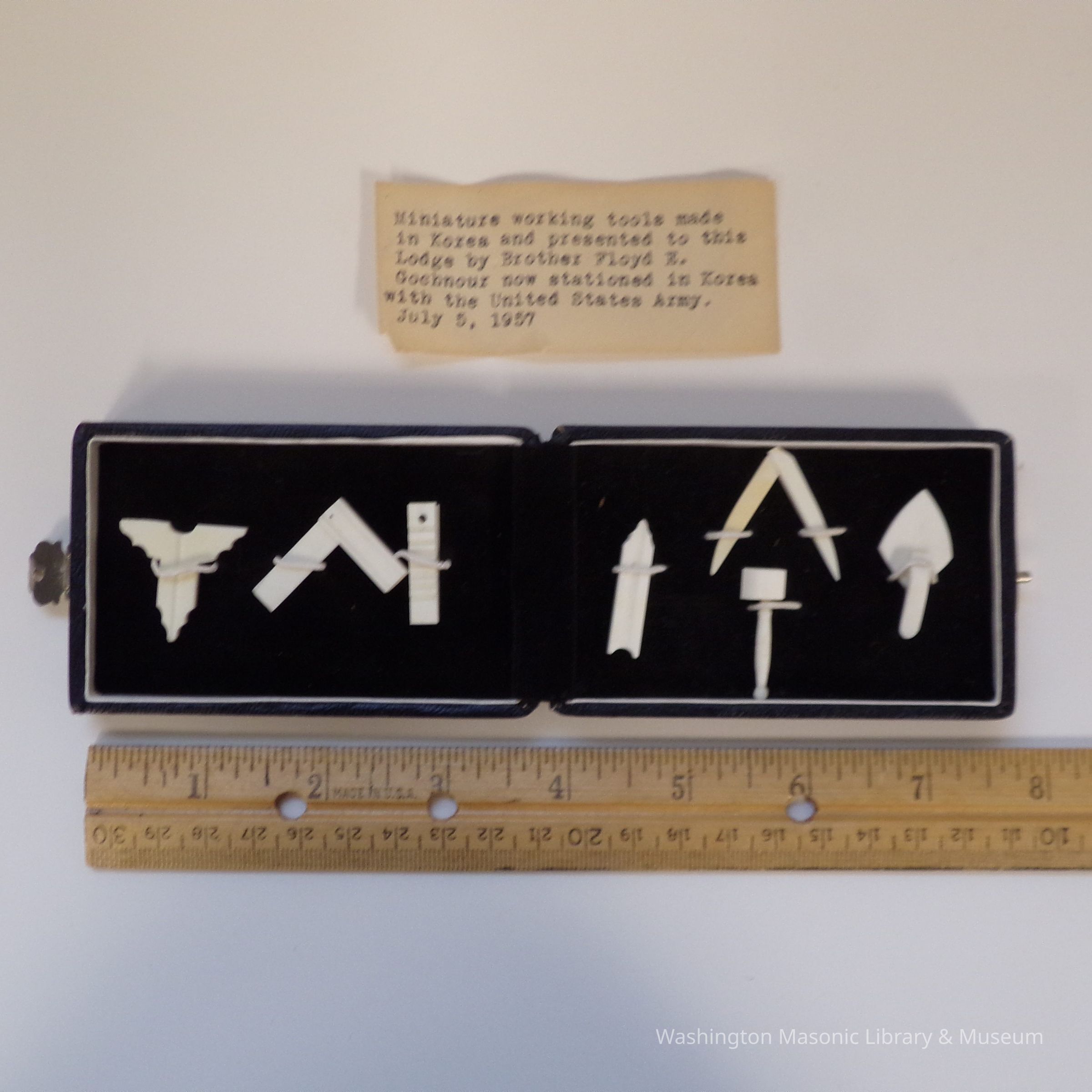 Miniature Working Tools: "Miniature working tools made in Korea and presented to this lodge by Brother Floyd E. Gochnour now stationed in Korea with the US army. July 5, 1957" Tools are made of ivory.