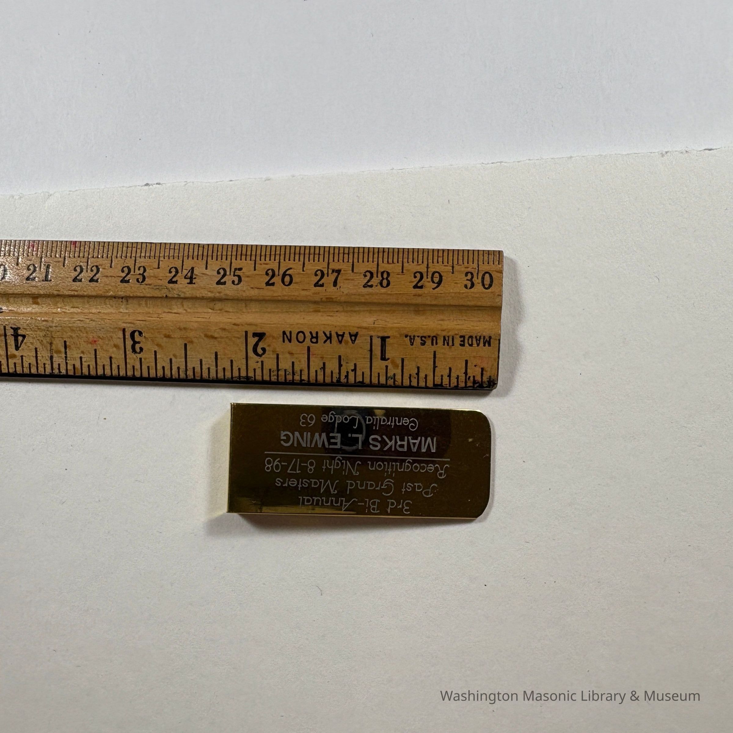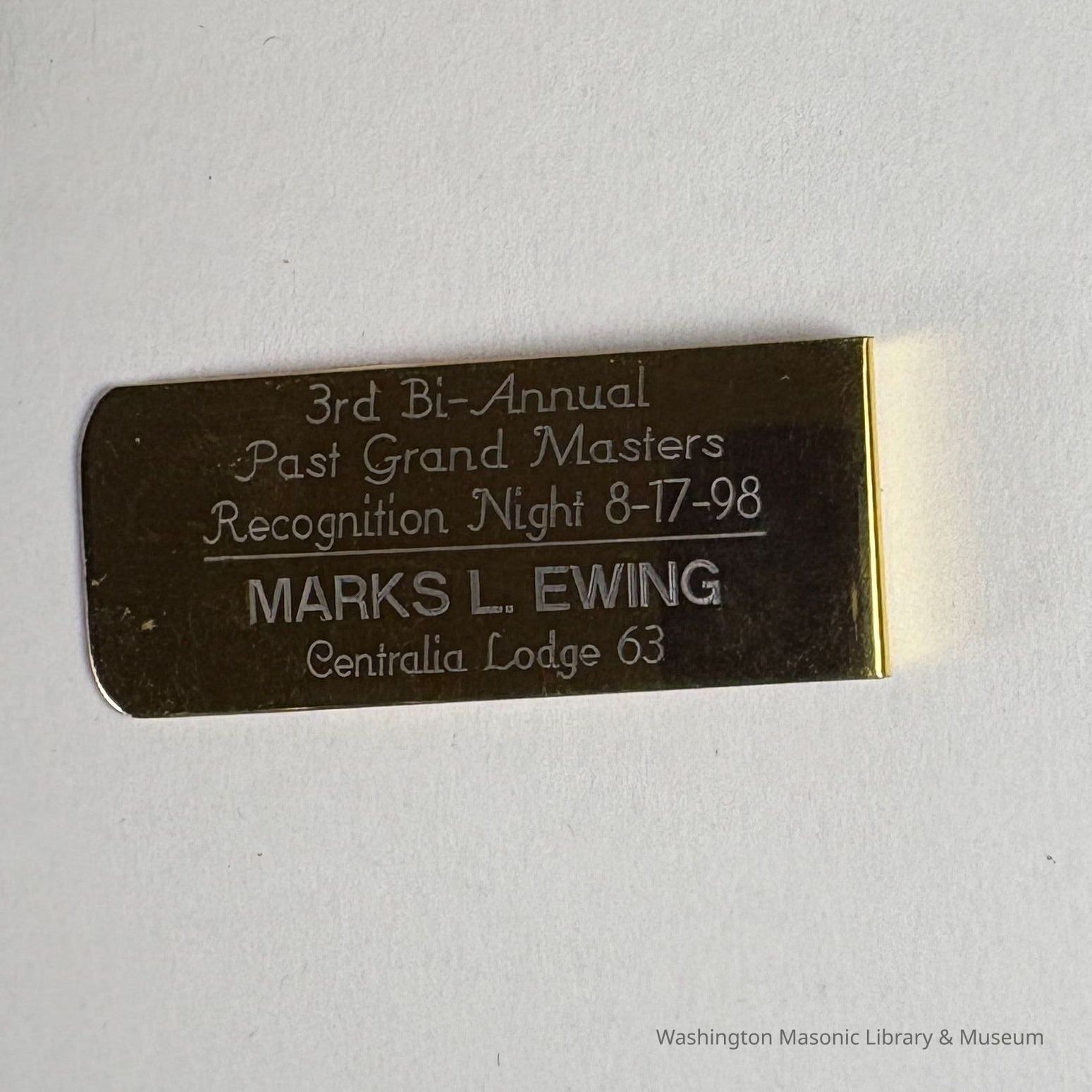 Money Clip: Gold. "3rd Bi-Annual Past Grand Masters Recognition Night 8-17-98/Marks L. Ewing/Centralia Lodge 63". Marks L. Ewing was Grand Master 1987-1988.Dimensions