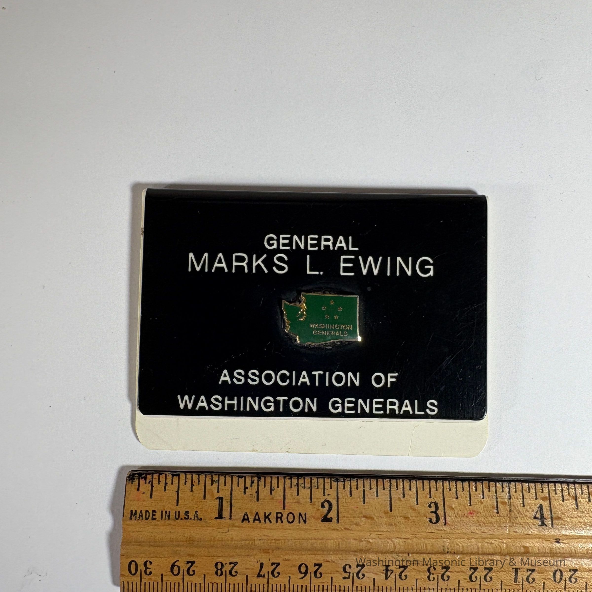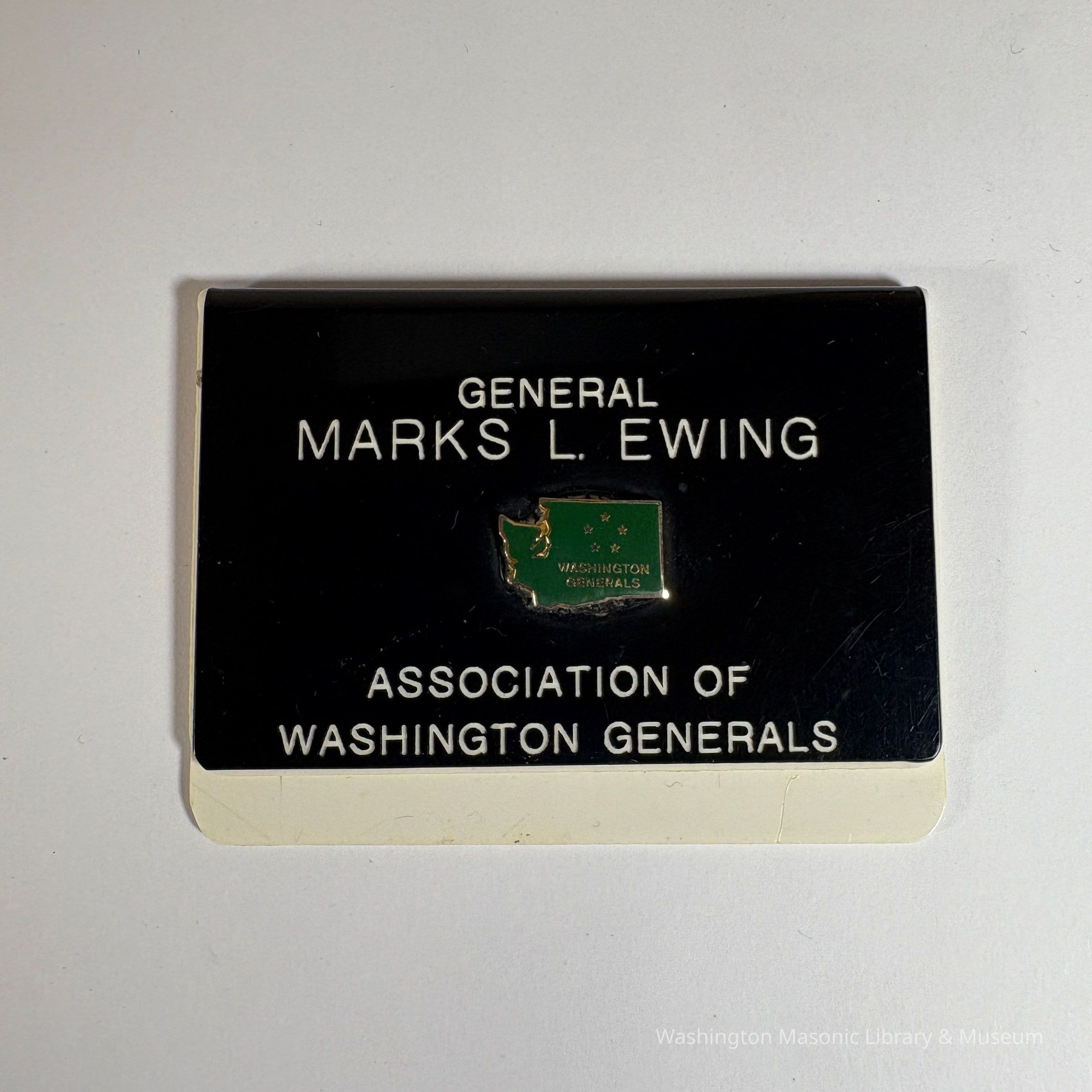 Name Tag: Black with white lettering. "General Marks L. Ewing/Association of Washington Generals" Late 20th Century.Dimensions
