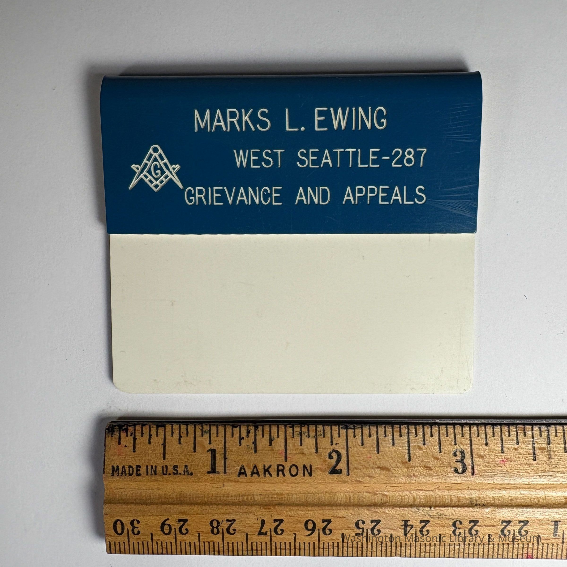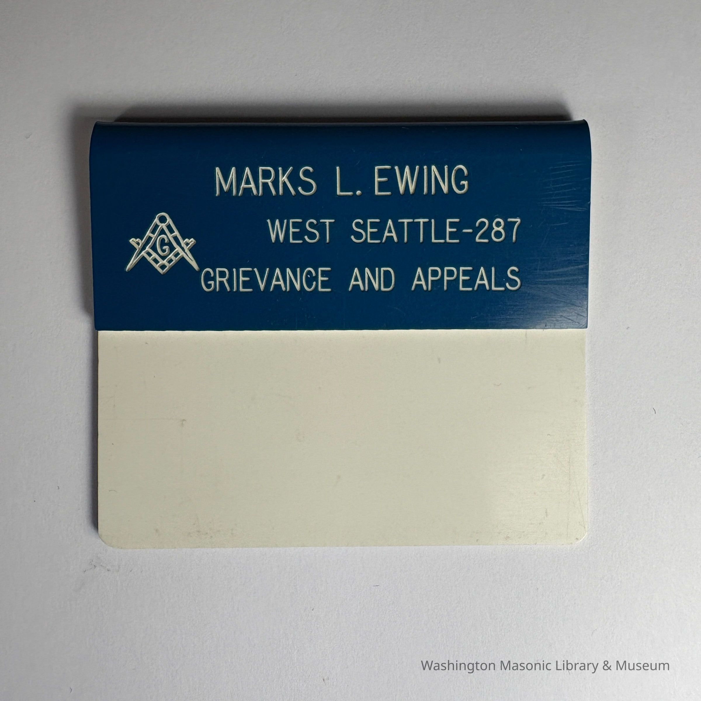 Name Tag: "Marks L. Ewing/West Seattle 287/ Grievance and Appeals" Late 20th Century.Entry/Object ID