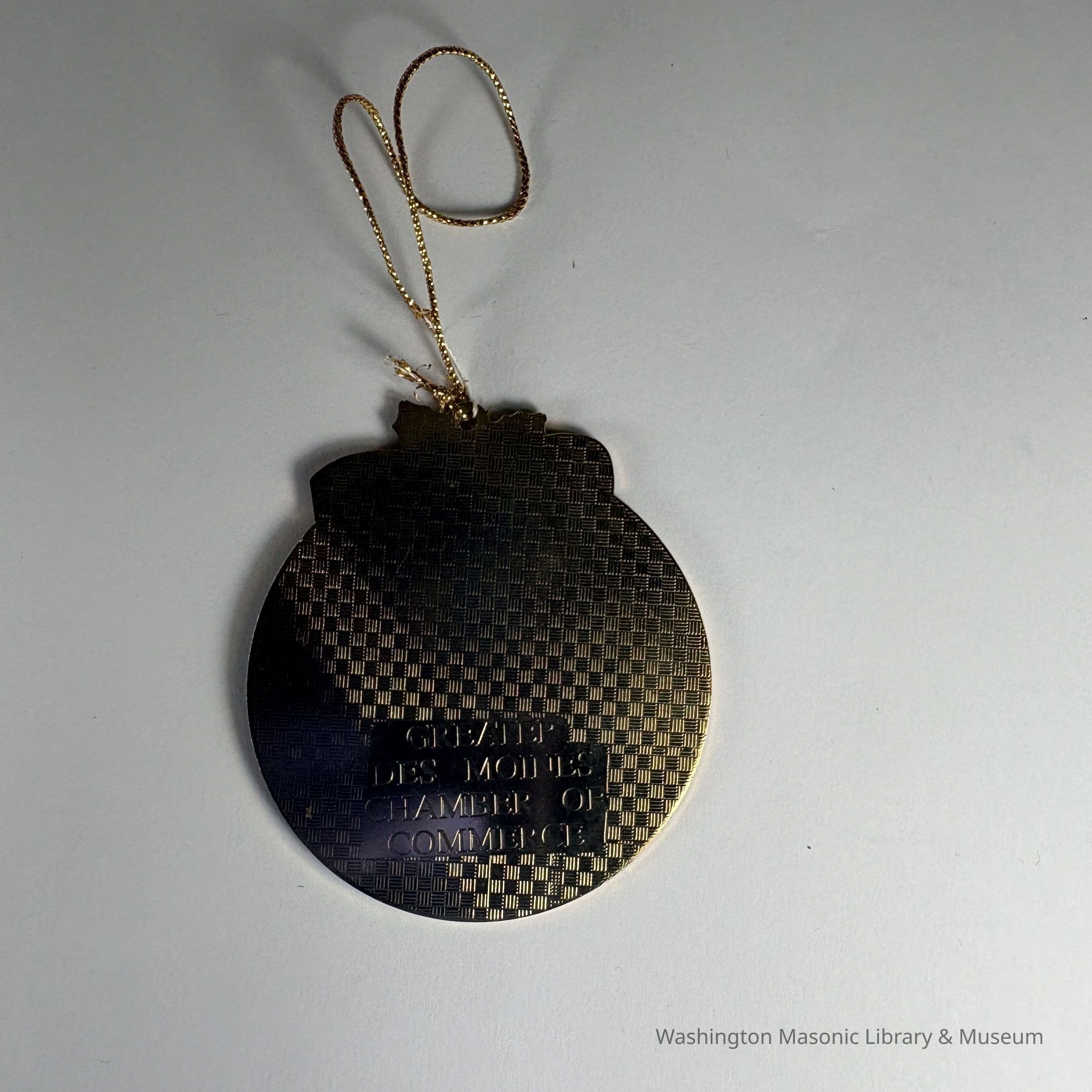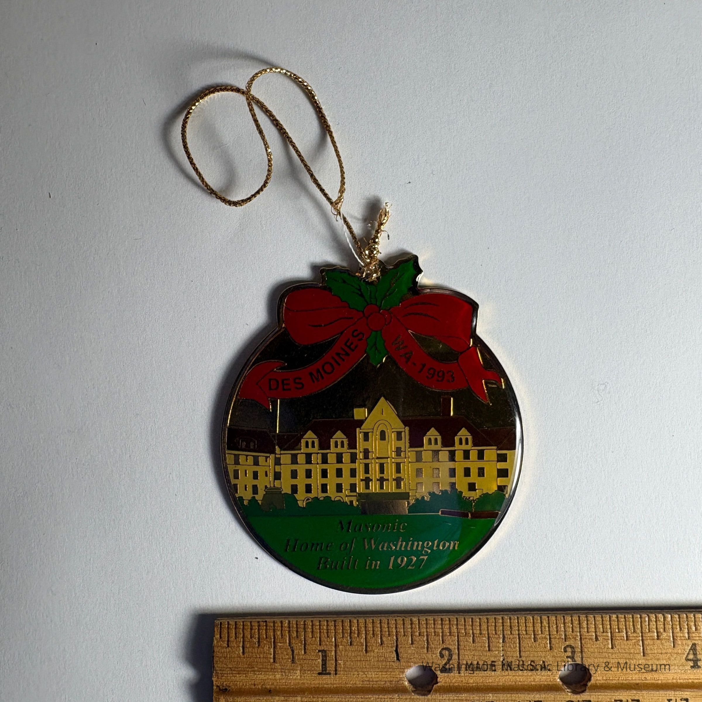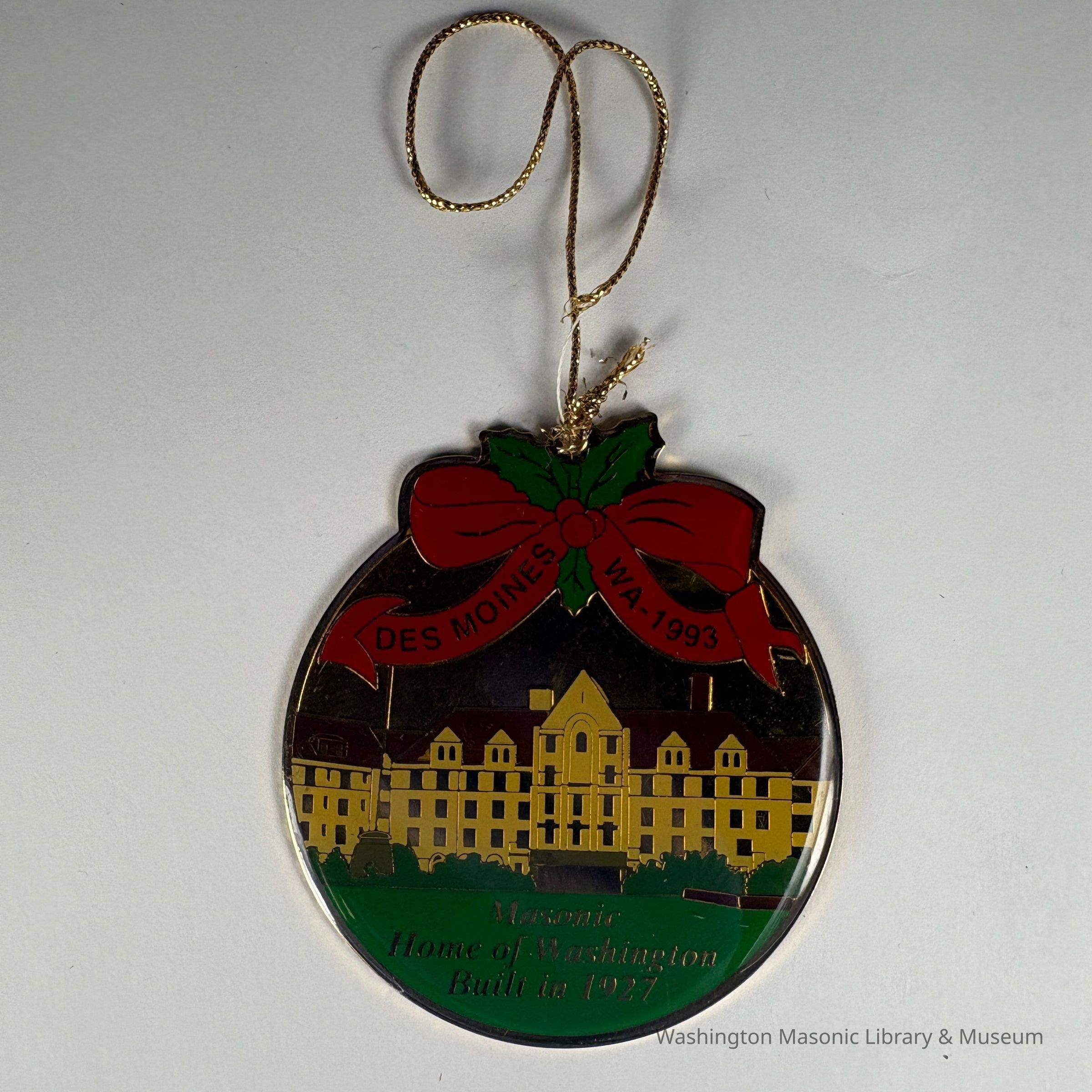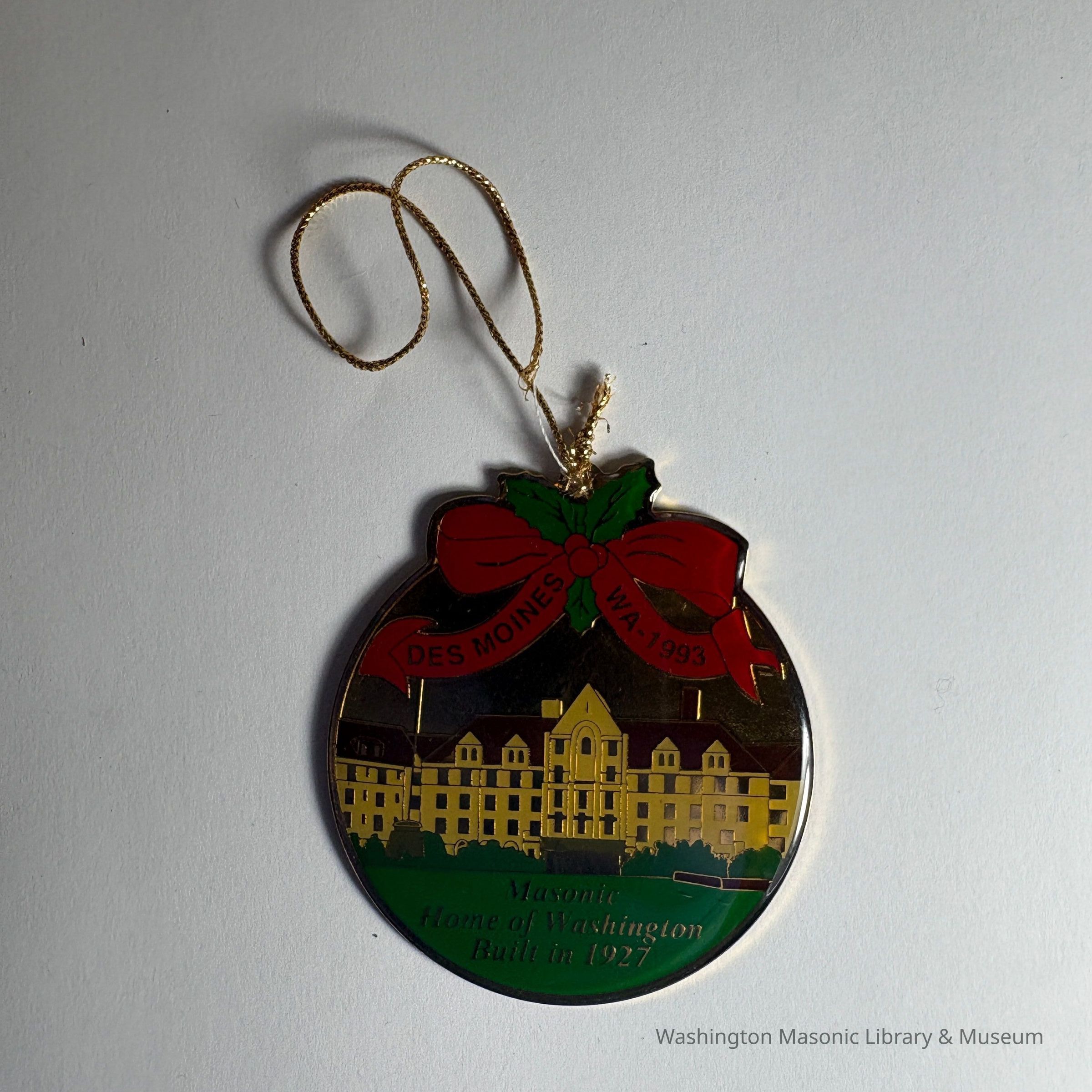 Ornament: Christmas Ornament. Circular. Depicts Masonic Retirement Center. "Des Moines/WA-1993/Masonic Home of Washington/Built 1927"