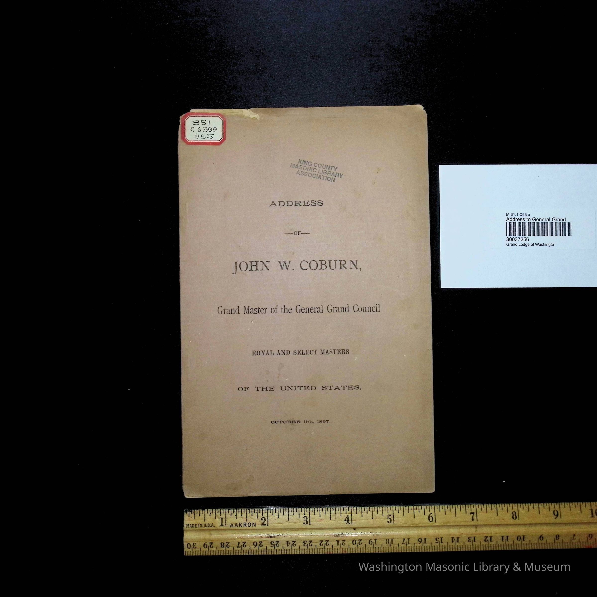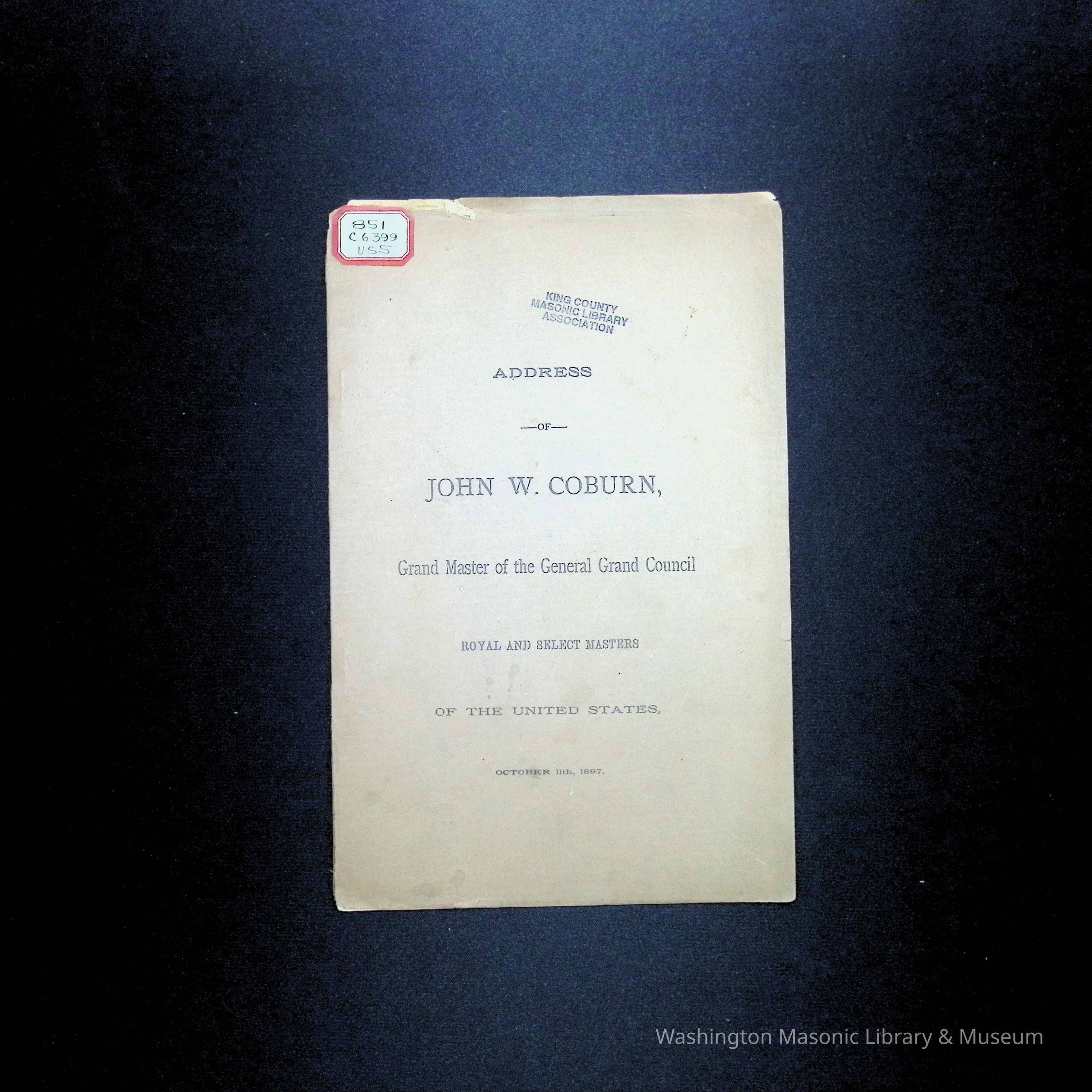 Pamphlet: Address of John W. Coburn, Grand Master of the General Grand Council Royal and Select Masters of the United States (October 11th, 1897)Entry/Object ID