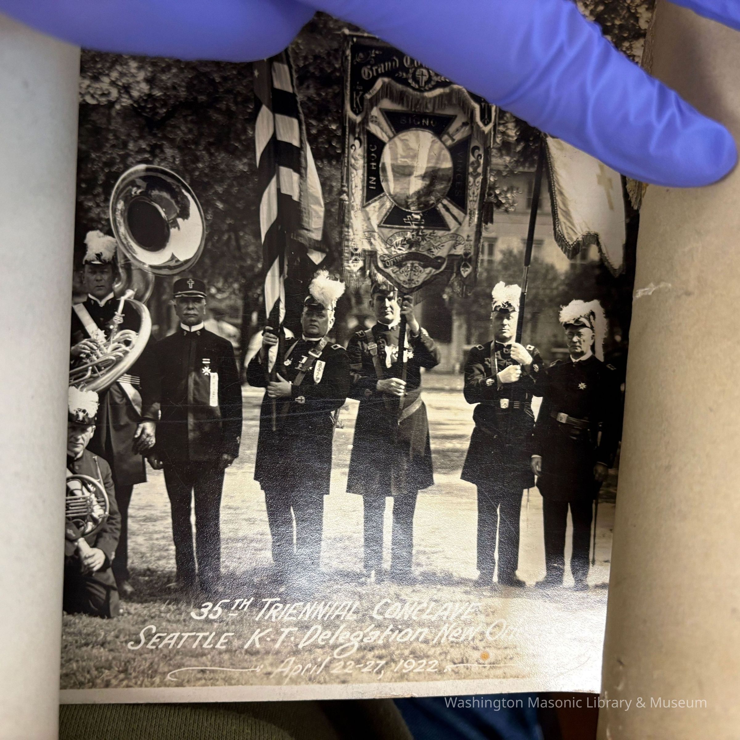 Panorama: 35th Triennial Conclave. Drill Team, Seattle Delegation. New Orleans April 22-27, 1922. Men in regalia standing, women seated in front of them. (1922)Collection