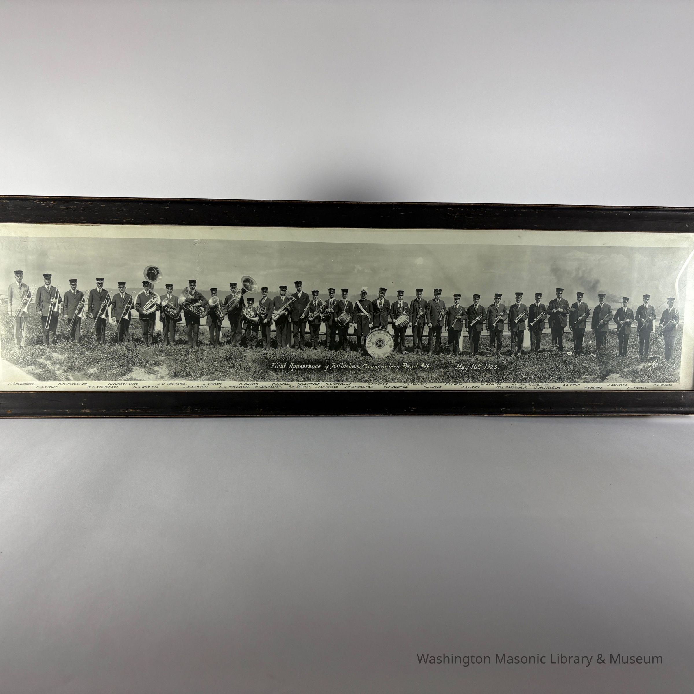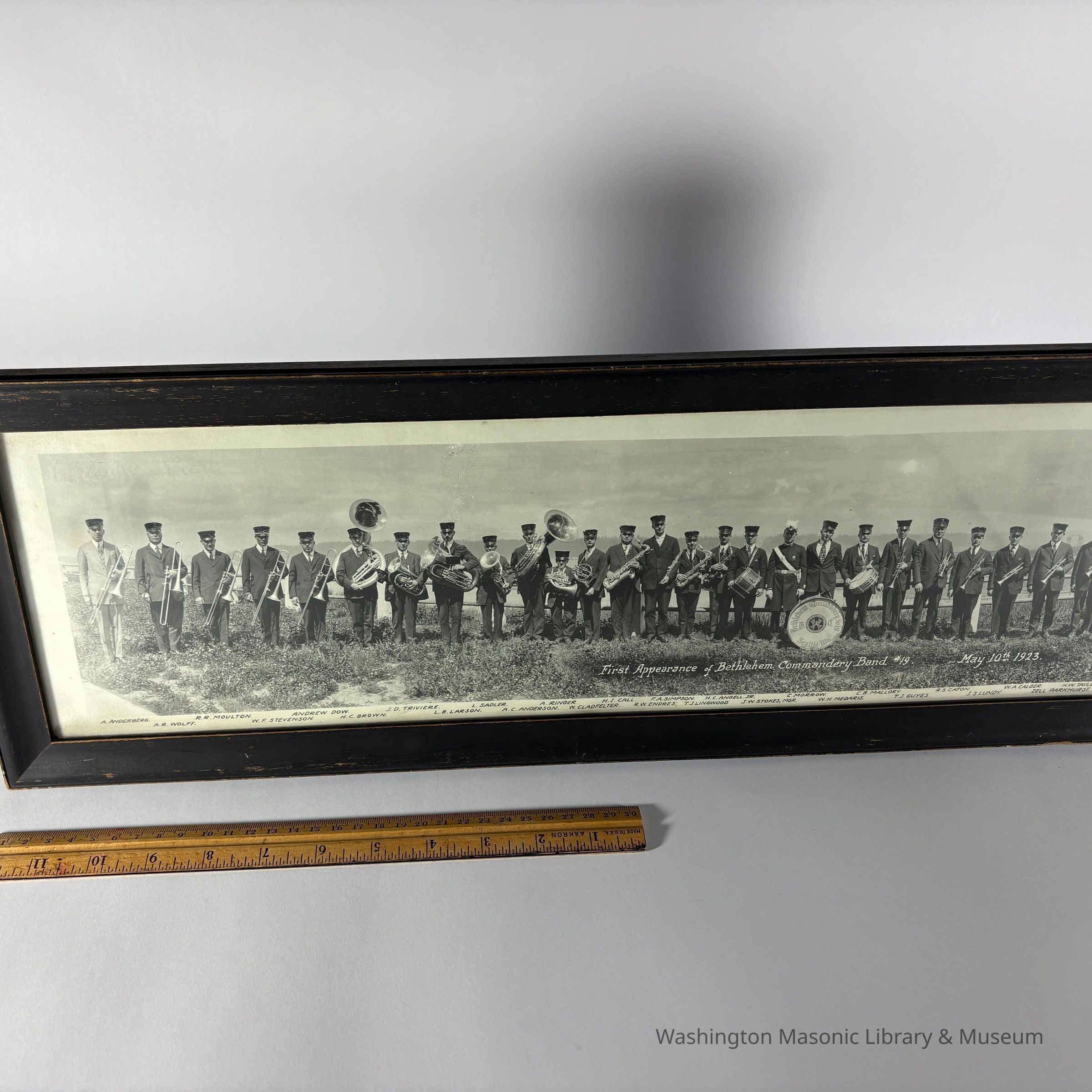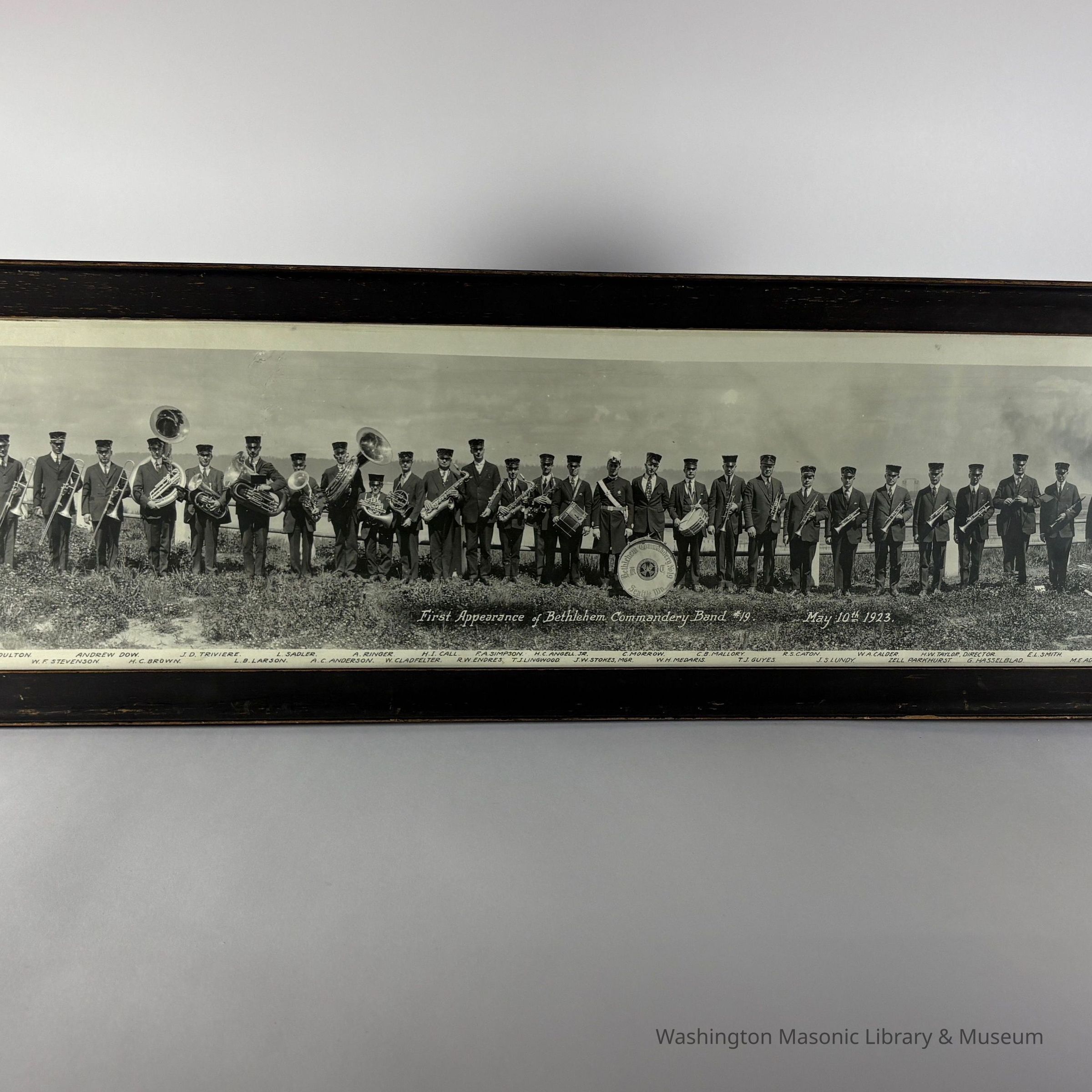 Panorama: In black wooden frame. Knights Templar Band posing in line. Names listed below each man. "First Appearance of Bethlehem Commandery Band #19, May 10, 1923".Collection