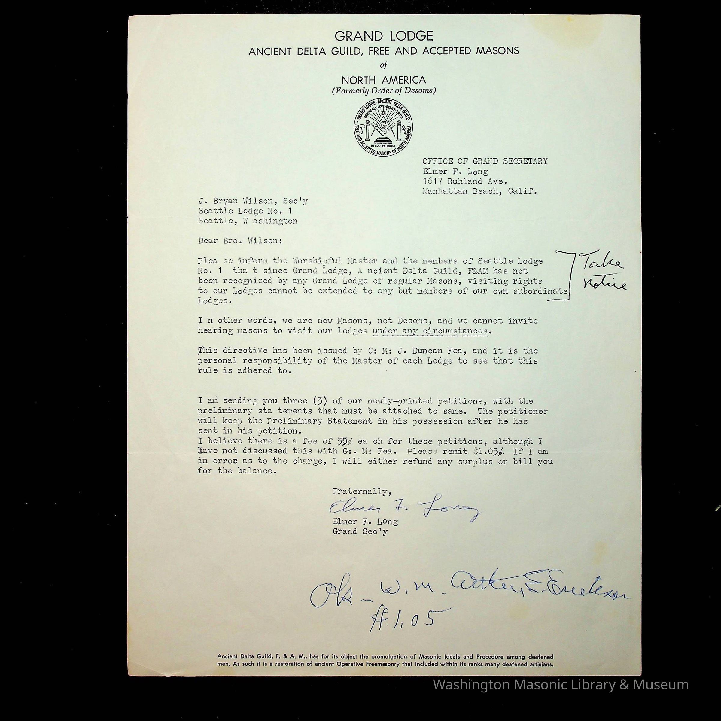 b) Letter to J. Bryan Wilson from Office of Grand Secretary, CA (undated)